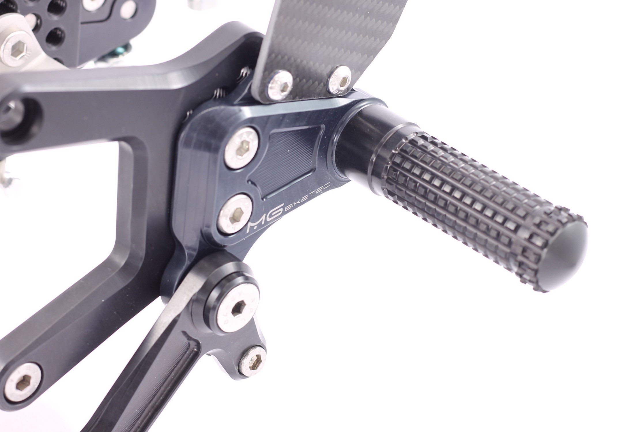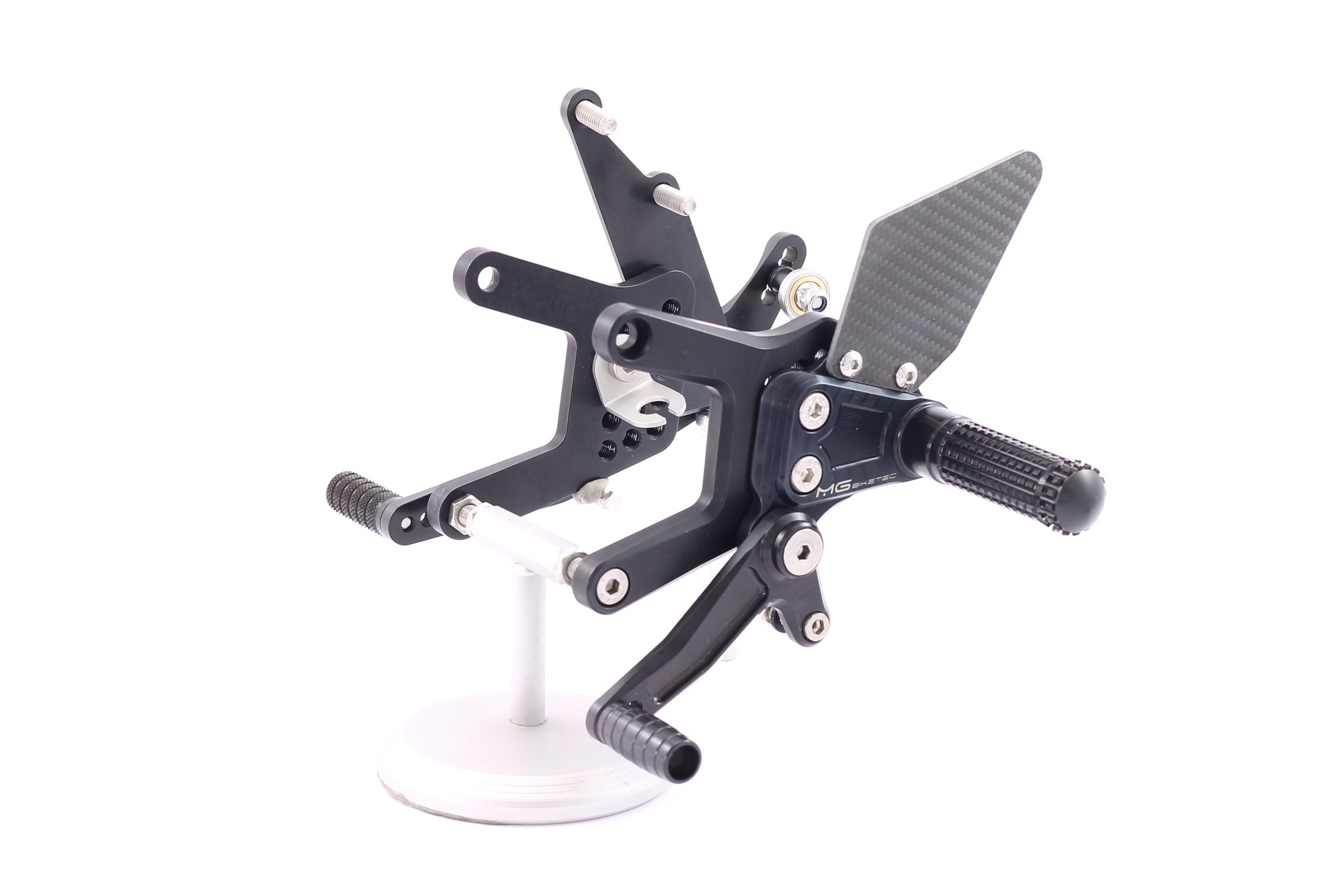 Die Fersenrasten lassen sich in 9 Positionen anpassen, während Brems- und Schaltrasten zweifach (10 mm) verstellbar sind. Die Anlage verfügt über einen Halter für den Bremslichtschalter, ist komplett schwarz eloxiert, trägt ein lasergraviertes MG Biketec Logo und wird mit hochwertigen Carbon-Fersenschützern geliefert. Die hohe Steifigkeit, perfekte Ergonomie sowie die Verwendung von Edelstahlschrauben unterstreichen ihre Langlebigkeit. Jede Anlage wird in Österreich entwickelt, gefertigt und durch eine TÜV Austria geprüfte ABE für Deutschland ausgeliefert.