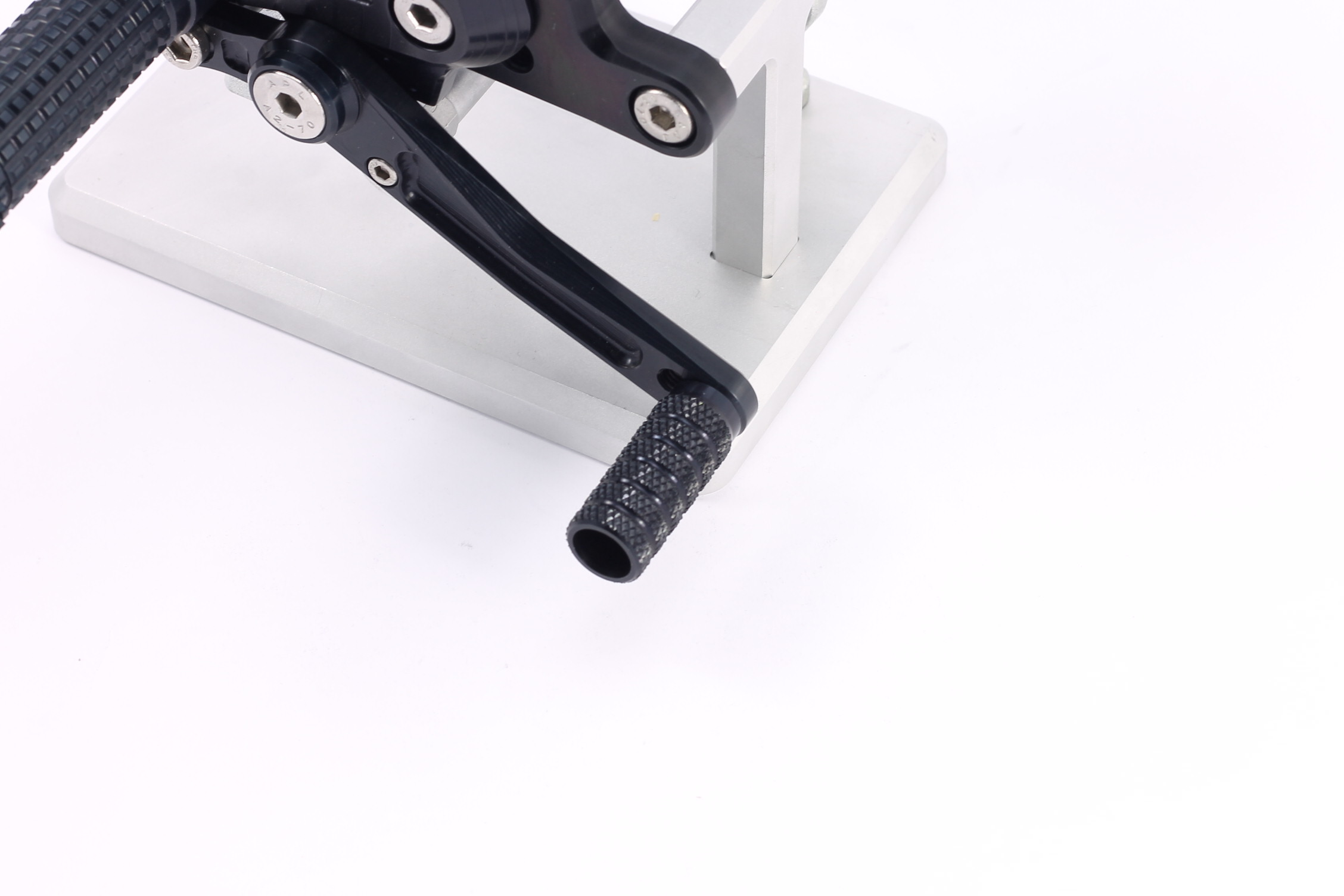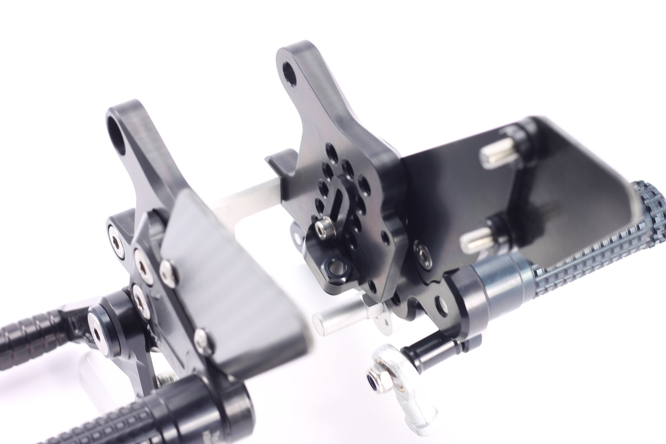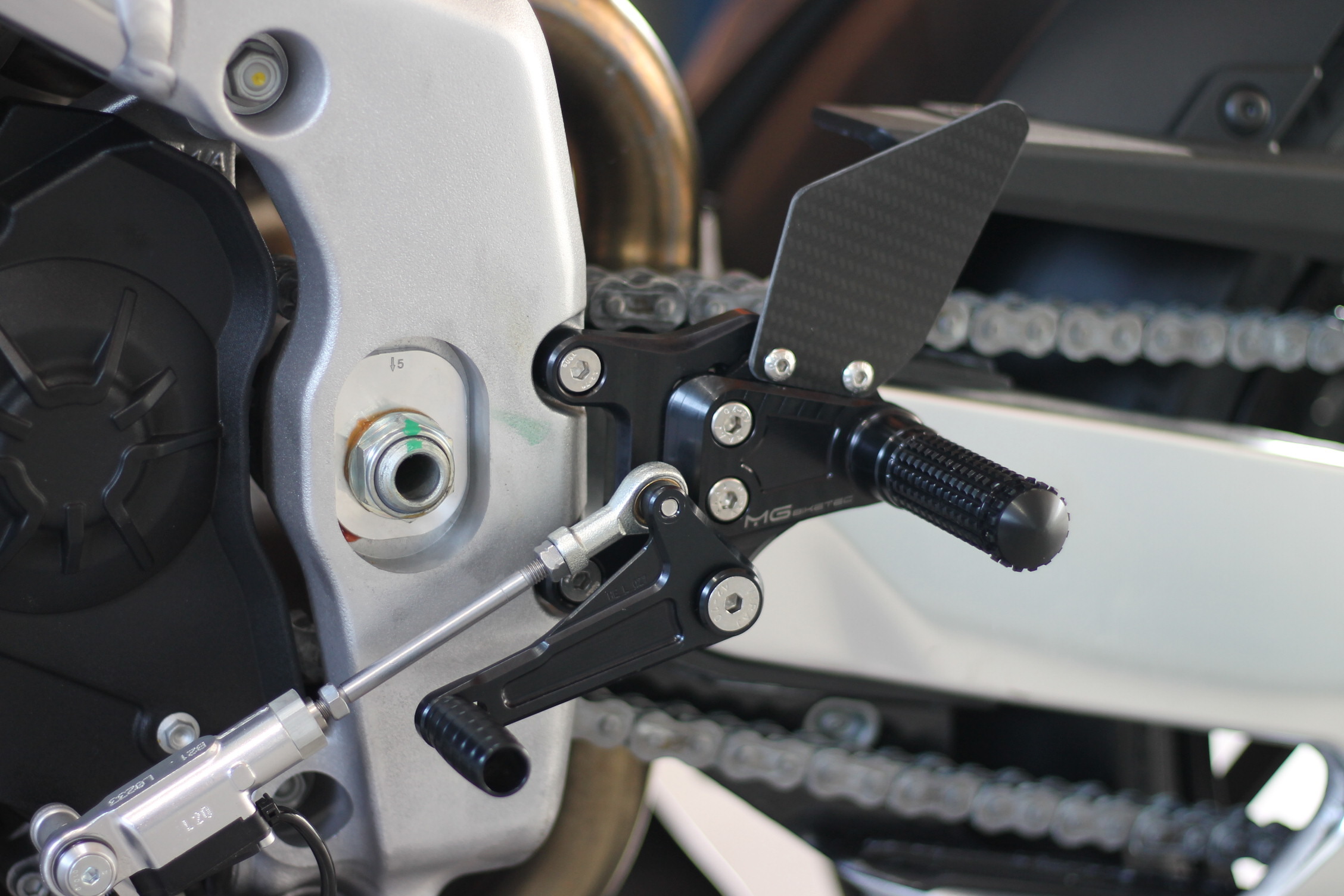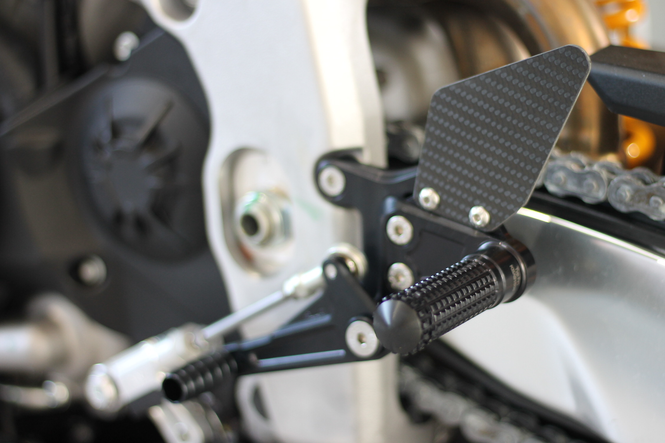 Dank doppelt kugelgelagerter, spielfreier Schalt- und Bremshebel ist die Anlage sowohl für Normal- als auch für GP‑Schaltung nutzbar. Der integrierte Halter für den Bremslichtschalter sowie die mit Carbon‑Fersenschützern ausgestattete, schwarz eloxierte Oberfläche sorgen für maximale Funktionalität und sportliches Design. Alle Komponenten sind TÜV geprüft; eine ABE liegt jeder Anlage bei.