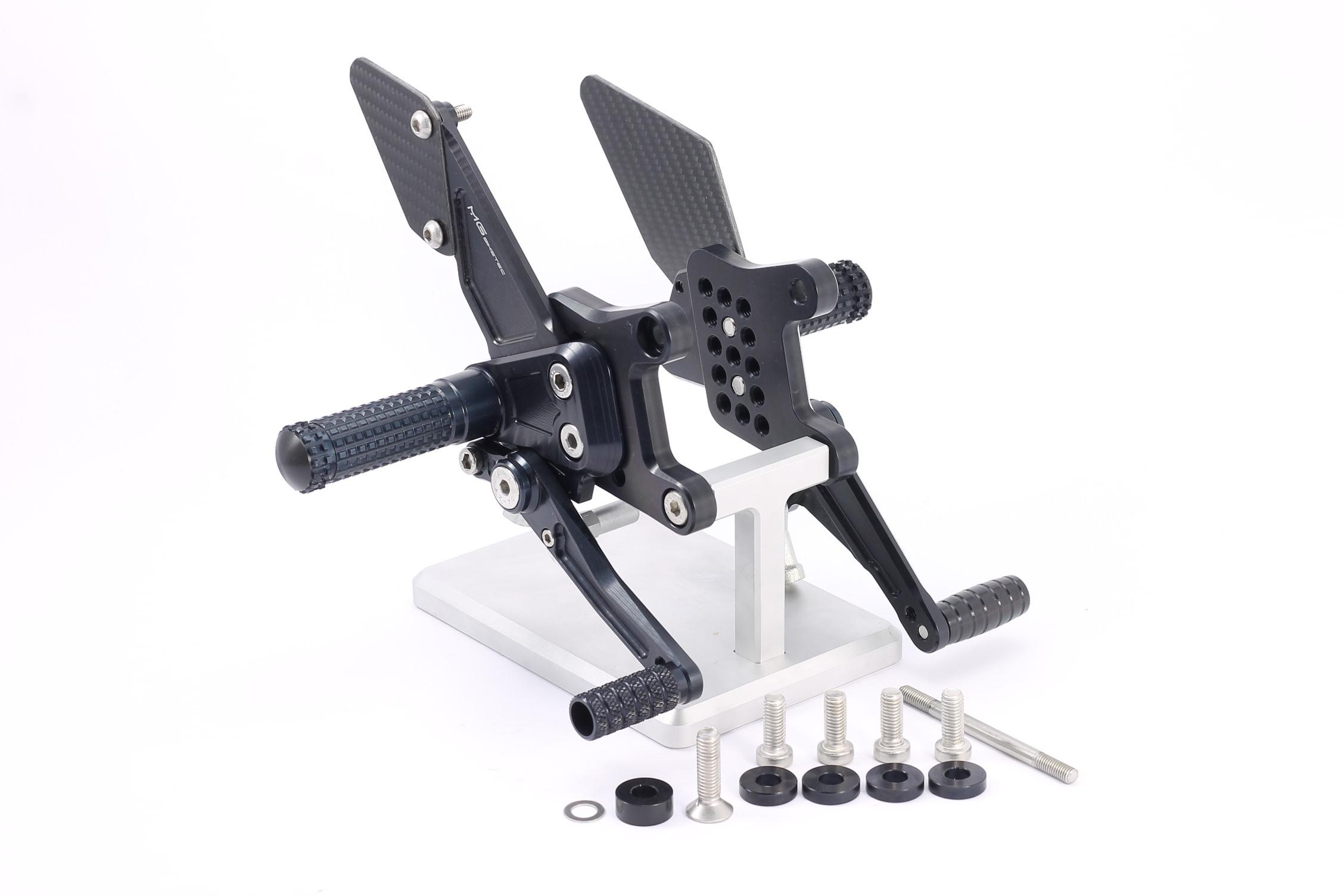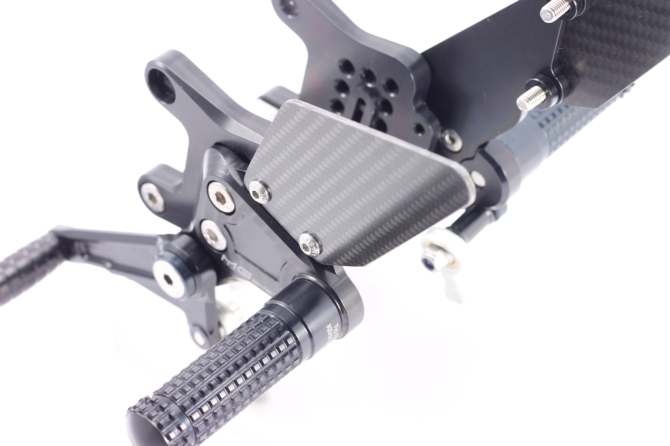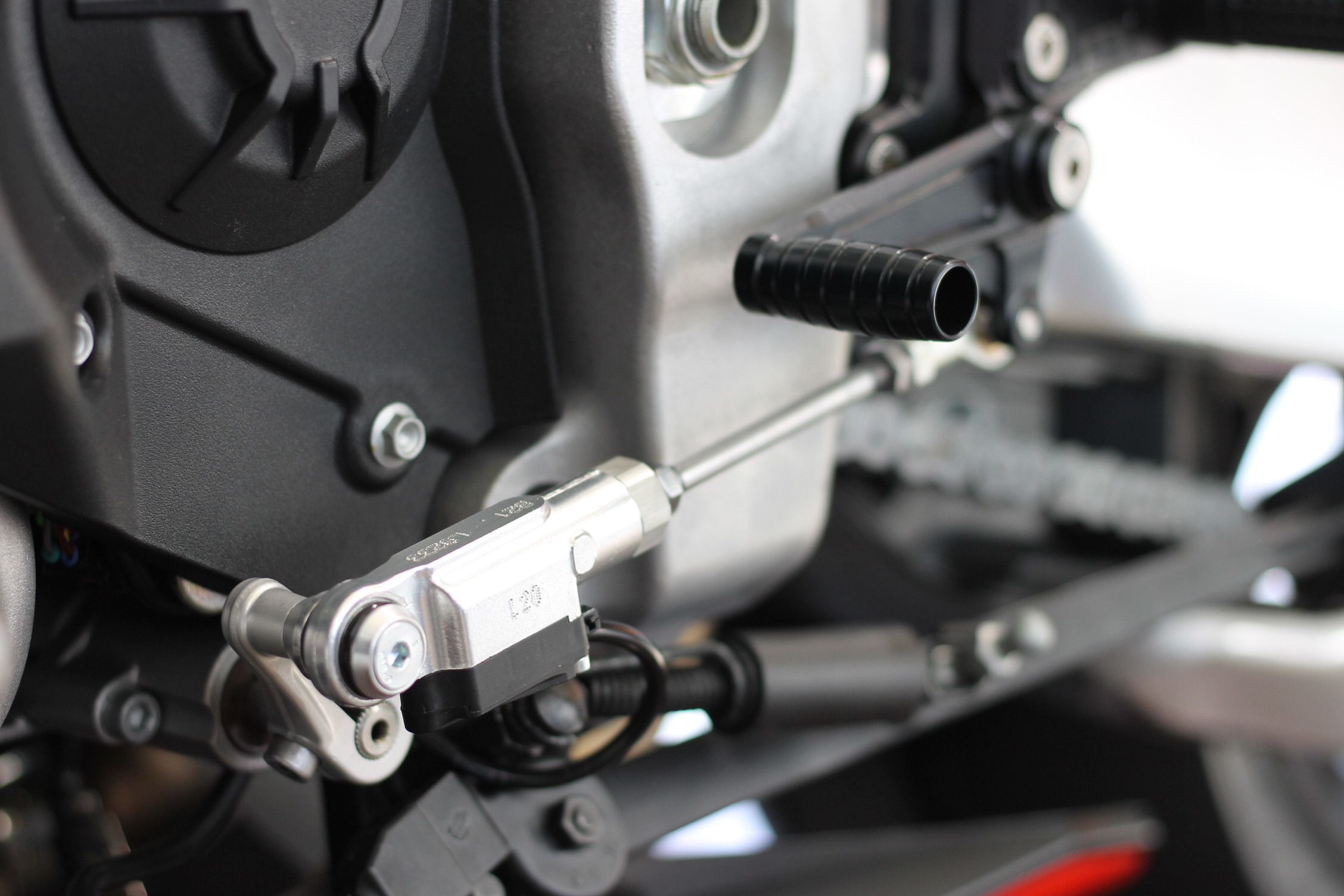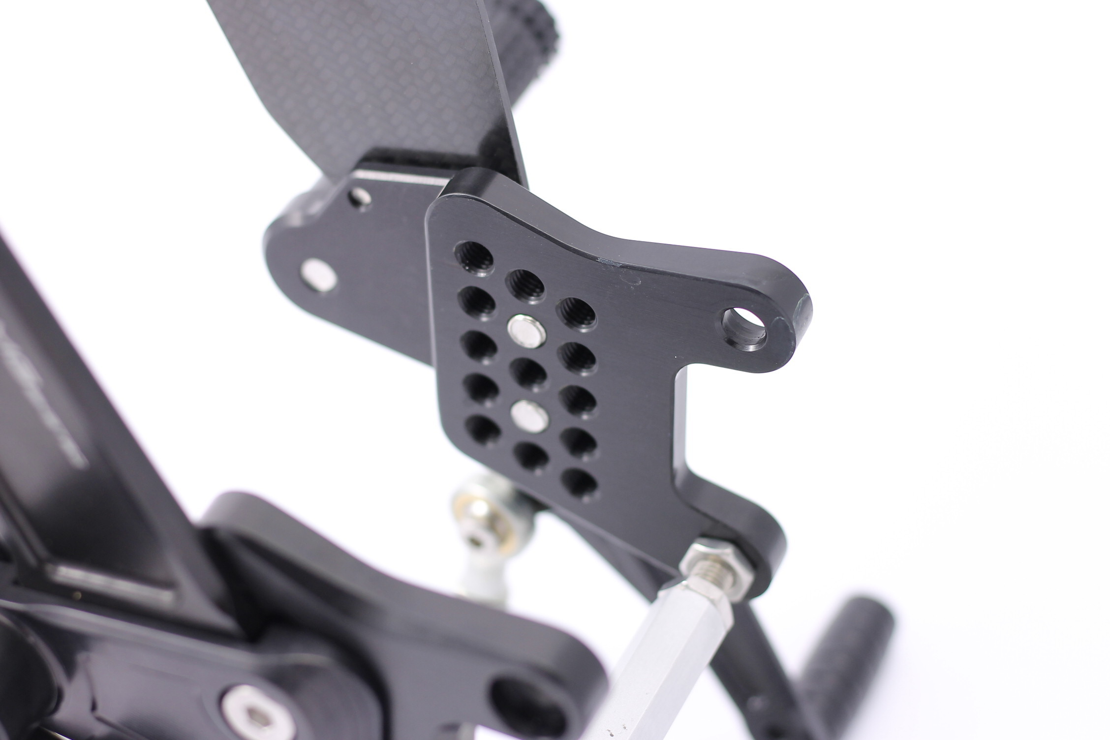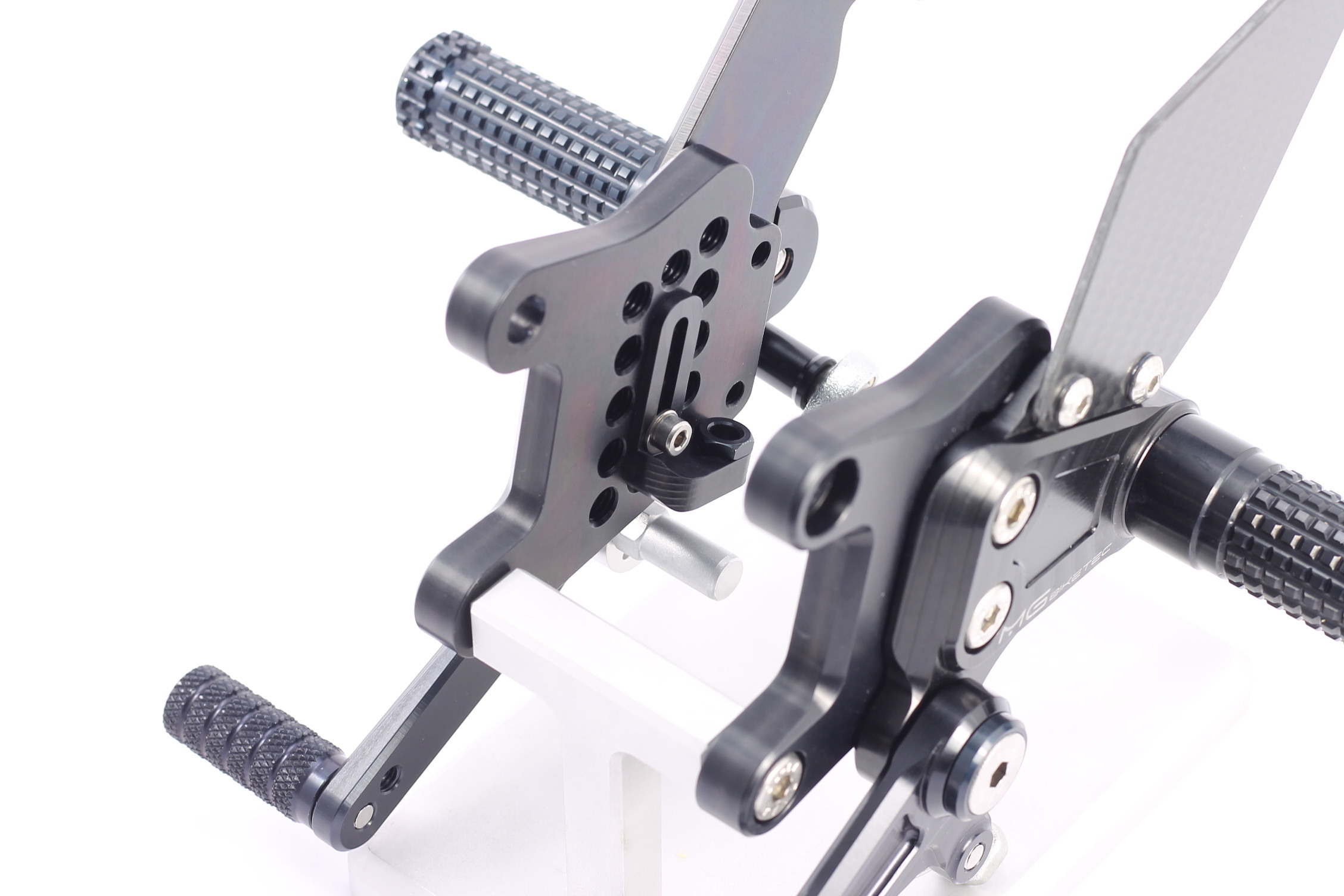 Dank doppelt kugelgelagerter, spielfreier Schalt- und Bremshebel ist die Anlage sowohl für Normal- als auch für GP‑Schaltung nutzbar. Der integrierte Halter für den Bremslichtschalter sowie die mit Carbon‑Fersenschützern ausgestattete, schwarz eloxierte Oberfläche sorgen für maximale Funktionalität und sportliches Design. Alle Komponenten sind TÜV geprüft; eine ABE liegt jeder Anlage bei.
