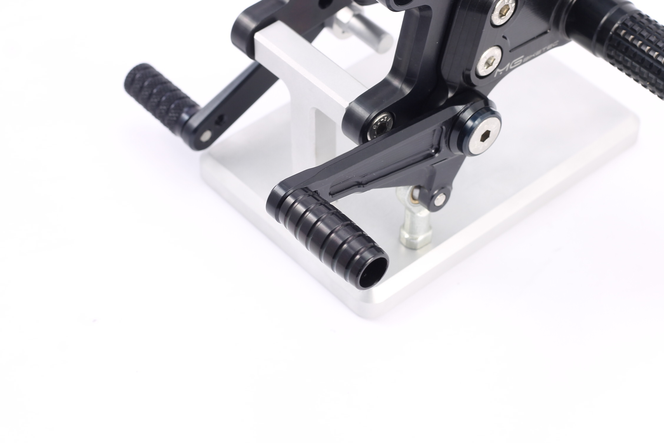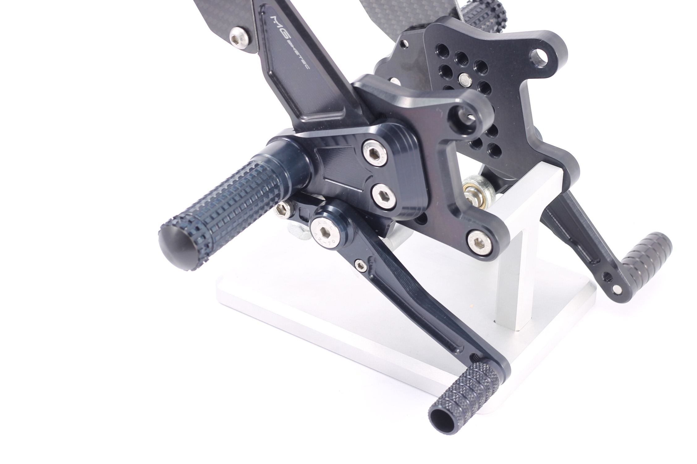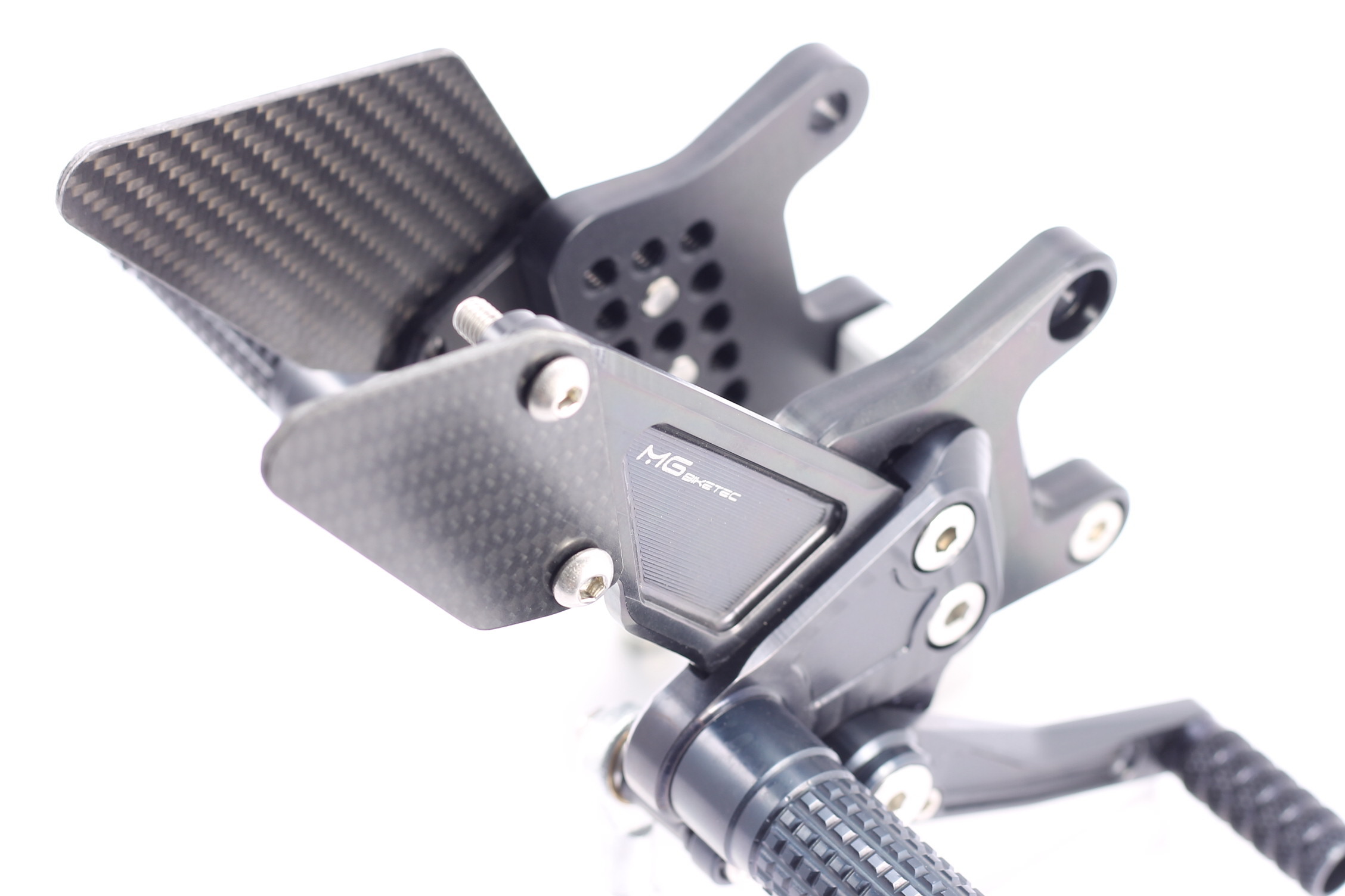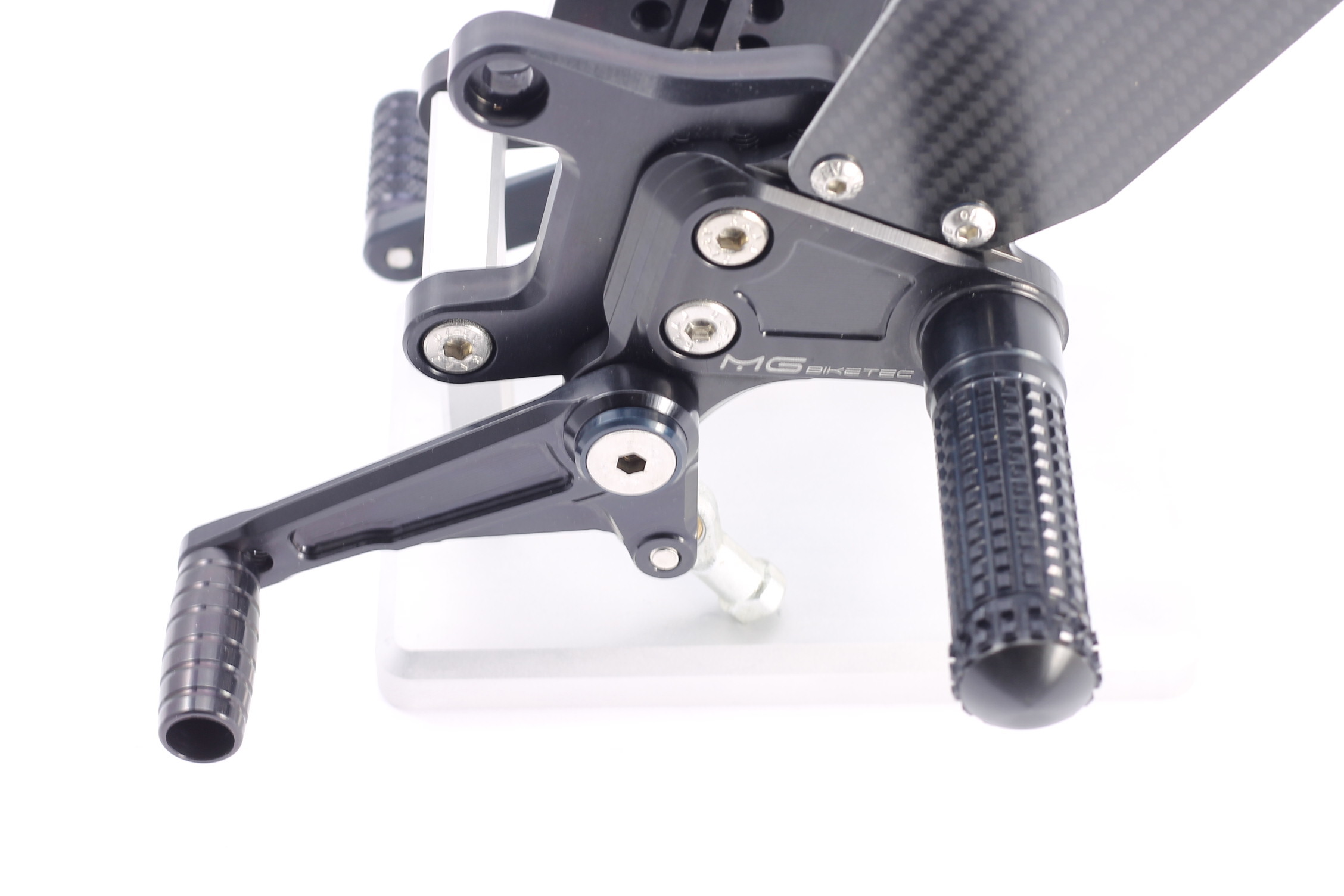 Die MG Biketec Sportfussrastenanlage ist eine hochwertige, rennsporterprobte Lösung für anspruchsvolle Fahrerinnen und Fahrer, die höchste Präzision und individuelle Ergonomie suchen. Diese Fußrastenanlage ist voll verstellbar in 9 Positionen, mit bis zu 22 mm Höhen- und 20 mm Längenverstellung, und ermöglicht die exakte Anpassung an Ihre Fahrposition. Sie besteht aus CNC‑gefrästem, hitzebehandeltem 7075‑ und 6082‑Aluminium, das hohe Steifigkeit bei minimalem Gewicht garantiert.