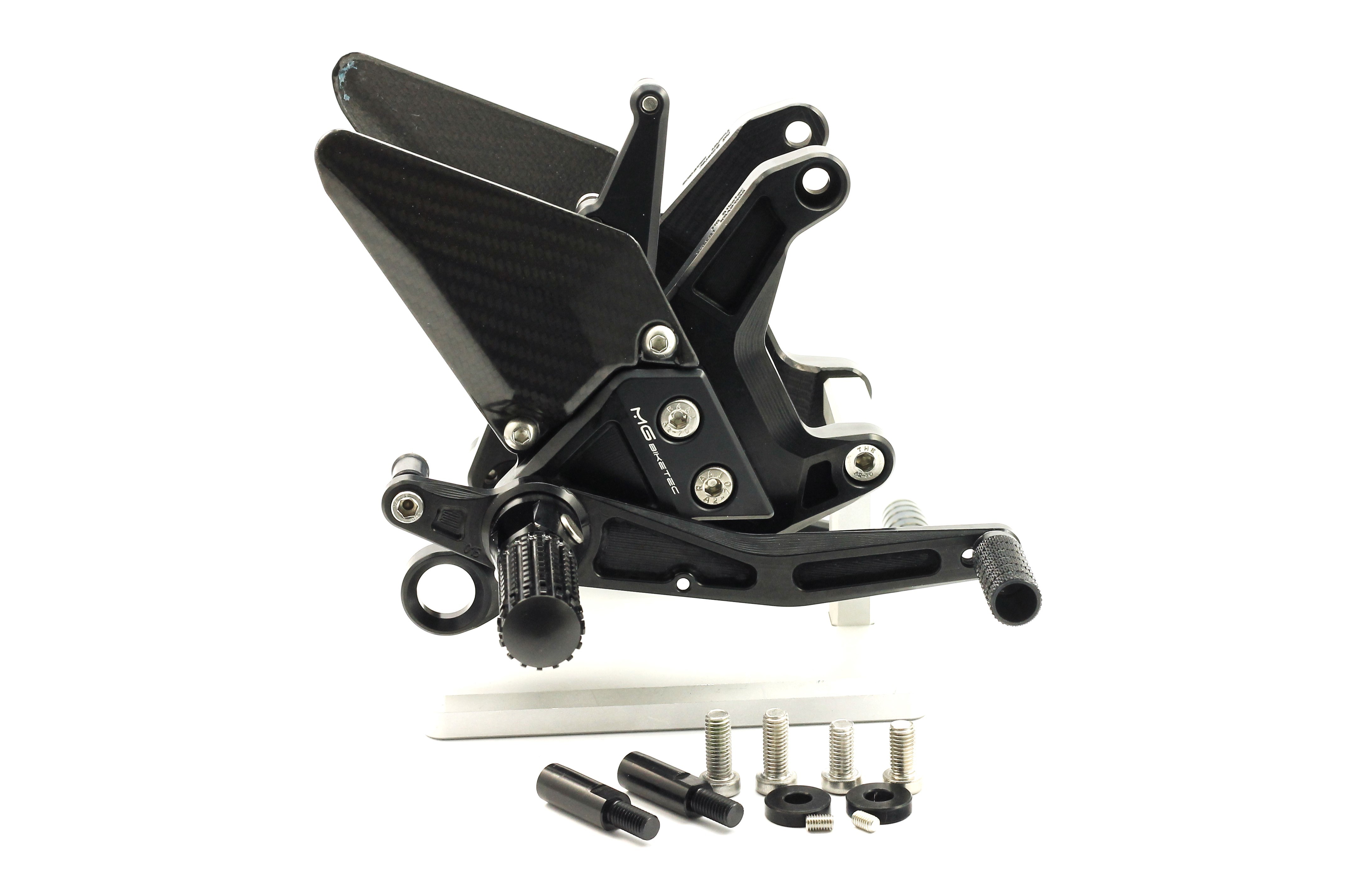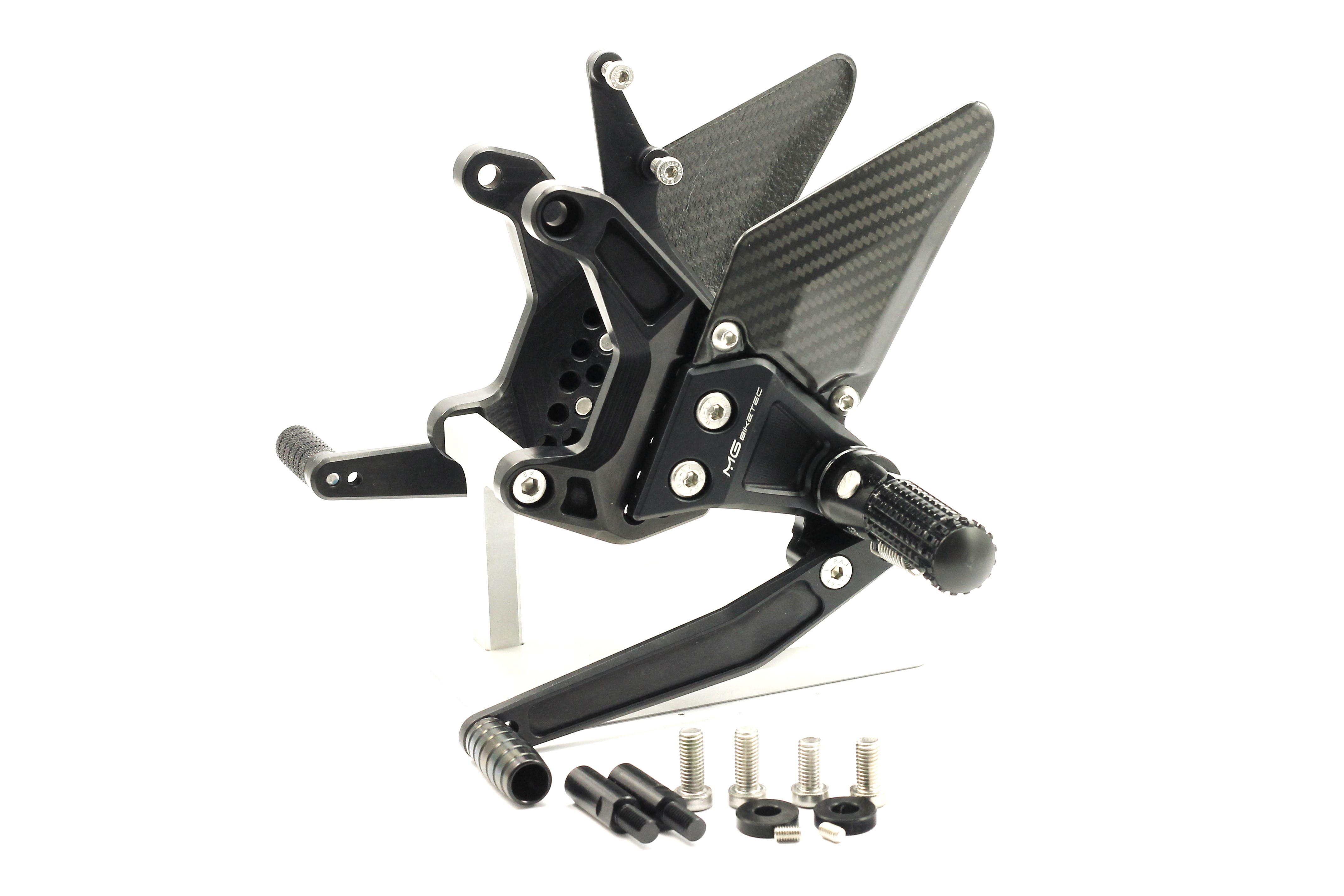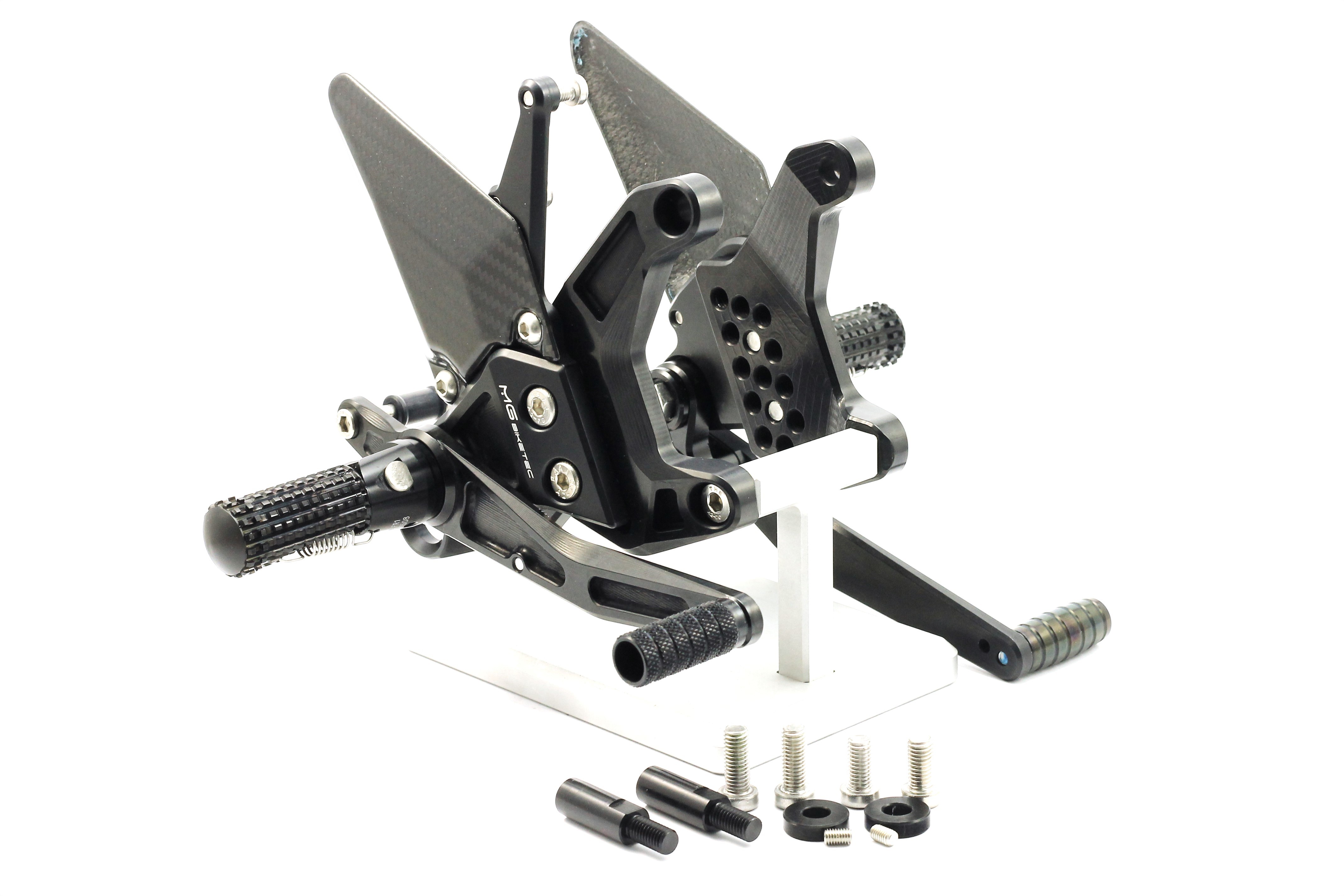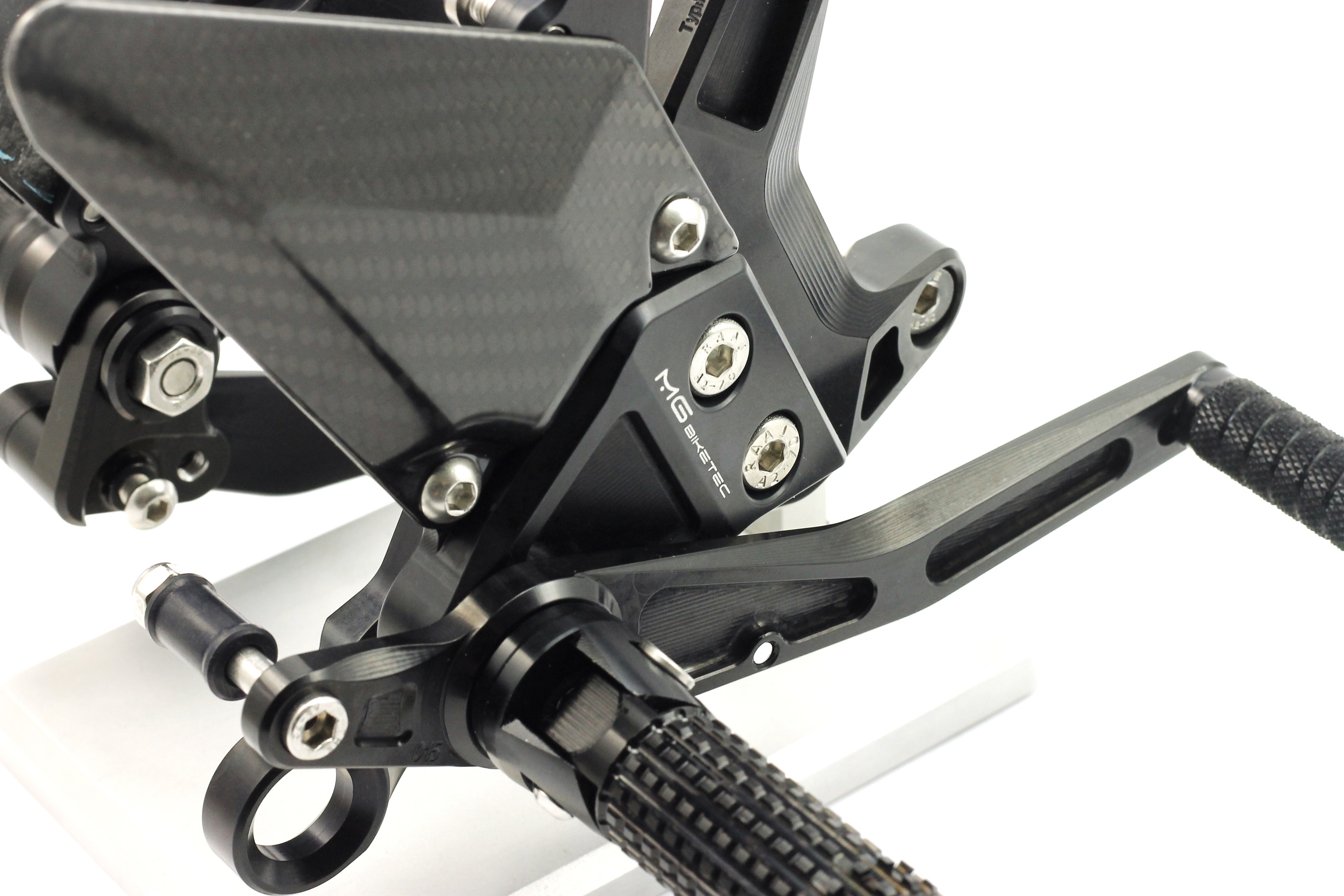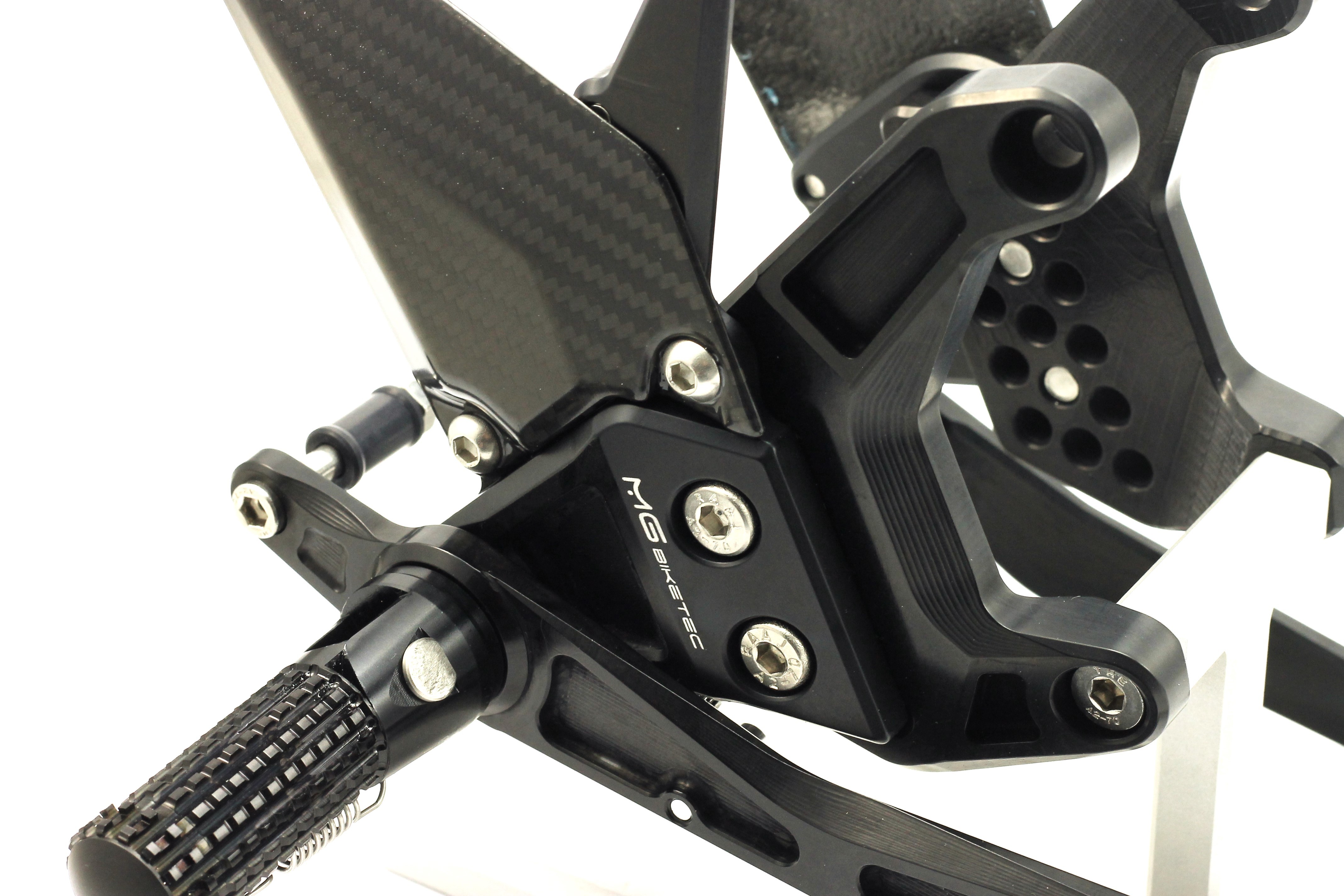 Die Anlage ist mit einem Halter für den Bremslichtschalter sowie einem geformten Carbon-Fersenschützer ausgestattet. Alle Hauptkomponenten sind schwarz eloxiert, während die Trägerplatten wahlweise in Schwarz oder Orange erhältlich sind. Mit lasergraviertem MG Biketec Logo, Edelstahlverschraubungen und klappbaren Fußrasten vereint diese Rastenanlage ein sportliches Design mit Funktionalität. Alternativ kann der Umbau auf starre Rasten erfolgen – ideal für den Einsatz auf der Rennstrecke. Eine TÜV Austria geprüfte und KBA Deutschland ausgestellte ABE ist enthalten.