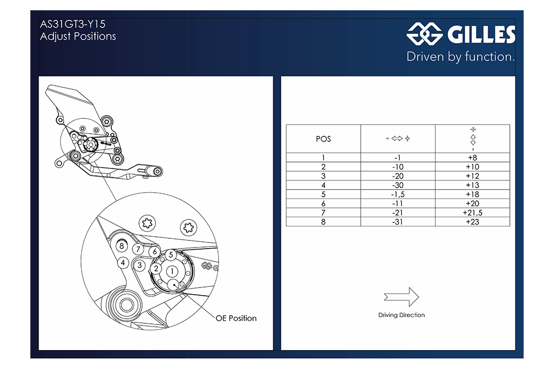 Die GILLES AS31GT3 Fußrastenanlage passt für Yamaha MT-09 RN69 und XSR900 RN80 und steht für höchste Präzision, Funktionalität und Design im Motorrad-Tuning. Dank ihrer multivariablen Konstruktion ermöglicht sie individuelle Anpassungen in Position, Schaltweg und Trittlänge. Die aus hochfestem Aluminium 7075 gefertigte Anlage bietet mit ihren Ausfräsungen ein ultraleichtes Gewicht und gleichzeitig maximale Stabilität. Sowohl der Schalt- als auch der Bremshebel sind doppelt kugelgelagert und gewährleisten ein spielfreies, präzises Fahrgefühl. Darüber hinaus verfügt die AS31GT3 über beidseitigen Alufersenschutz und erlaubt wahlweise Normal- oder Umkehrschaltung. Die schwarze Eloxal-Oberfläche sorgt für eine edle Optik und langlebigen Korrosionsschutz. Dank TÜV-Teilegutachten ist die Anlage auch im Straßenverkehr zugelassen.