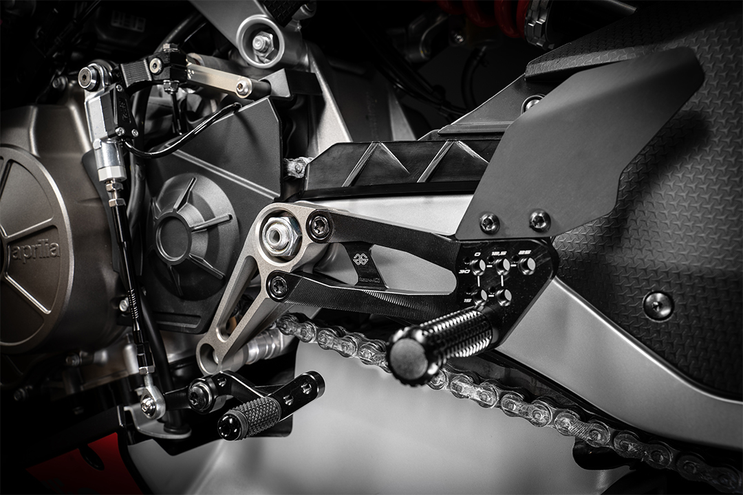 Eine Umkehrschaltung ist möglich, ohne dass eine Neuprogrammierung des Quick Shifters nötig ist. Die beidseitigen Aluminium-Fersenschützer sorgen für zusätzliche Sicherheit und Stabilität. Der zweiteilige Aufbau der Grundplatte erlaubt einen Austausch, ohne die Schwingenachse zu demontieren. Damit ist die Fußrastenanlage nicht nur technisch durchdacht, sondern auch wartungsfreundlich und perfekt für den professionellen Rennstreckeneinsatz geeignet.