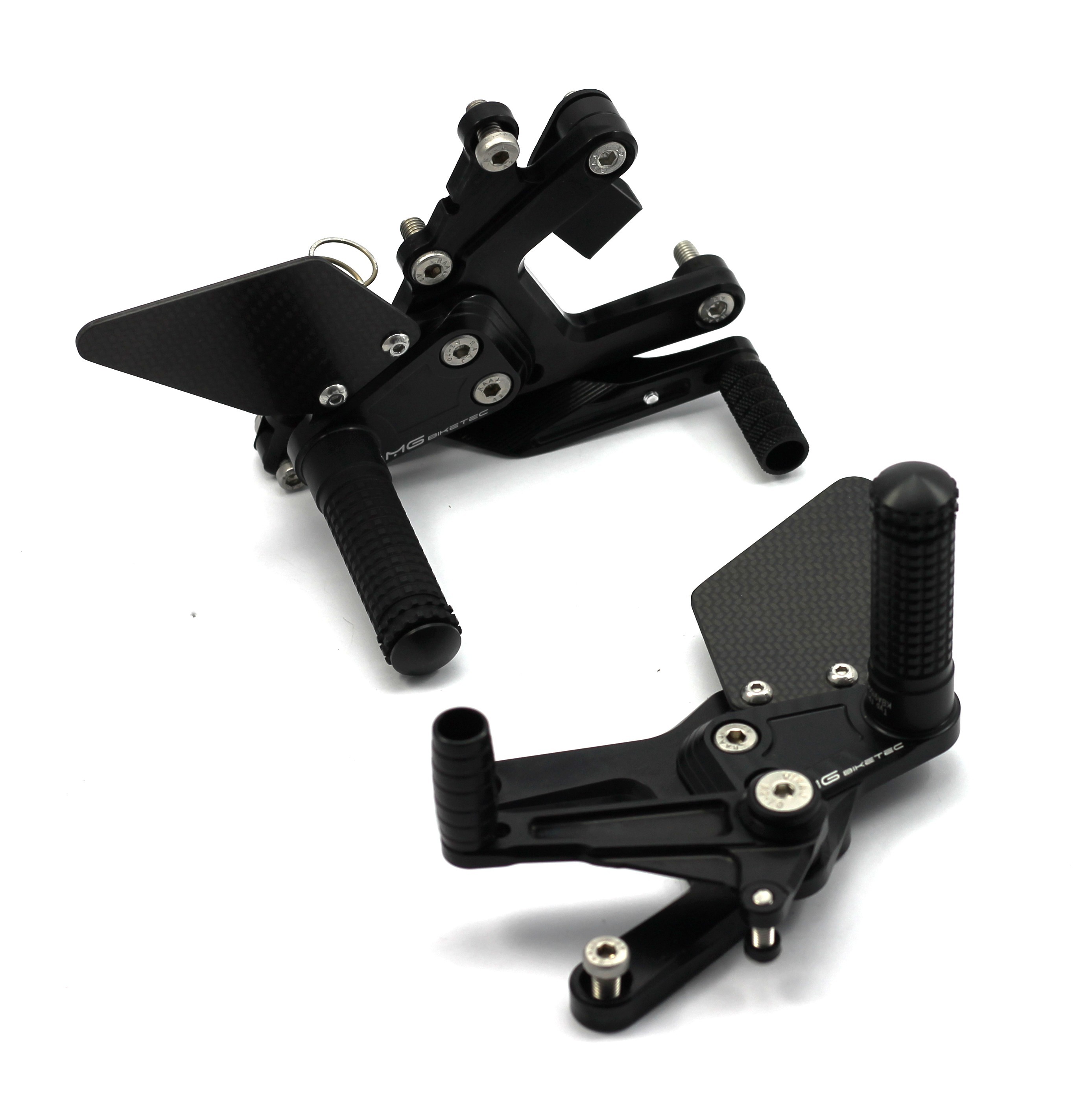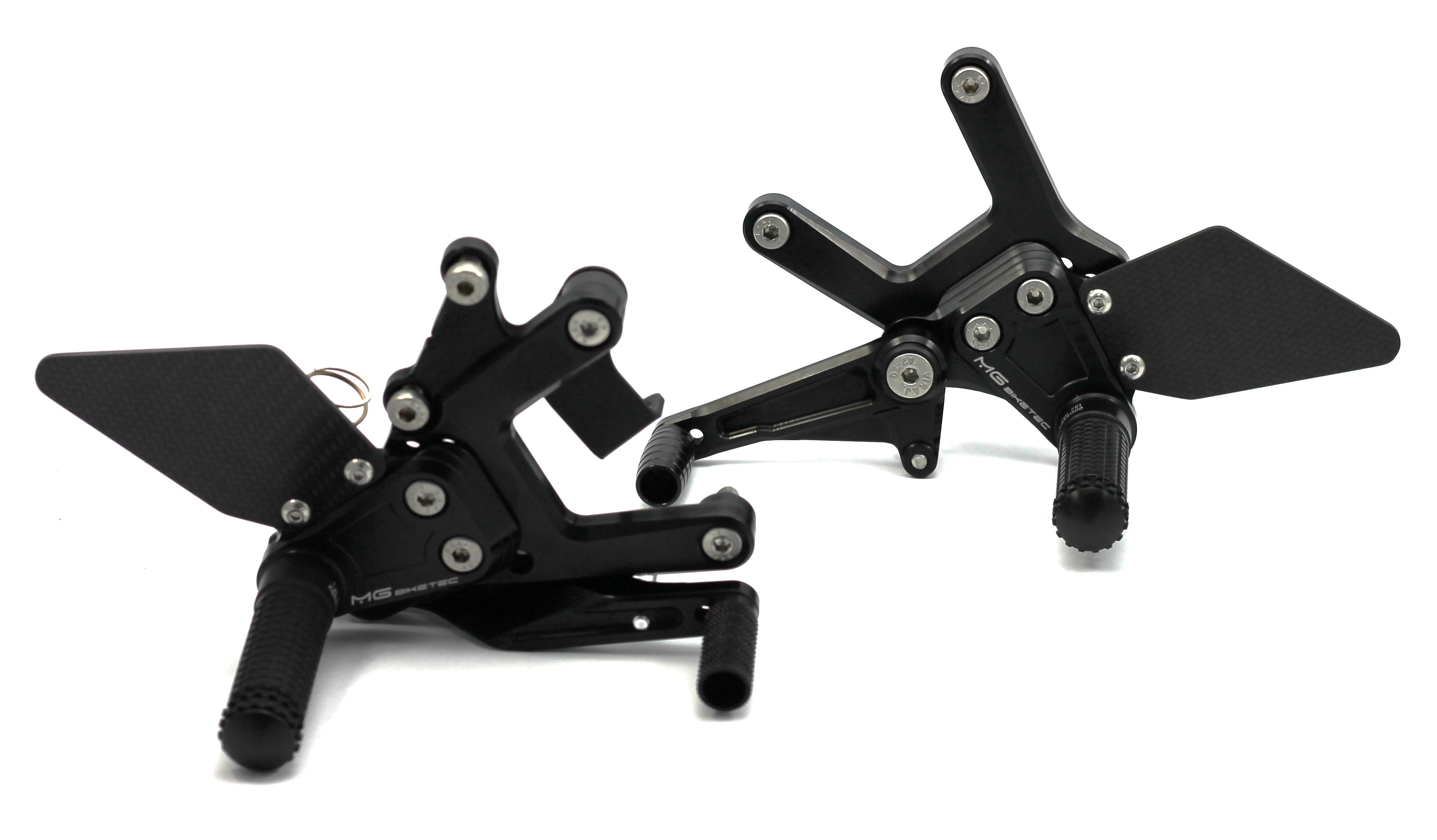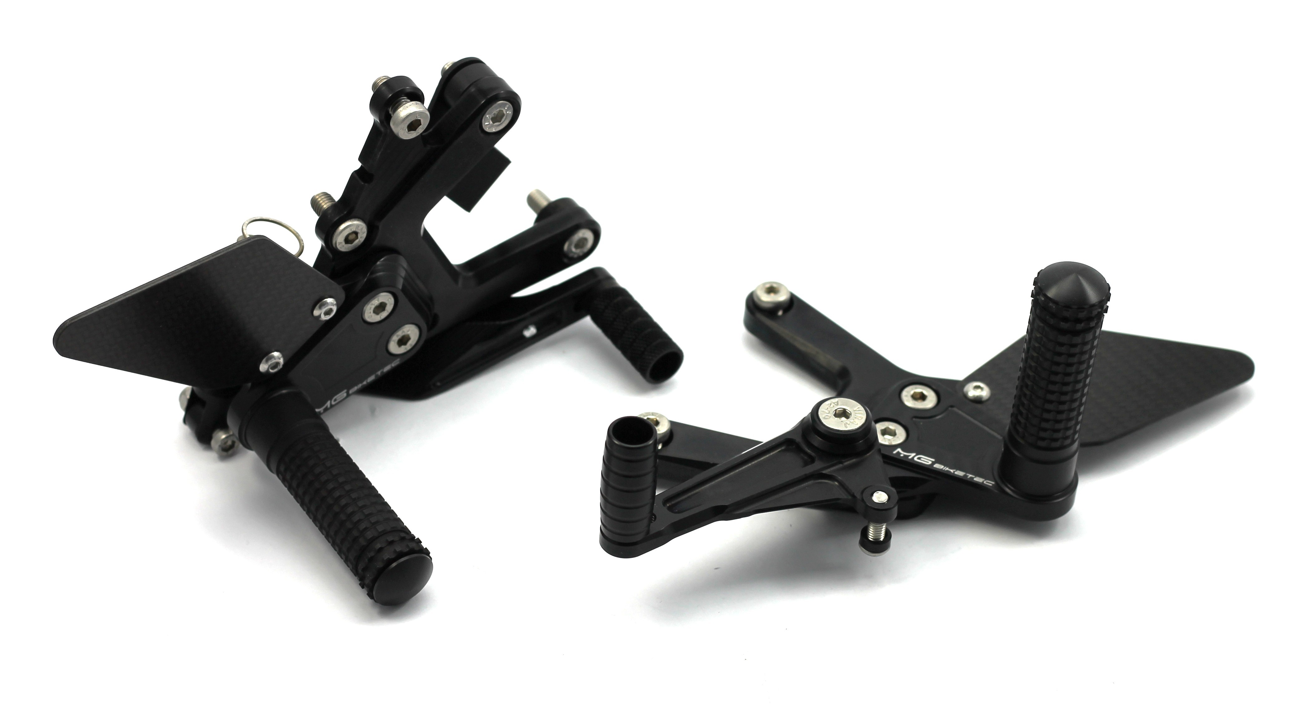 Die MG Biketec Sport-Fußrastenanlage ist eine rennsporterprobte, CNC-gefräste Lösung aus hochfestem 7075 Aluminium und bietet eine perfekte Kombination aus Leichtigkeit, Stabilität und Ergonomie. Sie ist voll einstellbar mit bis zu 9 Positionen und bis zu 20 mm Verstellbereich. Die spielfreien Schalt- und Bremshebel sind doppelt kugelgelagert und ermöglichen die Nutzung als Normal- oder Umkehrschaltung (GP-Schaltung). Carbon-Fersenschützer und schwarz eloxierte Oberflächen unterstreichen das sportliche Design. Die Fußrasten sind klappbar und lassen sich mittels Wurmschrauben für die Rennstrecke auf starre Rasten umbauen. Dank TÜV geprüfter ABE ist die Anlage legal für den Straßenverkehr in D, A und CH einsetzbar.