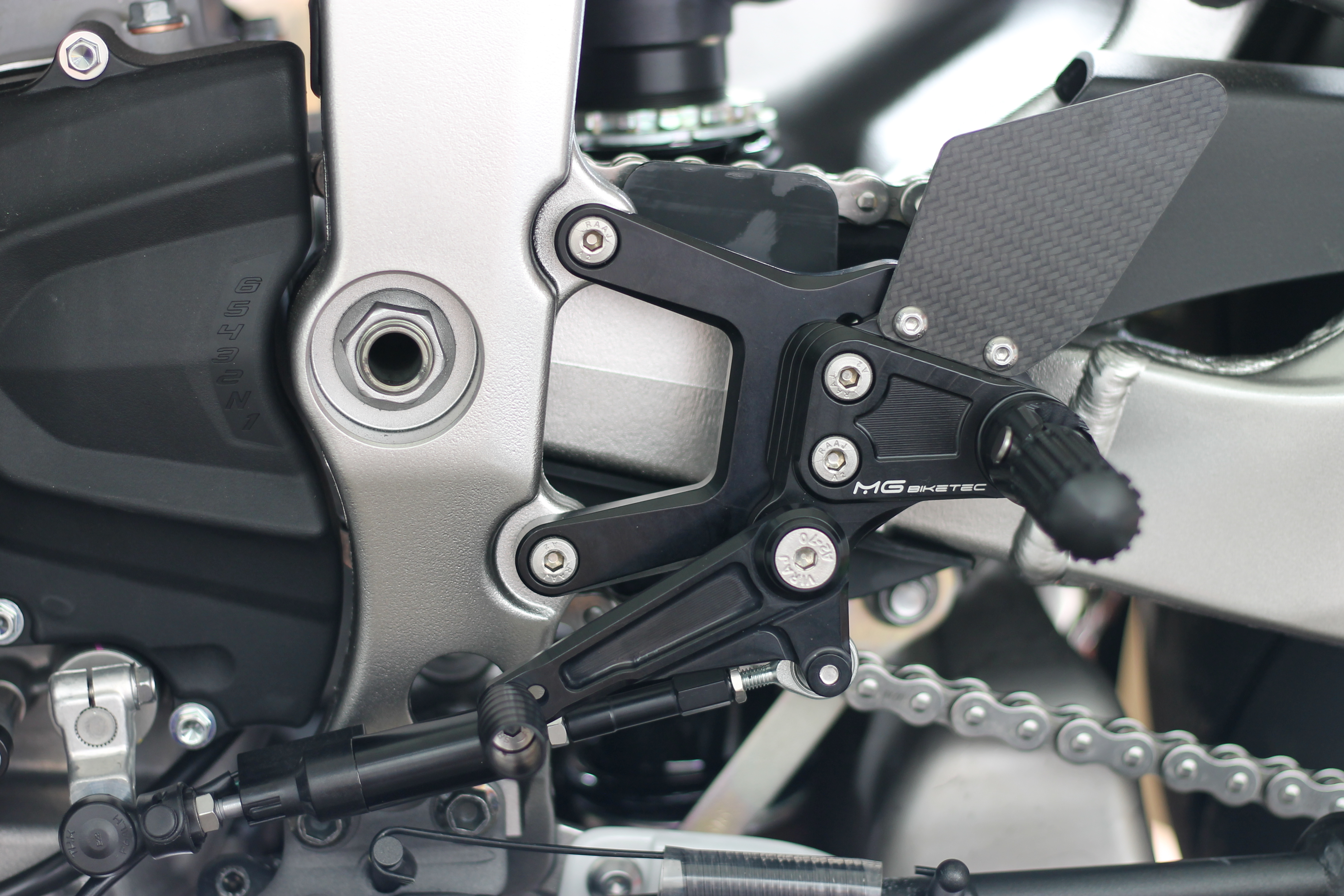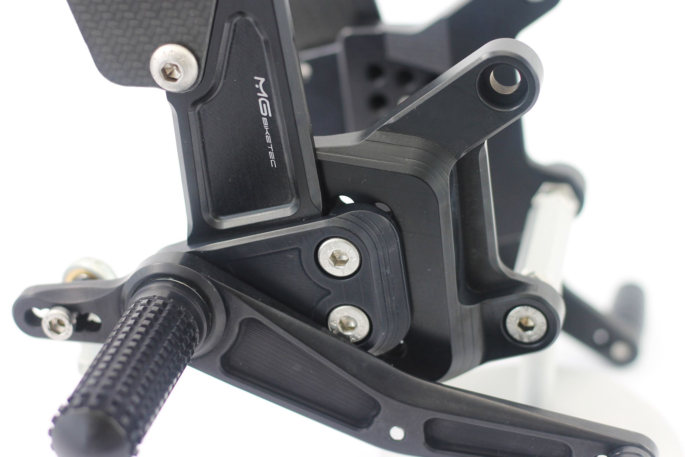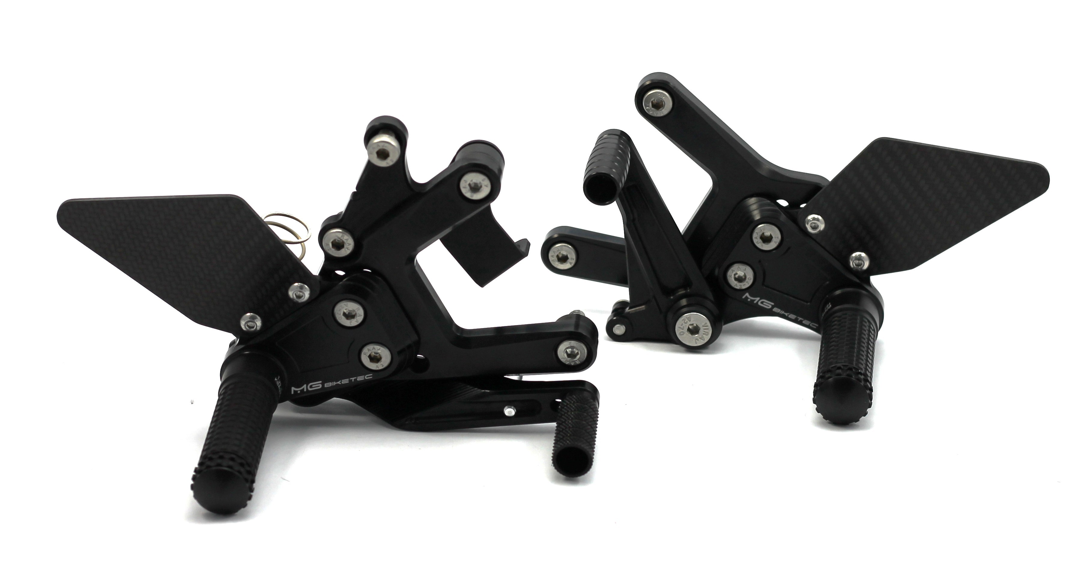 Die MG Biketec Sport-Fußrastenanlage ist eine rennsporterprobte, CNC-gefräste Lösung aus hochfestem 7075 Aluminium und bietet eine perfekte Kombination aus Leichtigkeit, Stabilität und Ergonomie. Sie ist voll einstellbar mit bis zu 9 Positionen und bis zu 20 mm Verstellbereich. Die spielfreien Schalt- und Bremshebel sind doppelt kugelgelagert und ermöglichen die Nutzung als Normal- oder Umkehrschaltung (GP-Schaltung). Carbon-Fersenschützer und schwarz eloxierte Oberflächen unterstreichen das sportliche Design. Die Fußrasten sind klappbar und lassen sich mittels Wurmschrauben für die Rennstrecke auf starre Rasten umbauen. Dank TÜV geprüfter ABE ist die Anlage legal für den Straßenverkehr in D, A und CH einsetzbar.