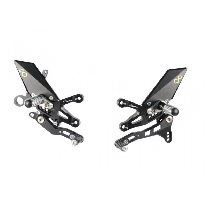 Die Lightech Fußrastenanlage ist ein hochwertiges Track-System®-Produkt, entwickelt für anspruchsvolle Fahrer im Straßen- und Rennbetrieb. Gefertigt aus CNC-gefrästem ERGAL 7075 überzeugt sie durch ihr ultraleichtes Gewicht, präzise Einstellbarkeit und maximale Stabilität. Die Fußrasten lassen sich unkompliziert in 10-mm-Schritten verstellen, wodurch sich individuelle Schalt- und Bremspunkte optimal justieren lassen. Für beste Performance sorgen kugelgelagerte Hebel, ein beidseitiger Fersenschutz und das harteloxierte, schwarze Finish im typischen Lightech Design. Die Anlage ist mit ABE versehen, ein Eintrag beim TÜV ist daher nicht erforderlich.