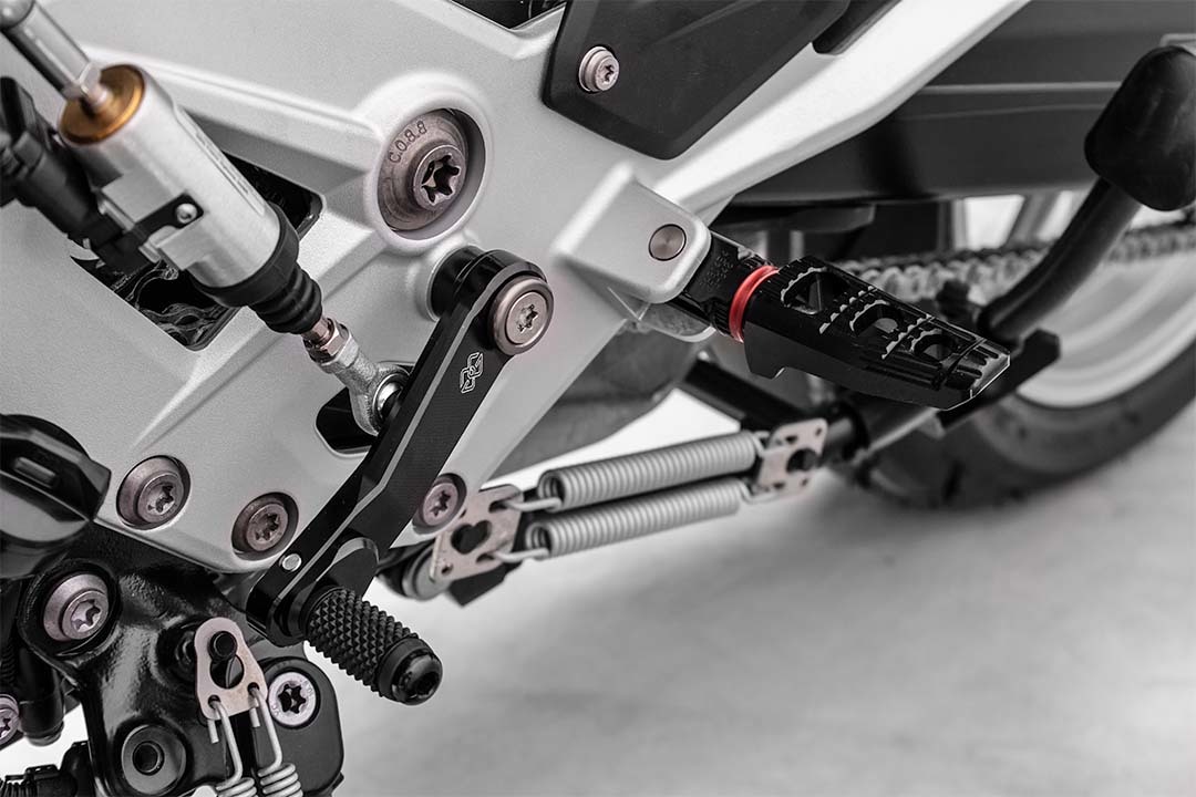 Die spielfreie Lagerung durch hochwertige Kugellager sorgt für ein exaktes Schaltgefühl, während das gummierte Trittstück zusätzlichen Halt bietet. CNC-gefräste Aluminiumbauteile mit harter Anodisierung garantieren Langlebigkeit und beständige Optik. Durch die edle schwarz-graue Farbgebung fügt sich das Set harmonisch in das Gesamtbild des Motorrads ein und unterstreicht den sportlichen Charakter Ihres Bikes.