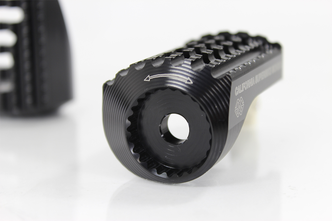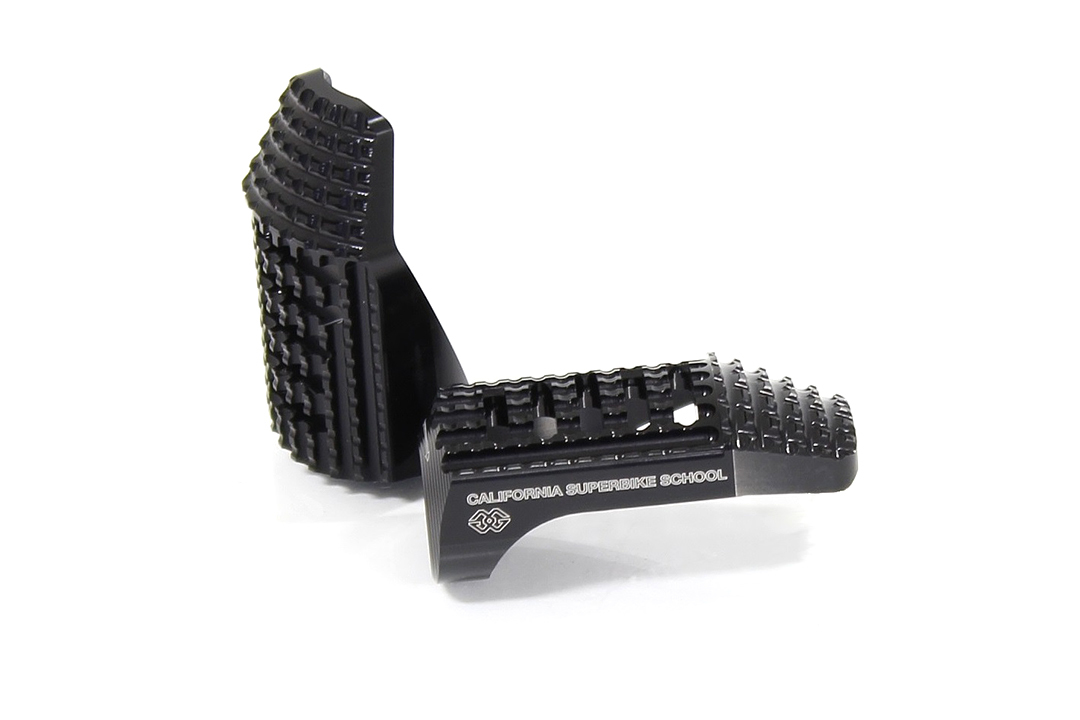 Die einzigartige Form der Gilles California Rasten entstand aus der jahrelangen Erfahrung im professionellen Rennsportumfeld. Dank der abgeschrägten Außenkanten bietet die Raste bei Kurvenfahrten und Hanging-Off-Techniken erstklassigen Halt und mehr Sicherheit in extremen Schräglagen. Die Oberseite mit größerer Rundung stellt mehr Kontaktfläche für die Fußsohle her, was die Kontrolle beim Fahren nochmals erhöht.