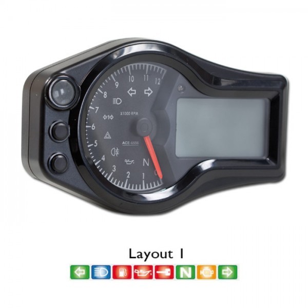 Das Acewell ACE-6554 Digitalinstrument ist ein hochwertiges multifunktionelles Cockpit für Motorräder und Quads. Es vereint zahlreiche Funktionen in einem kompakten, robusten Design und bietet Ihnen präzise Informationen während der Fahrt. Mit analogem Drehzahlmesser, digitaler Geschwindigkeitsanzeige, Temperatur- und Tankanzeige sowie Ganganzeige behalten Sie stets den Überblick. Zusätzlich können Sie individuelle Messwerte wie Temperatur, Spannung oder Kilometerstände anzeigen lassen. Der integrierte Laptimer mit Speicher für 99 Rundenzeiten, eine frei konfigurierbare Schaltblitzanzeige und die einstellbare Display-Scrollzeit runden den Funktionsumfang ab. Das Instrument ist E-zertifiziert, wasserresistent nach IP67 und vibrations- sowie stoßfest getestet. Ideal für anspruchsvolle Fahrer, die Wert auf präzise Instrumentierung und Zuverlässigkeit legen.