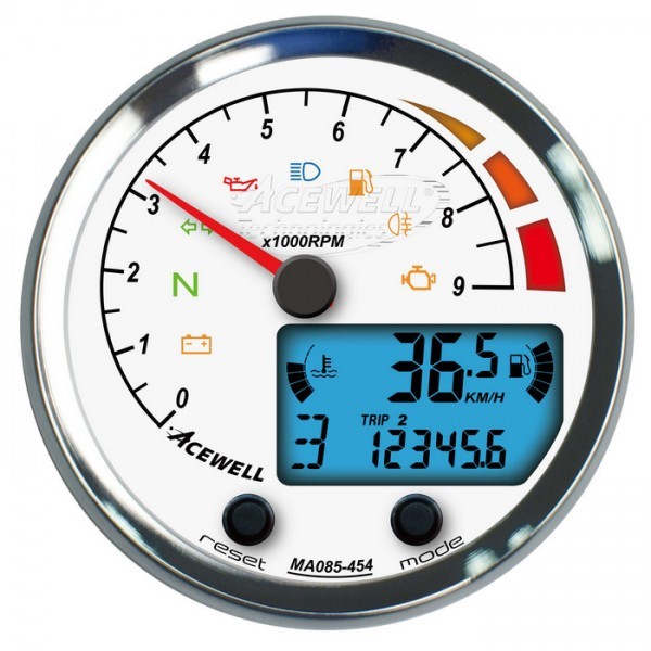 Der ACEWELL Motorrad Tachometer aus der ACE-MA085-X54 Serie verbindet klassisches Design mit moderner Digitaltechnik. Das elegante Chromgehäuse und das weiße Zifferblatt machen das Instrument zu einem optischen Highlight, während die präzise Anzeige von Drehzahl und Geschwindigkeit maximale Kontrolle bietet. Ideal für anspruchsvolle Motorradfahrer, die Wert auf Funktionalität, Stil und Zuverlässigkeit legen.