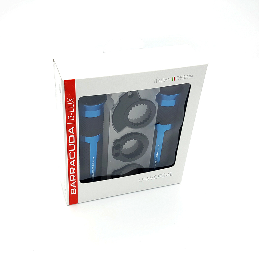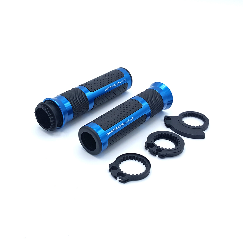 Die Barracuda B-LUX Griffe in blau bieten eine exklusive Kombination aus sportlicher Eleganz und ergonomischem Komfort. Gefertigt aus griffigem, hochwertigem Gummi und ausgestattet mit blau eloxierten Aluminiumeinsätzen, sorgen diese Griffe für ein besonders angenehmes und sicheres Fahrgefühl. Durch die mitgelieferten drei verschiedenen Anschlussadapter eignen sich die Griffe für unterschiedliche Hersteller und können auf Lenkern mit 22 mm Durchmesser montiert werden. Zudem ist die Montage auf den originalen Griffträgern möglich. Bitte beachten Sie: nicht für Heizgriffe geeignet.