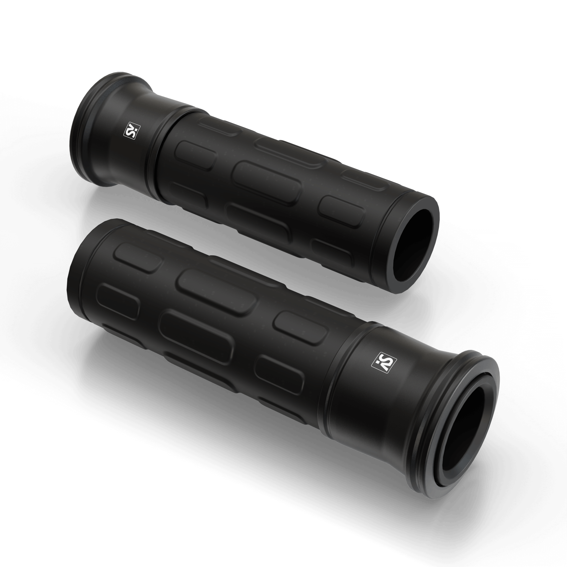 Die SHIN YO Circula-LS Lenkergriffe überzeugen durch eine gelungene Kombination aus modernem Design, hochwertiger Verarbeitung und maximalem Komfort. Die ergonomisch geformten Griffe bestehen aus einer robusten Gummimischung mit strukturiertem Grip und schwarzen Aluminiumeinsätzen. Damit bieten sie sicheren Halt selbst unter schwierigen Fahrbedingungen und unterstützen präzise Lenkbewegungen.