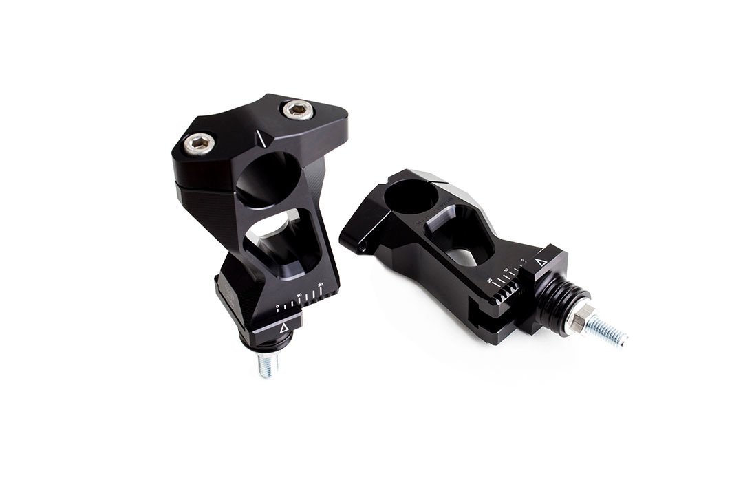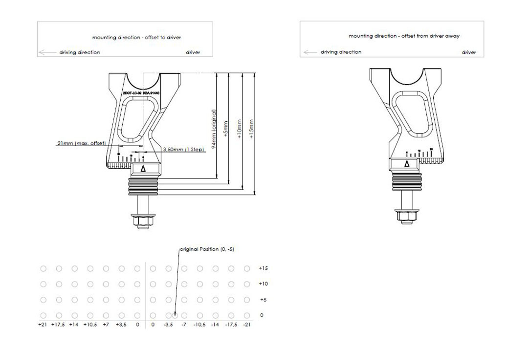 Verstellbar sind die Lenkerböcke um bis zu 25 mm in beide Richtungen (vor und zurück in 3,6 mm Schritten) sowie in der Höhe um 5 mm pro Scheibe – maximal 5 Scheiben inklusive, modellabhängig. Für die Yamaha XSR700 liegt ein passender Tachohalter bei.