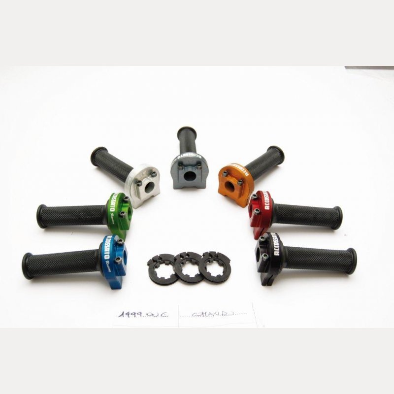 Der Kit enthält drei austauschbare Hubscheiben mit unterschiedlichen Durchmessern (40 mm / 43 mm / 45 mm). Diese ermöglichen es Ihnen, das Übersetzungsverhältnis individuell an Ihren Fahrstil anzupassen. Die montierbaren Außenschalen bestehen aus Aluminium und werden standardmäßig in Schwarz geliefert. Der Gasgriff ist komplett einbaufertig und wird inklusive Gaszügen sowie wahlweise mit schwarzen Racing-Griffen oder Progrip Racing Griffen mit Accossato-Logo geliefert.