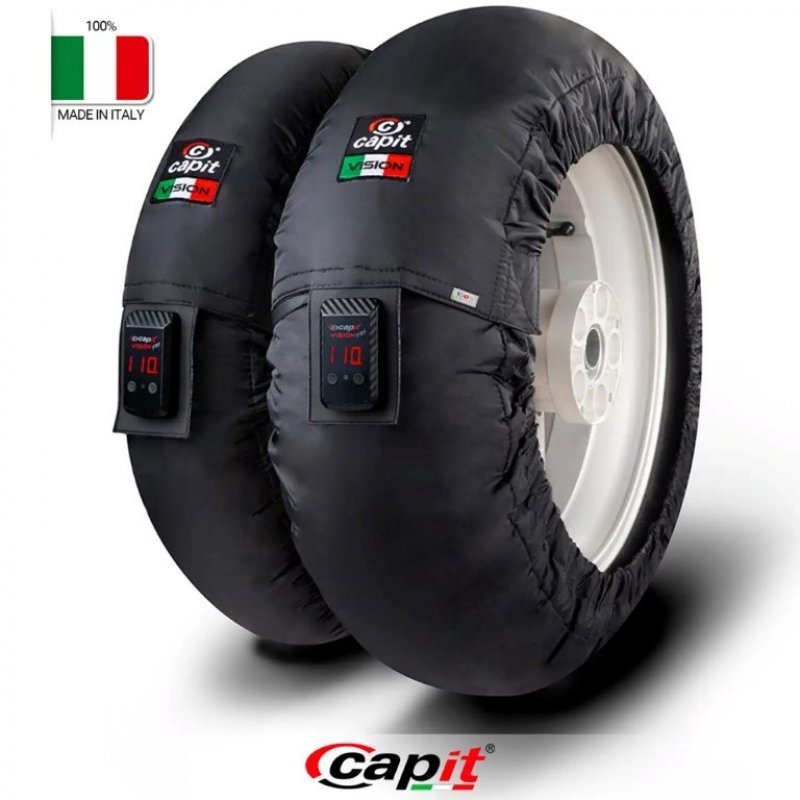 Die Außenhülle besteht aus widerstandsfähigem Teflon, das Innenmaterial aus feuer- und wasserresistentem NOMEX. Alle Capit Reifenwärmer sind der Reifenkontur angepasst, wodurch sich die Montage mühelos gestaltet. Die radial zur Fahrtrichtung verlegten Heizdrähte erwärmen bis zu 75 % der Reifenoberfläche und sorgen für 40 % mehr Heizleistung gegenüber herkömmlichen Systemen. Capit fertigt seit 1996 Premium-Heizsysteme, die in der MotoGP und Superbike-Weltmeisterschaft erfolgreich eingesetzt werden.
