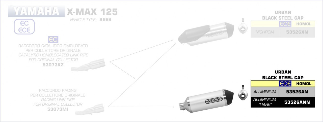 Hinweis: Nur in Verbindung mit Arrow Verbindungsrohr 53073MI (ohne Kat) oder 53073KZ (mit Kat). Zulassung Euro 4 nur in Verbindung mit Kat.
