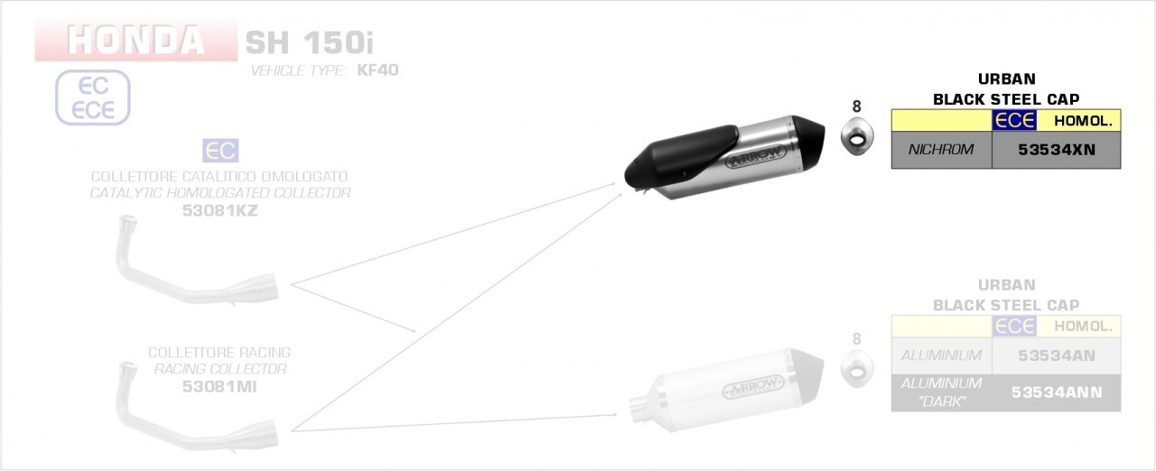 Das Modell ist aus hochwertigem Edelstahl (acciaio inox) gefertigt und für die Montage an Modellen mit dem Kennzeichen KF40 ausgelegt. Für den korrekten Einbau ist der separate Krümmer 53081KZ (mit Katalysator) oder 53081MI (ohne Katalysator) erforderlich. Diese Lösung sorgt für maximale Kompatibilität und optimale Abgasführung, passend für Honda SH 125 i und SH 150 i ab Baujahr 2020.
