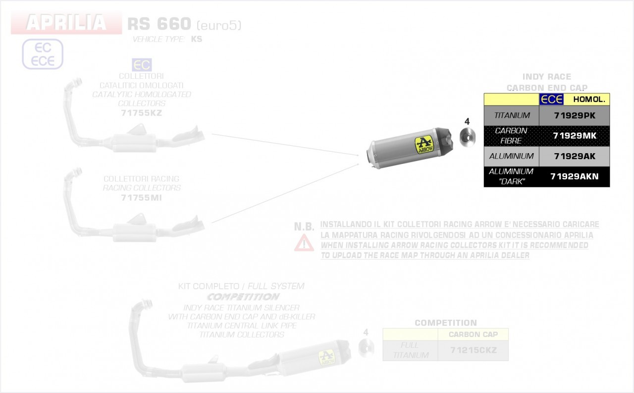 Hinweis: Nur in Verbindung mit Arrow Krümmer 71755KZ (mit Kat) oder 71755MI (ohne Kat). Original-Katalysator entfällt. Euro 5 Zulassung nur in Verbindung mit Kat.
