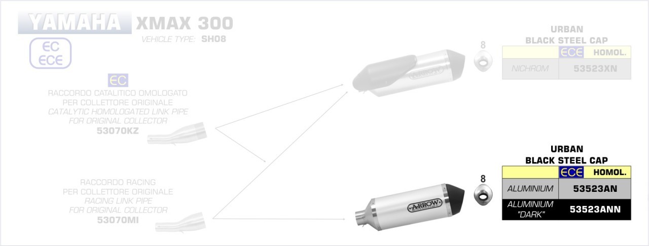 Der Endschalldämpfer ist speziell passend für YAMAHA X-MAX 300 (17–20) entwickelt und überzeugt durch ein hervorragendes Preis-Leistungs-Verhältnis. Für den ordnungsgemäßen Betrieb ist der Einsatz nur in Kombination mit einem Arrow Verbindungsrohr vorgesehen – wahlweise ohne Katalysator (53070MI) oder mit Katalysator (53070KZ). In Verbindung mit Kat erfüllt das System die Euro 4 Zulassung.