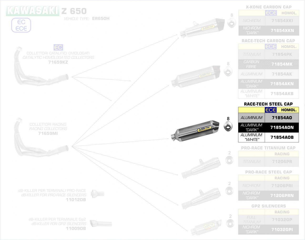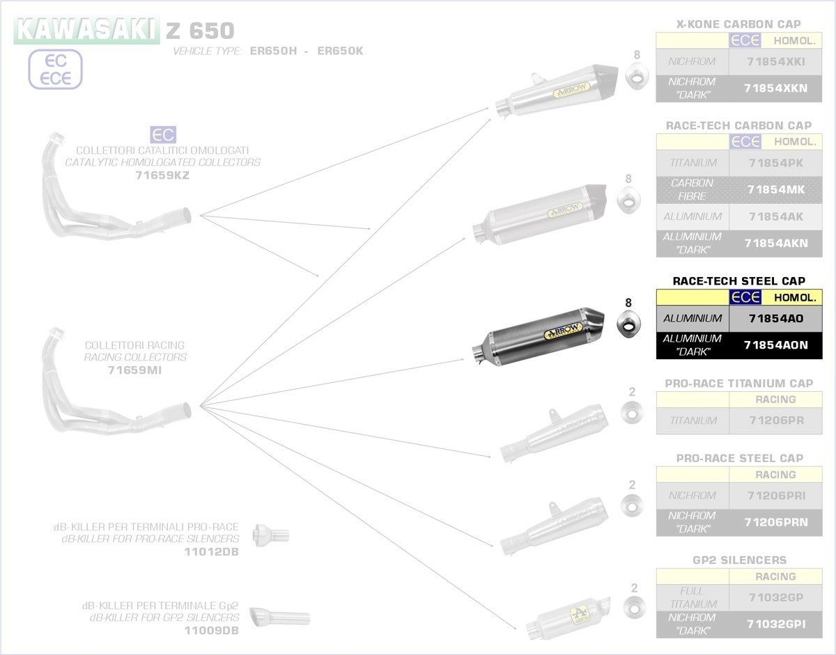 Hinweis: Nur in Verbindung mit Arrow Krümmer 71659KZ (mit Kat) oder 71659MI (ohne Kat); Zulassung Euro 4-5 nur in Verbindung mit Kat.