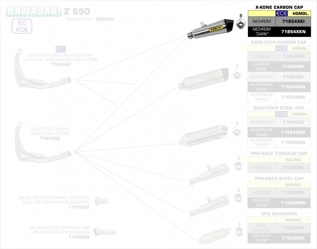 Der X-Kone Endschalldämpfer ist fahrzeugspezifisch entwickelt und gewährleistet eine perfekte Passgenauigkeit. Er ist passend für verschiedene Modelle der Kawasaki Z 650, Ninja 650 und Versys 650 der Baujahre 2017 bis 2022. Für die Straßenzulassung nach Euro 4–5 Norm muss der Dämpfer mit dem Arrow Krümmer 71659KZ (mit Kat) kombiniert werden.