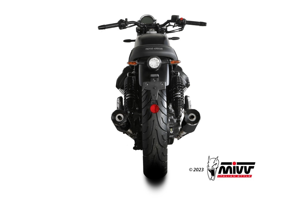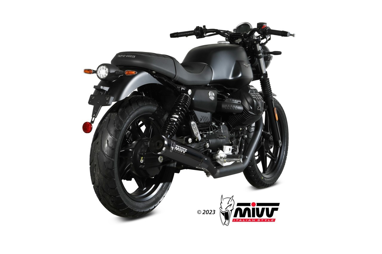 Der MIVV HR-1 Endschalldämpfer aus Edelstahl in elegantem Schwarz überzeugt durch eine hochwertige Verarbeitung und sportliches Design. Dieser spezifisch entwickelte Auspuff ist passend für die Moto Guzzi V7 Stone Baujahre 2021 bis 2024 und sorgt nicht nur für einen markanten Sound, sondern auch für eine klare Gewichtsreduktion gegenüber dem Seriensystem.