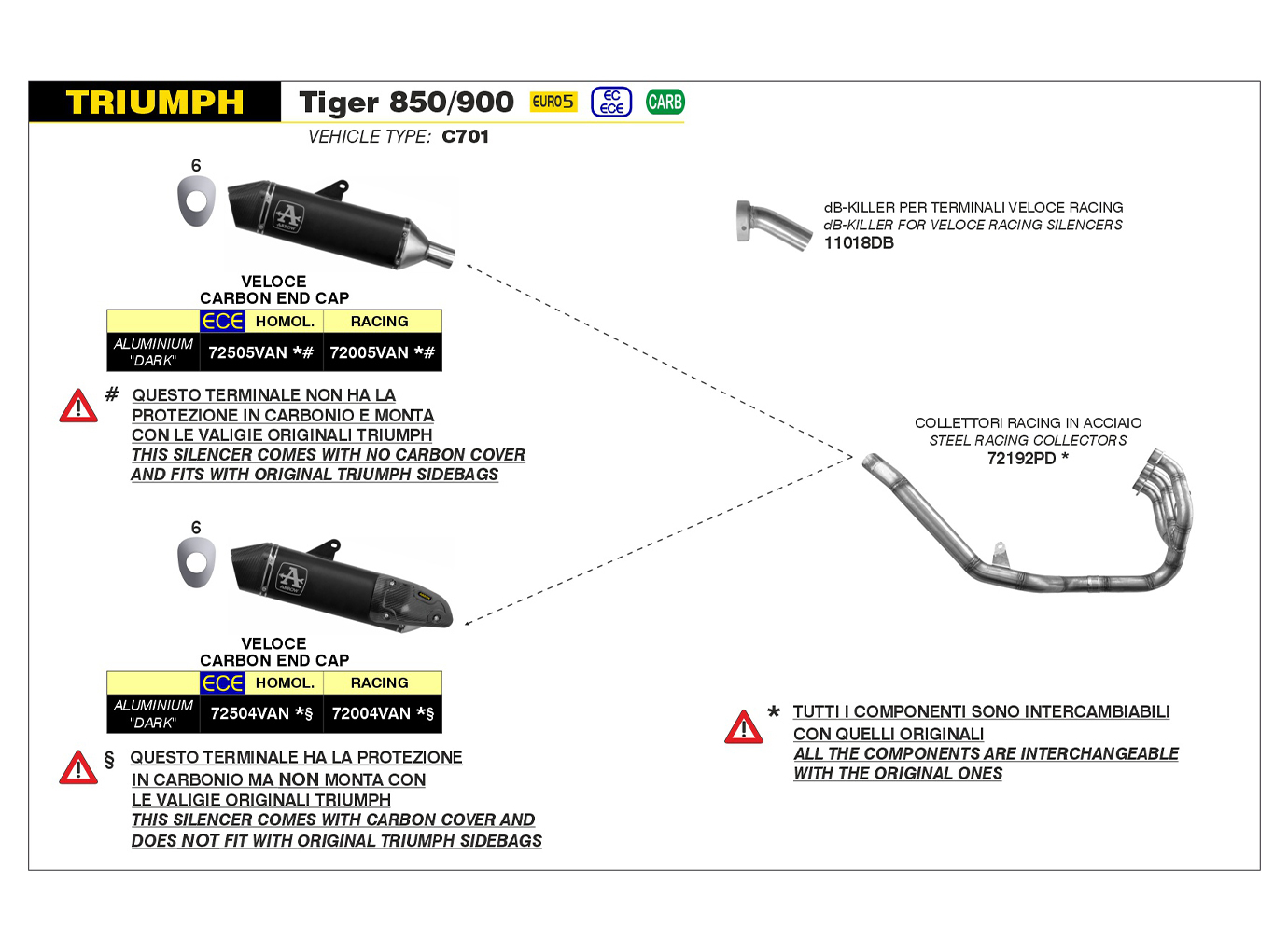 Dieser Slip-On wird ohne Carbon-Hitzeschild geliefert, wodurch die Verwendung der originalen Triumph-Seitentaschen weiterhin möglich ist. Der Schalldämpfer kann direkt an den Original-Krümmer oder den Arrow Edelstahl Racing-Krümmer montiert werden. Der optionale dB-Killer (AR-11018DB) ermöglicht eine individuelle Anpassung der Lautstärke.