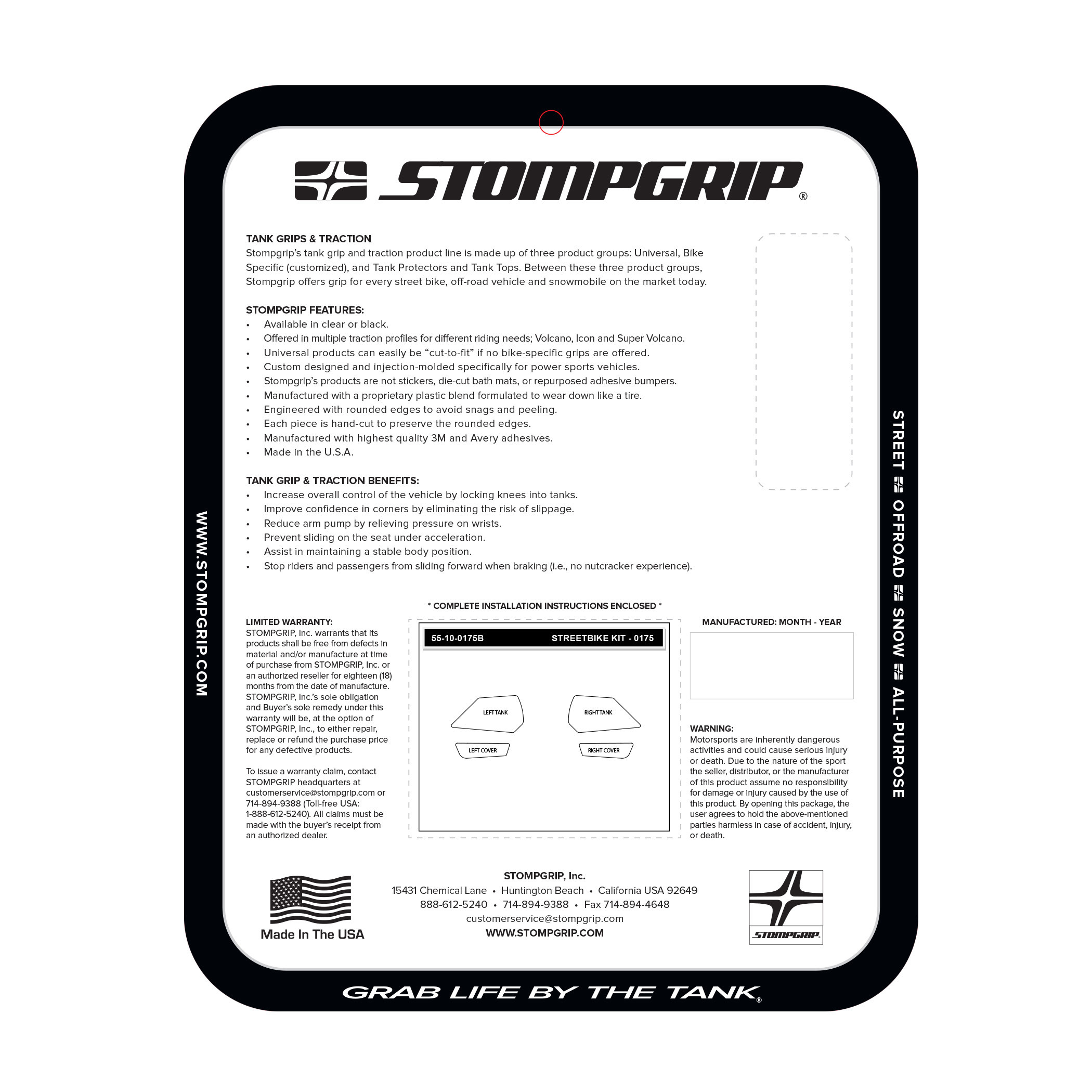 Alle Stompgrip Produkte werden in der firmeneigenen Fertigung in Huntington Beach, Kalifornien (USA) hergestellt. Das Team arbeitet nach dem Just-In-Time-Prinzip, um stets aktuelle und hochwertige Ware zu gewährleisten.