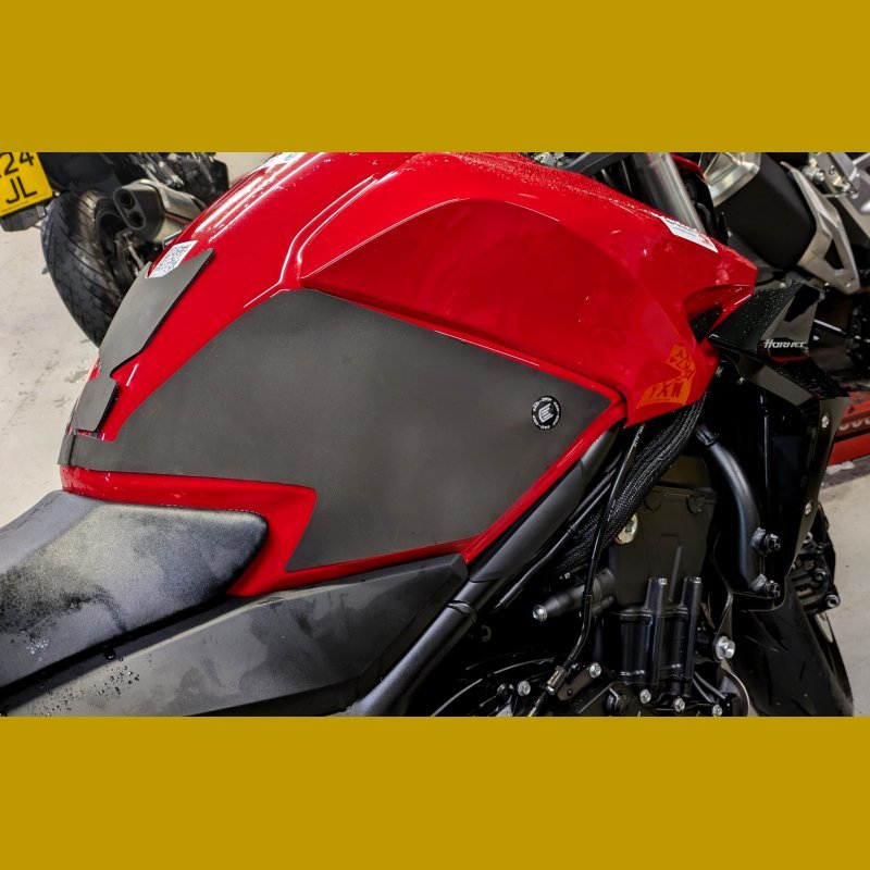 Jeder Tank Pad Kit enthält präzise vorgeschnittene Klebestücke, die exakt auf das jeweilige Motorradmodell abgestimmt sind. Eine runde Aussparung für das Herstellerlogo ist bereits im Pad enthalten.
