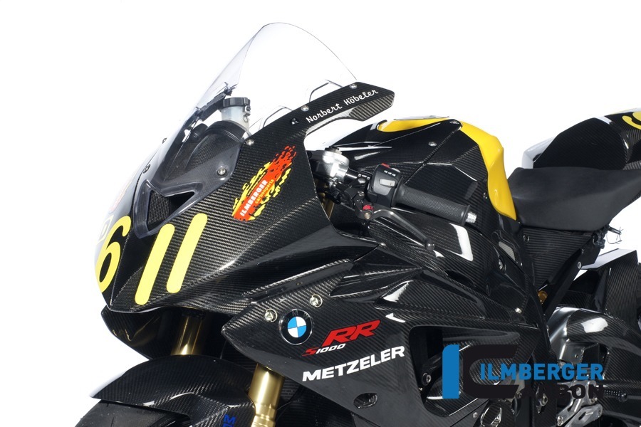 Das Ilmberger Carbon Verkleidungsoberteil Racing 1-teilig aus hochwertigem Prepreg-Carbon wurde speziell passend für die BMW S1000RR entwickelt. Es kann sowohl mit der originalen Serienverkleidung als auch mit der Ilmberger Racingverkleidung kombiniert werden. Bei der Montage mit den Serienverkleidungsteilen sind lediglich zwei zusätzliche seitliche Bohrungen erforderlich. Das Teil ersetzt das originale Bauteil unter Verwendung der serienmäßigen Befestigungspunkte und bietet eine deutliche Gewichtsreduktion von etwa 70% im Vergleich zum Originalteil. Weitere Vorteile sind die erhöhte Steifigkeit und die außergewöhnliche Widerstandsfähigkeit gegen äußere Einflüsse. Die im Autoklaven gefertigte Prepreg-Struktur wird mit einer klaren High-Tech-Kunststoffbeschichtung veredelt, die nicht nur deutlich kratzfester als herkömmliche Klarlacke ist, sondern auch den Glanz und die Tiefenwirkung der Carbonstruktur hervorhebt – für eine edle Racing-Optik und hohe Langlebigkeit.