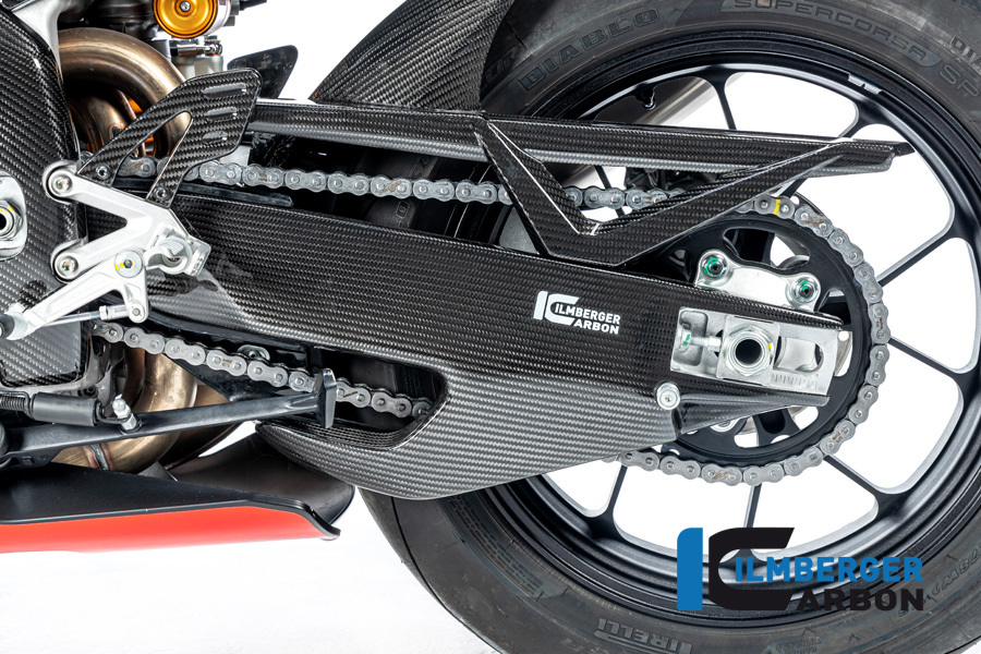Die Ilmberger Carbon Schwingenabdeckung links glanz passend für Aprilia RSV4 und Tuono V4 ab Baujahr 2021 überzeugt durch ihre herausragende Verarbeitung, ihr geringes Gewicht und ihre beeindruckende Optik. Dank der mitgelieferten Allgemeinen Betriebserlaubnis (ABE) ist sie sofort eintragungsfrei verwendbar. Ohne zusätzliche Schrauben schützt die Carbonabdeckung die Schwinge zuverlässig vor Beschädigungen und Schmutz, während der stufenlose Kettenspanner weiterhin frei zugänglich bleibt. Dadurch bleibt die Wartung des Motorrads jederzeit optimal gewährleistet.