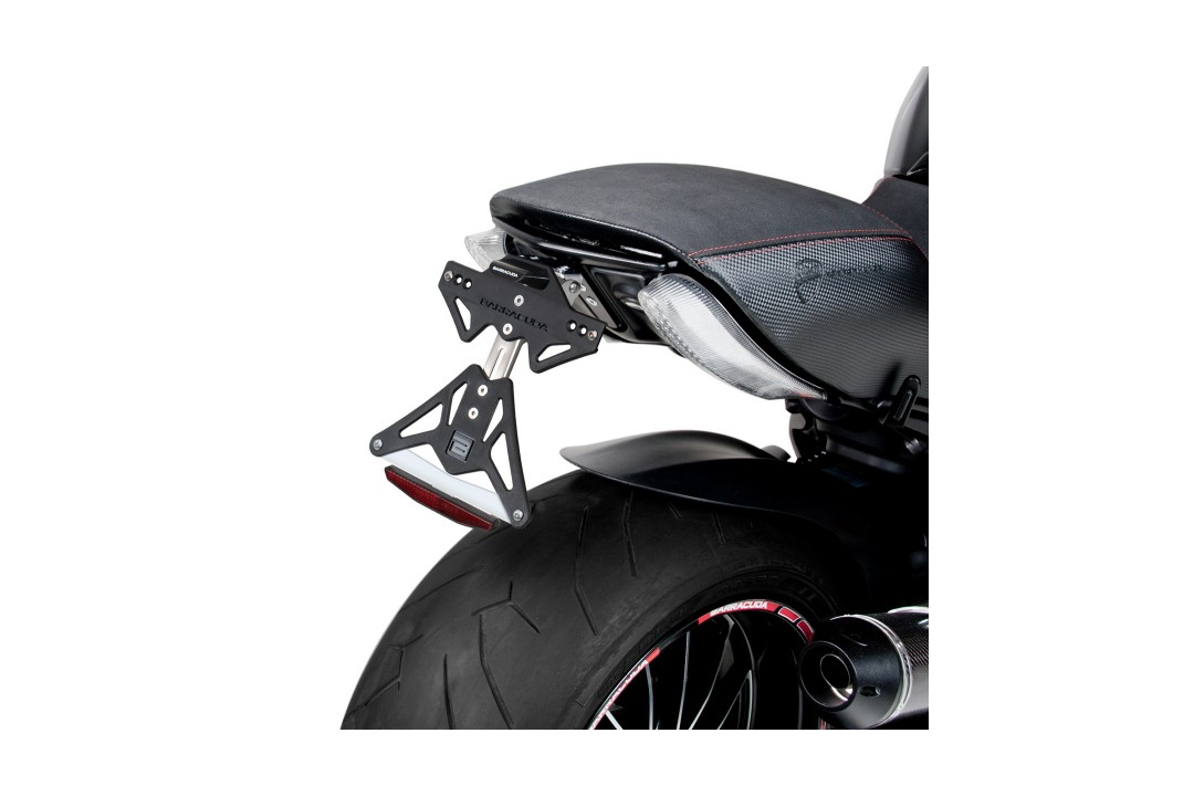 Der Barracuda Kennzeichenhalter passend für Ducati Diavel 2014–2018 wird aus hochwertigem, schwarz eloxiertem Aluminium gefertigt und überzeugt durch seine langlebige, edle Oberfläche. Das stabile Scharnier aus Edelstahl sorgt für eine sichere Befestigung, minimiert Vibrationen und bietet eine präzise Einstellbarkeit des Neigungswinkels. Dank der fahrzeugspezifischen Entwicklung ist eine exakte Passform für Ihre Ducati Diavel gewährleistet. Die Haltewinkel für Blinker sind geschraubt und lassen sich an verschiedene Kennzeichengrößen anpassen. Bitte beachten Sie, dass Kennzeichenbeleuchtung (Art.-Nr. BC-N1002) und Rückstrahler (Art.-Nr. BC-NCAT) separat bestellt werden müssen. Alle benötigten Montageschrauben sind im Lieferumfang enthalten.