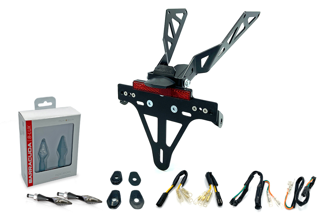 Der im Kit enthaltene kurze Kennzeichenhalter überzeugt durch modernes, sportliches Design und hohe Funktionalität. Dank der präzisen Fertigung aus Edelstahl und Aluminium bietet er eine langlebige und stabile Lösung. Die Oberfläche ist durch schwarze kathodische Tauchlackierung bzw. schwarze Eloxalschicht edel veredelt. Der Winkel des Kennzeichens lässt sich stufenlos einstellen, und sämtliche Montageteile inklusive Blinkerhalter mit M8-Gewinde sind im Set enthalten.