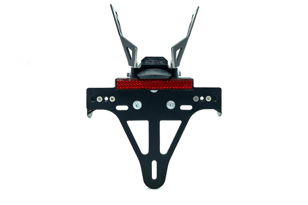 Alle notwendigen Befestigungselemente sind im Lieferumfang enthalten, ebenso wie Halter für Zubehörblinker (Gewinde M8 und M10), eine Kennzeichenleuchte und ein Rückstrahler, beide mit E-Prüfzeichen. Der Abstand der Blinker lässt sich anpassen, um den gesetzlichen Vorgaben zu entsprechen. Die Rückenplatte mit ca. 180 mm Breite passt perfekt zu den neuen, schmalen Kennzeichen.