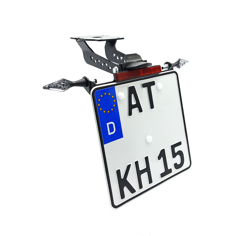 Der alpha Technik Kennzeichenhalter überzeugt durch geringes Gewicht, sportliches Design und hohe Stabilität. Er wurde speziell passend für Kawasaki Z900 (Modelle 2017–2023) entwickelt und besteht aus einer Kombination von Edelstahl und Aluminium, die durch Laserschnitt präzise gefertigt werden. Durch die schwarze kathodische Tauchlackierung bzw. Eloxalschicht erhält er eine elegante, widerstandsfähige Oberfläche. Die Montage ist dank beiliegender Anleitung einfach durchzuführen, und der Neigungswinkel lässt sich stufenlos einstellen. Zudem sind Rückstrahler und Kennzeichenleuchte mit E-Prüfzeichen zertifiziert.