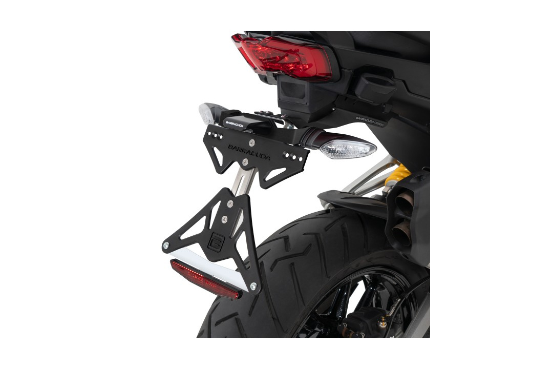Der Barracuda Kennzeichenhalter passend für Ducati Multistrada V4S ab Modelljahr 2022 wird aus robustem, schwarz eloxiertem Aluminium gefertigt und überzeugt durch eine präzise Passform sowie hohe Verarbeitungsqualität. Das verstellbare Scharnier besteht aus Edelstahl, wodurch Stabilität und Langlebigkeit gewährleistet sind, selbst bei sportlicher Fahrweise. Die Haltewinkel für die Blinker sind geschraubt und speziell auf die in Deutschland zulässige Kennzeichengröße abgestimmt. Der Halter ist zur Verwendung mit den originalen Blinkern ausgelegt; Zubehörblinker können nicht montiert werden.