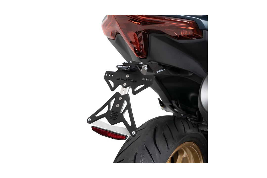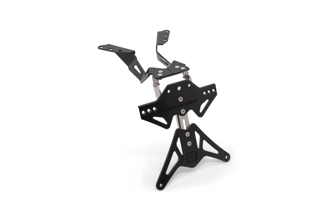 Der Barracuda Kennzeichenhalter aus hochwertigem, schwarz eloxiertem Aluminium ist speziell passend für Yamaha T-MAX 560 ab Baujahr 2022 entwickelt. Das durchdachte Design integriert sich harmonisch in die Linienführung des Fahrzeugs und sorgt für eine sportlich-elegante Heckoptik. Das stabile Edelstahl-Scharnier ermöglicht eine exakte Einstellung des Neigungswinkels, wodurch Sie die Position des Kennzeichens optimal anpassen können. Durch das vibrationsreduzierte System wird auch bei höheren Geschwindigkeiten ein sicherer Halt gewährleistet. Der Kennzeichenhalter wird komplett mit dem benötigten Verkleidungsunterteil und allen notwendigen Befestigungsschrauben geliefert. Bitte beachten Sie, dass die Kennzeichenbeleuchtung (Art.-Nr. BC-N1002) und der Rückstrahler (Art.-Nr. BC-NCAT) separat bestellt werden müssen.