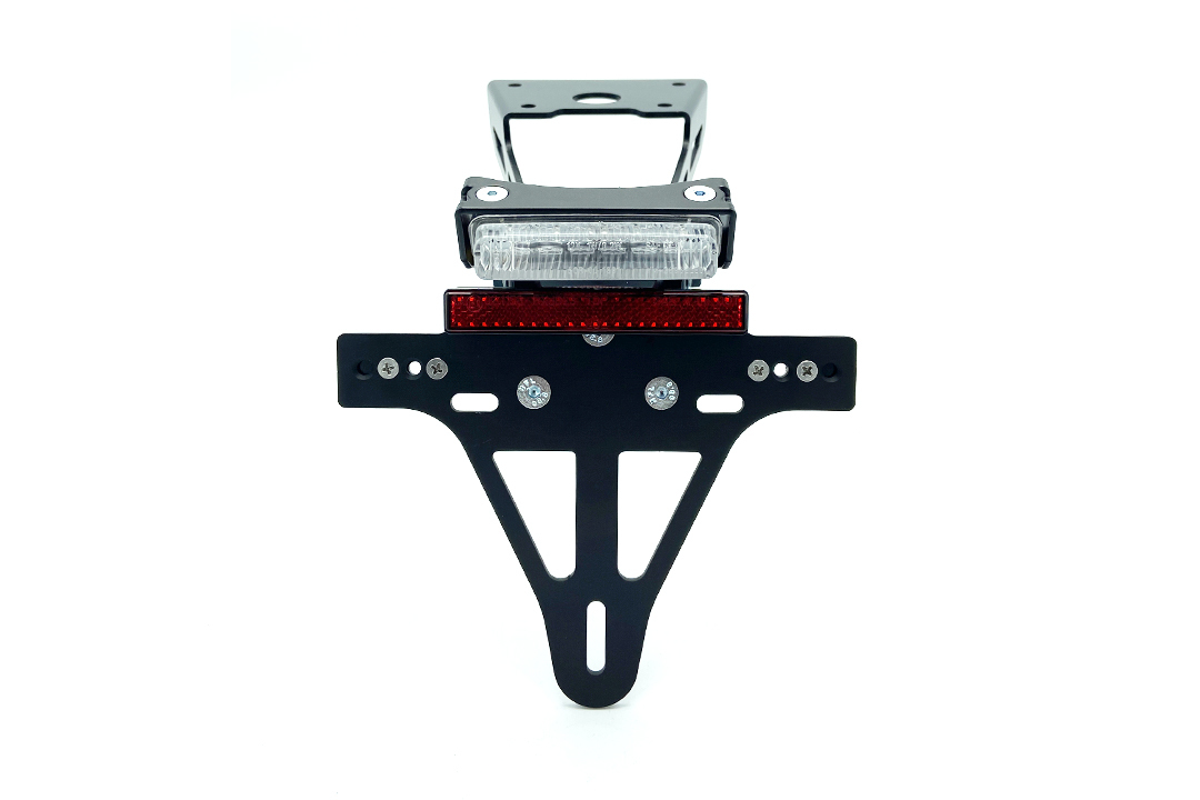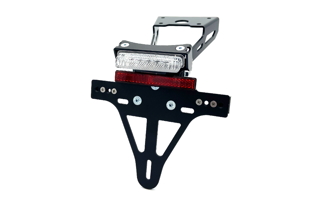 Der Kennzeichenhalter lässt sich stufenlos in der Neigung verstellen, um individuelle Anpassungen zu ermöglichen. Die Breite der Blinkeraufnahme ist flexibel, sodass der Abstand richtlinienkonform eingestellt werden kann. Alle für die Montage erforderlichen Materialien sind im Lieferumfang enthalten. Für Zubehörblinker mit M8- und M10-Gewinde ist eine entsprechende Halterung vorhanden. Die Kennzeichenleuchte und der Rückstrahler verfügen über ein E-Prüfzeichen.