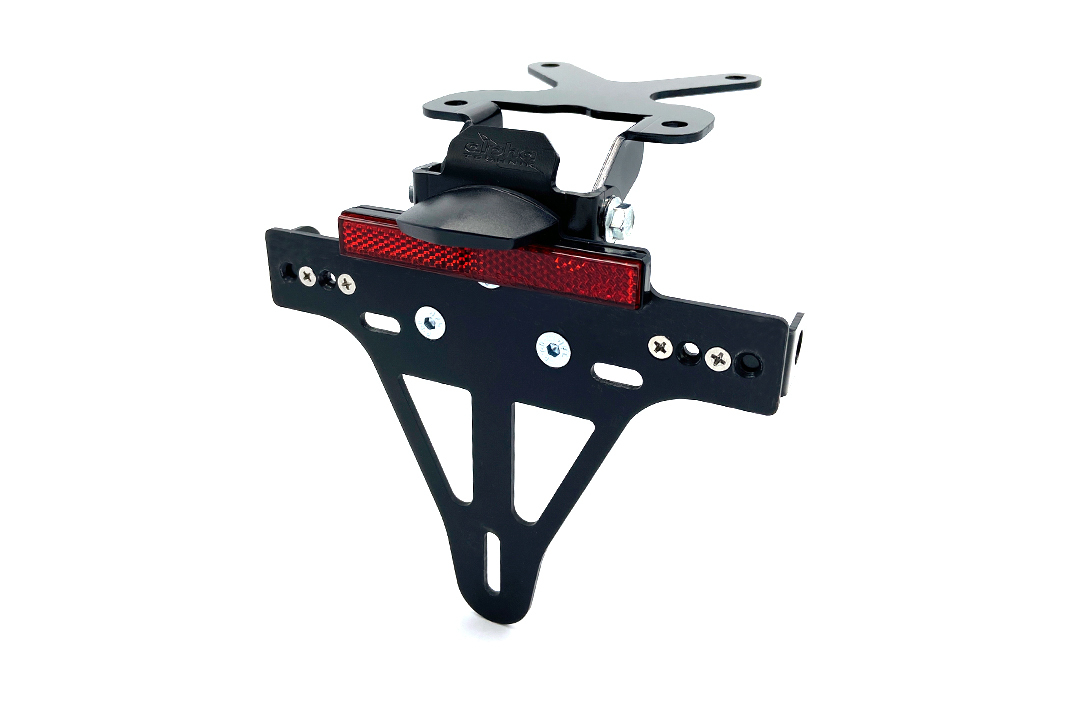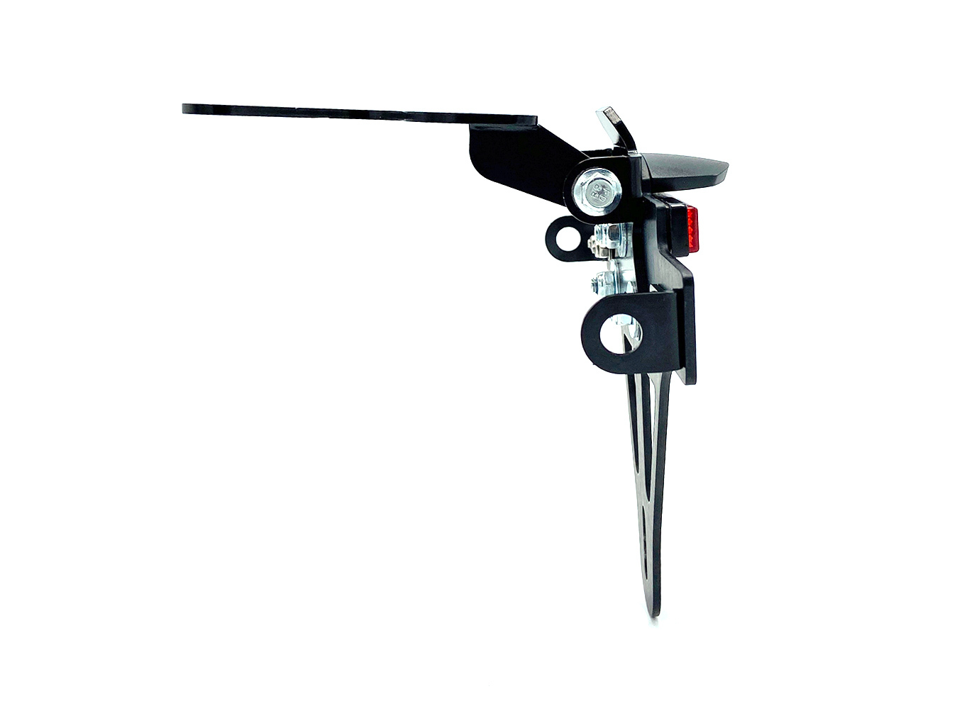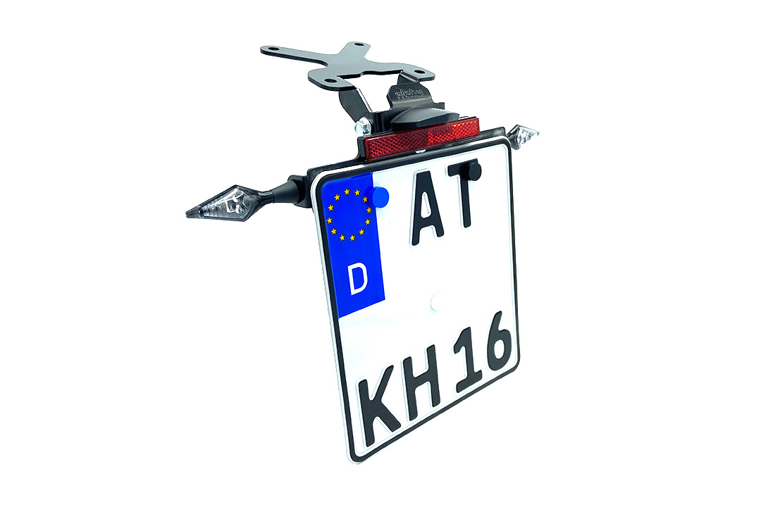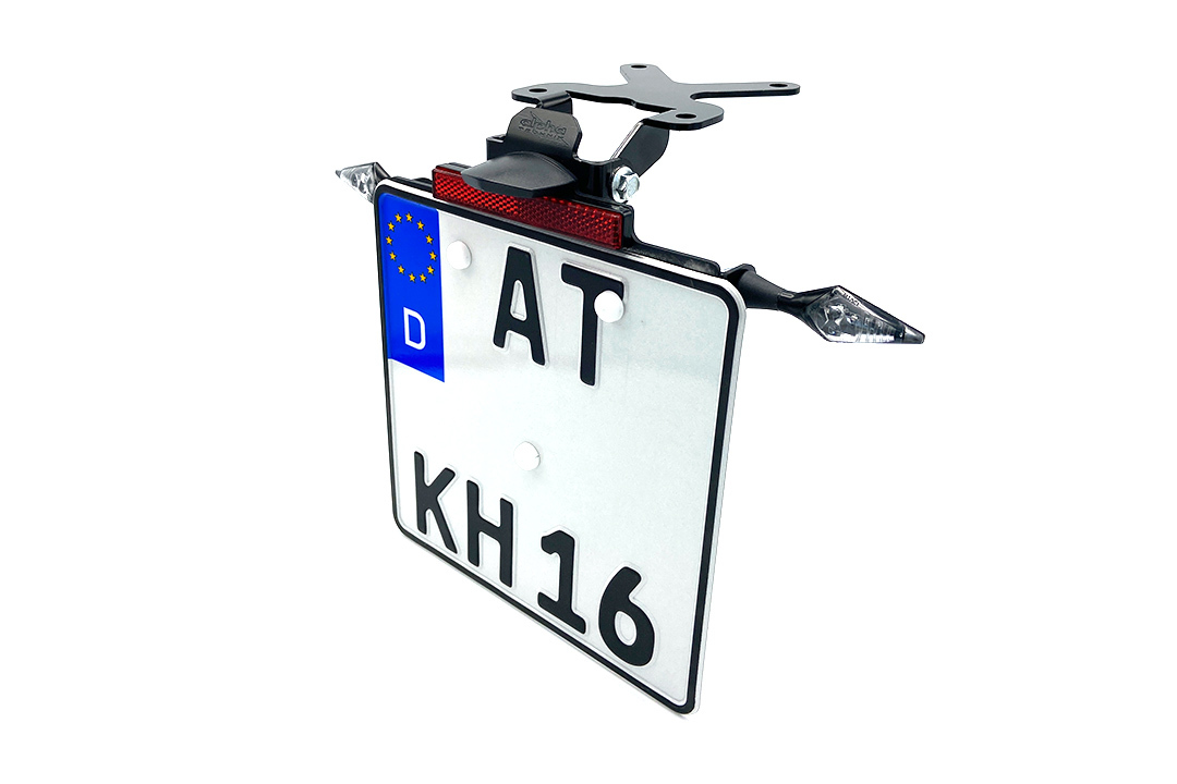 Die Neigung des Kennzeichenhalters ist stufenlos verstellbar, sodass Sie Ihr Motorrad individuell anpassen können. Durch die variable Blinkermontage mit Gewinde M8 und M10 ist das Produkt ideal für die Verwendung mit Zubehörblinkern geeignet. Die Kennzeichenbeleuchtung und der integrierte Rückstrahler verfügen über ein E-Prüfzeichen – für maximale Sicherheit und gesetzeskonforme Nutzung. Der Halter wird inklusive aller zur Montage erforderlichen Bauteile geliefert. Die Rückenplatte mit einer Breite von ca. 180 mm ist perfekt auf moderne, schmale Kennzeichen abgestimmt.