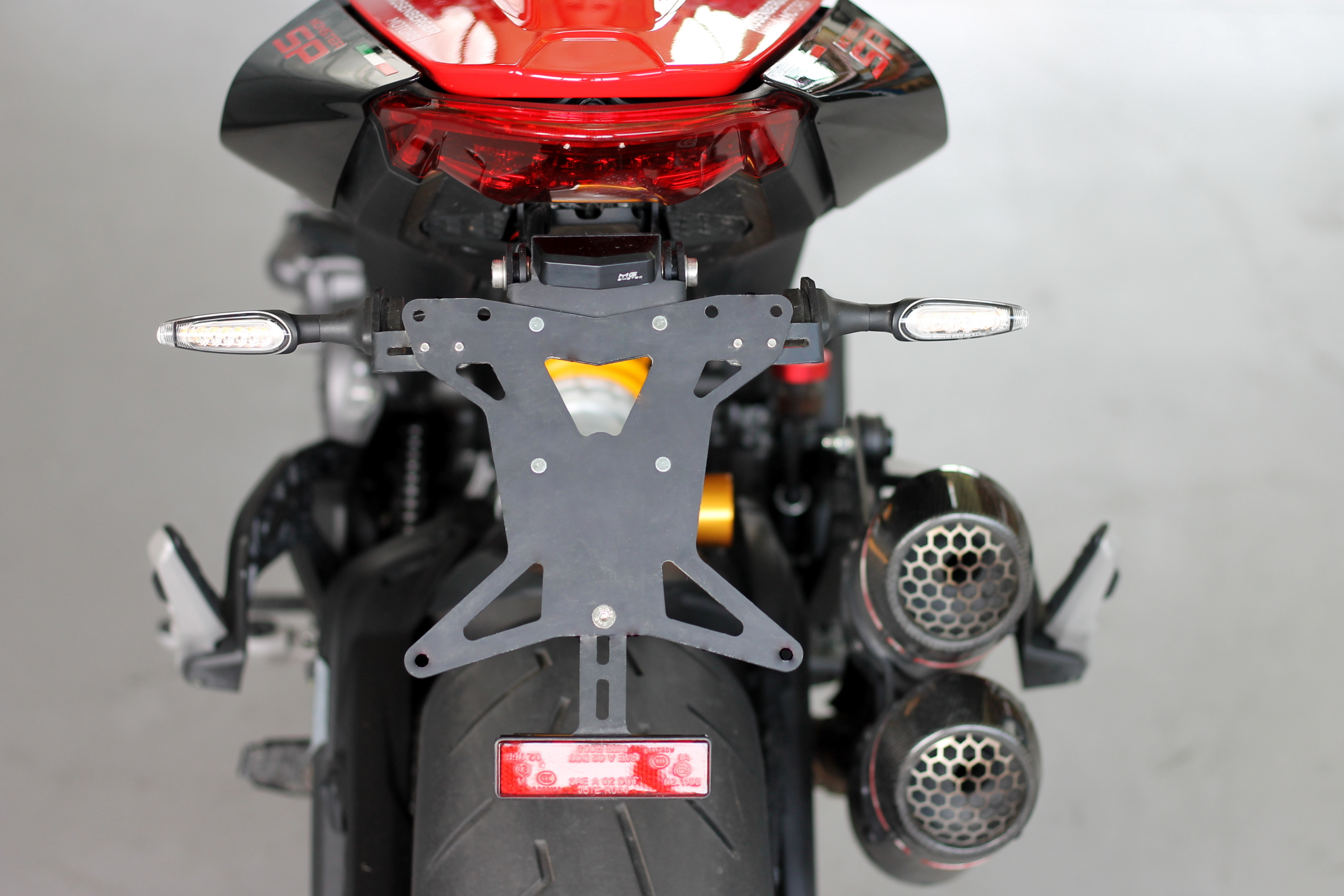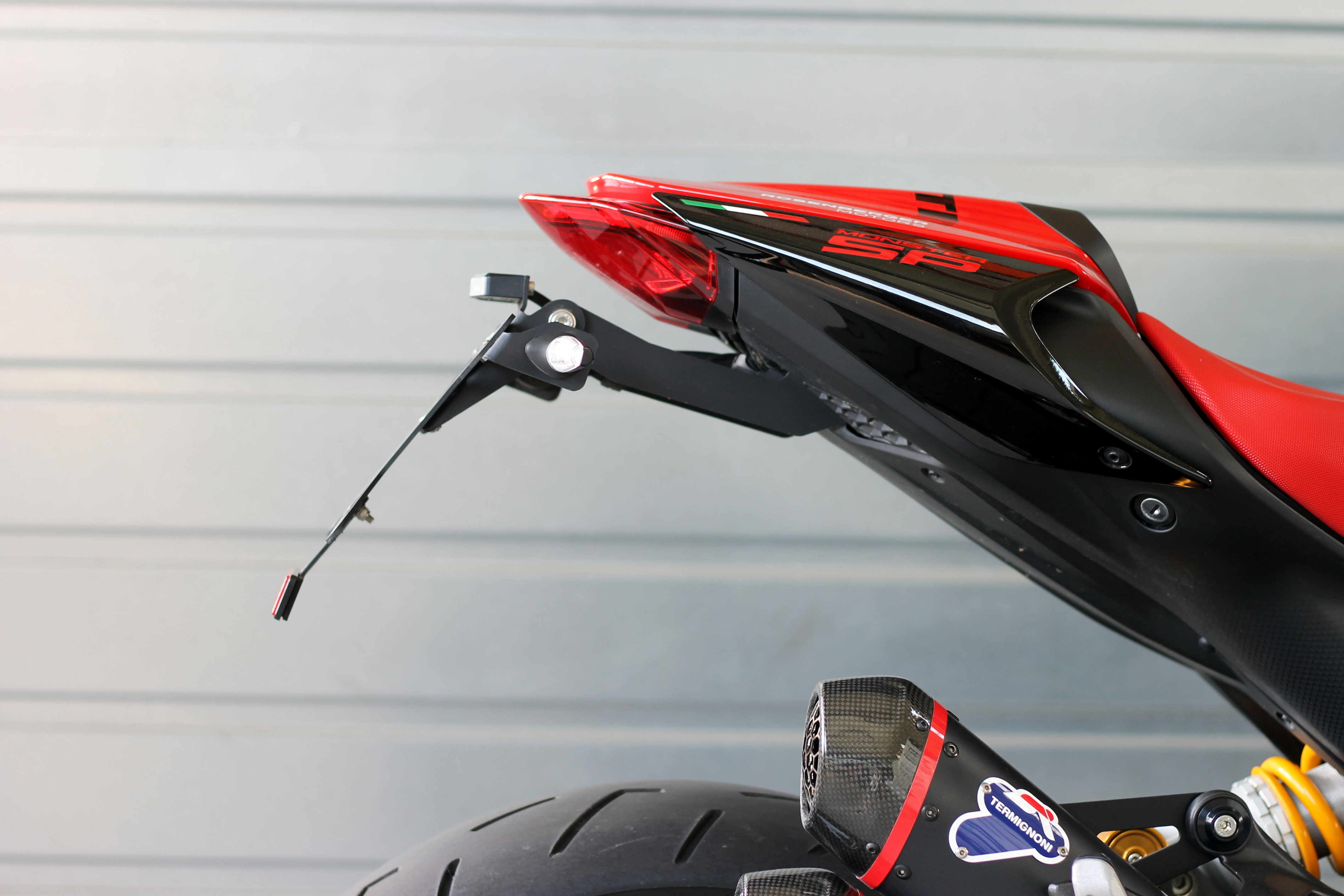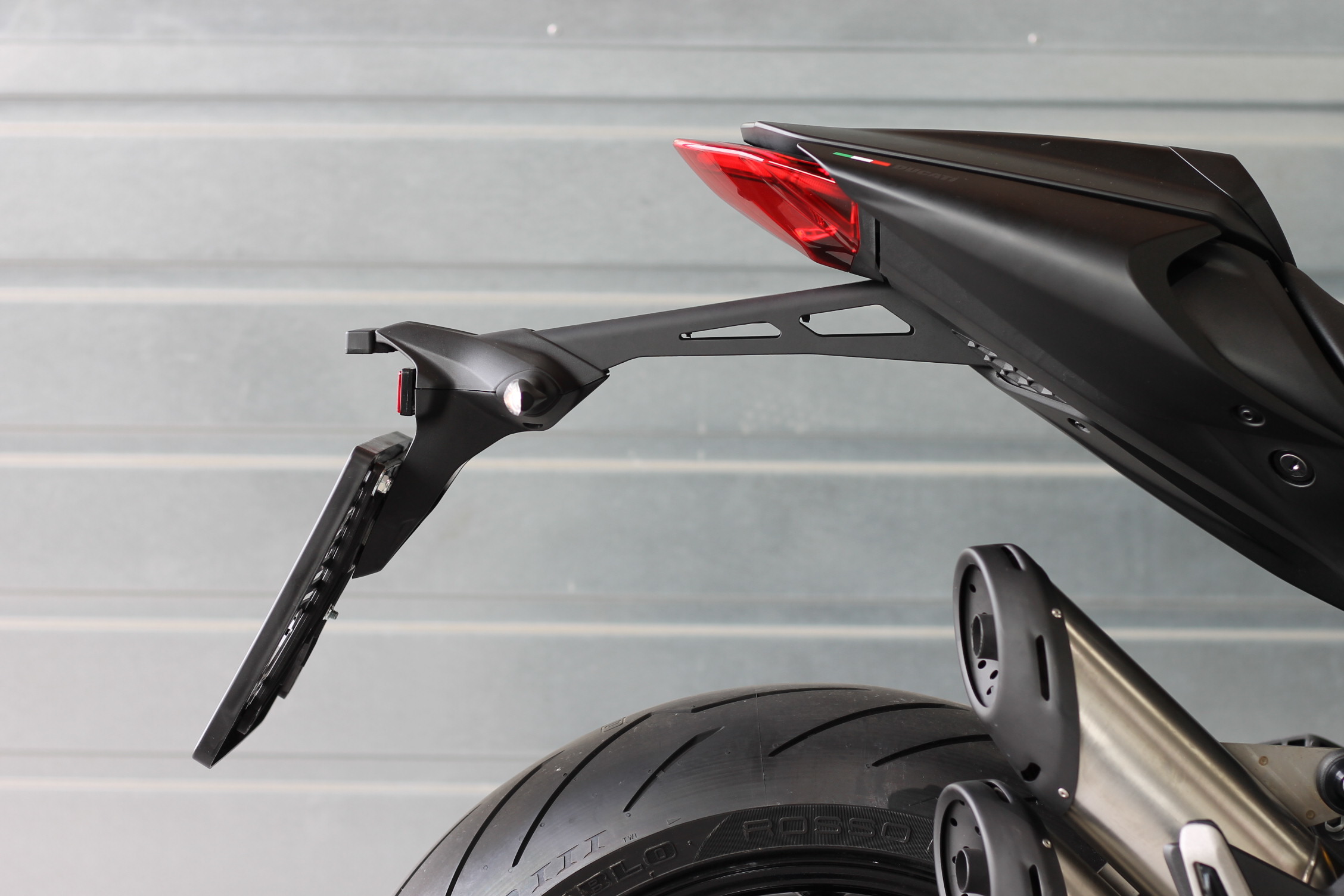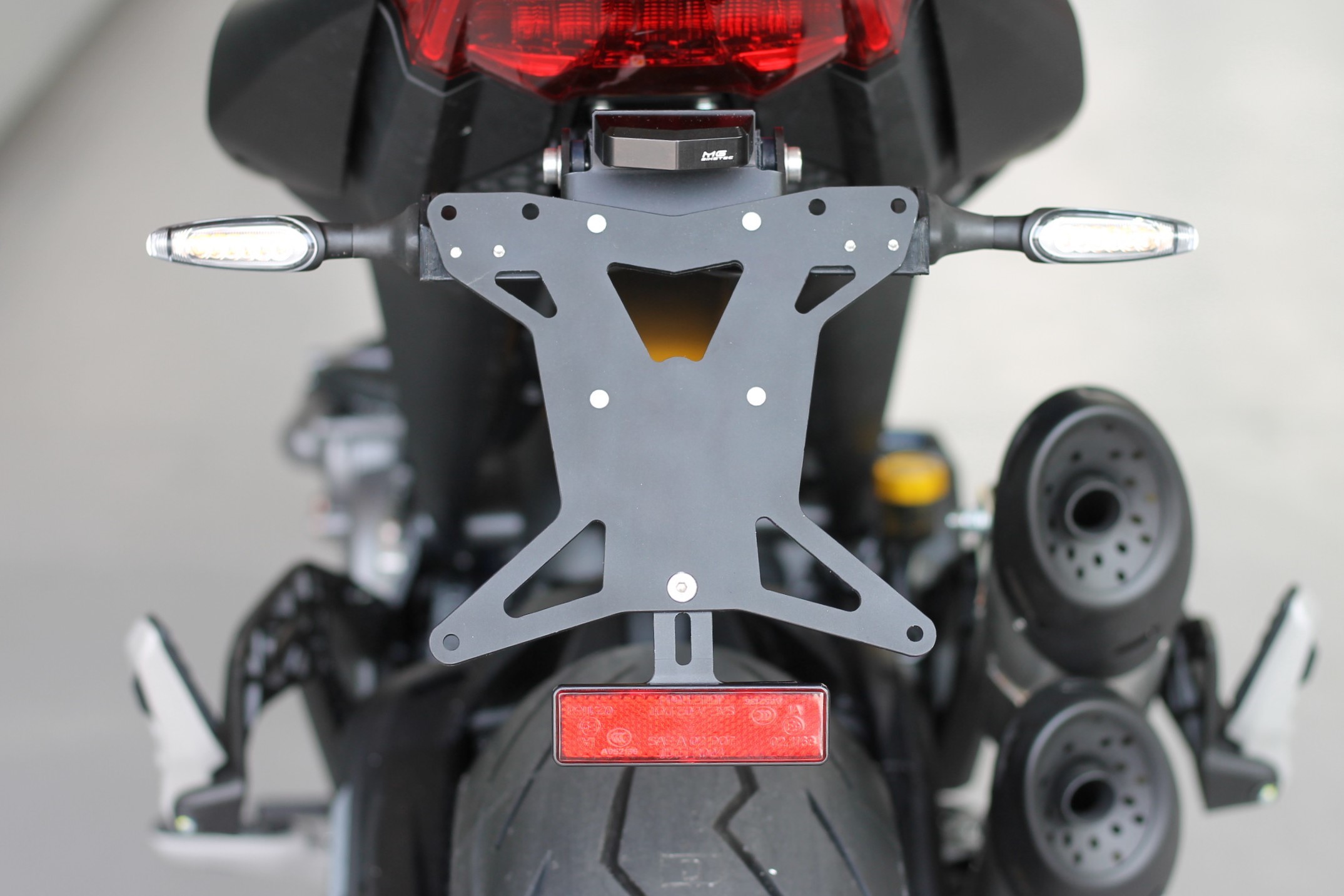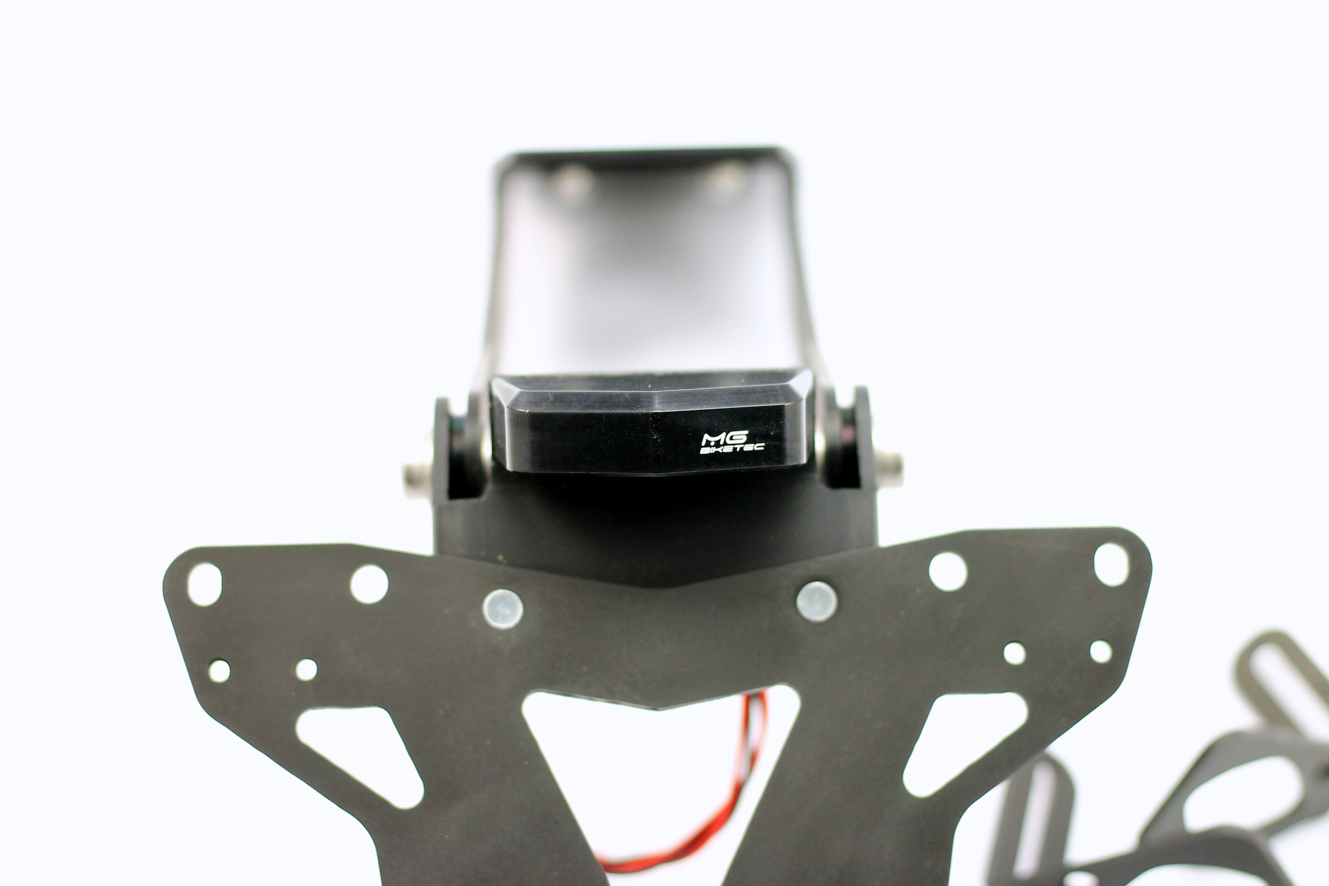 Der MG Biketec Kennzeichenhalter passend für die Ducati Monster / Monster+ 937 (950) ab 2021 überzeugt durch sein durchdachtes Design und hochwertige Verarbeitung. Der kurze, kompakte Kennzeichenträger unterstreicht die sportliche Linie Ihres Motorrads und sorgt für eine klare, aufgeräumte Heckansicht. Gefertigt aus präzise CNC-gefrästem Aluminium und mit einer robusten, matt-schwarz eloxierten Oberfläche versehen, bietet der Halter sowohl optisch als auch funktional eine deutliche Aufwertung. Die Neigung des Nummernschildes sowie die Blinkeraufnahmen sind voll einstellbar, sodass Sie den Kennzeichenhalter individuell an Ihre Bedürfnisse anpassen können. Eine integrierte LED-Kennzeichenbeleuchtung mit ECE-Zulassung sowie ein Reflektor mit ECE-Prüfzeichen sorgen für beste Sichtbarkeit und StVZO-konforme Nutzung. Der Einbau gestaltet sich besonders einfach – es muss lediglich ein Stecker getrennt werden. Zudem stehen verschiedene Halterplattengrößen zur Auswahl, um landesspezifische Anforderungen zu erfüllen, darunter Österreich, Deutschland, Frankreich, Schweiz und weitere Länder.