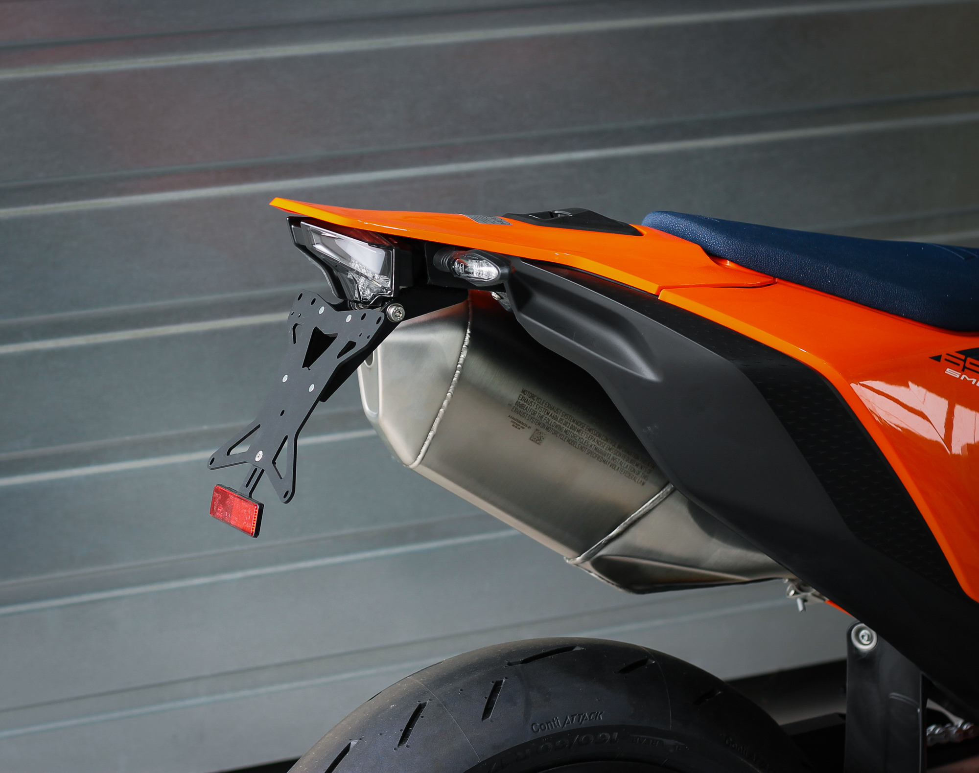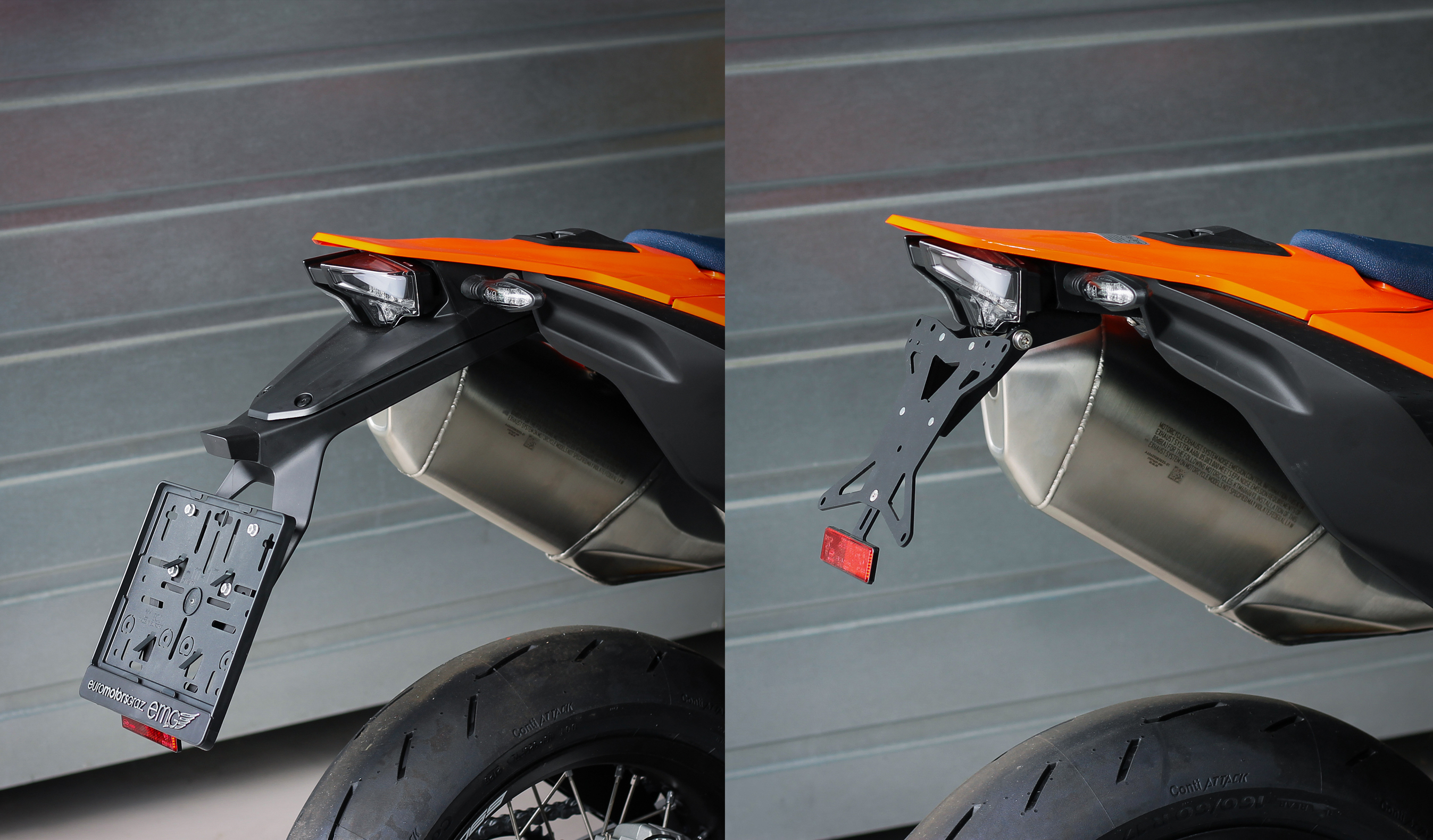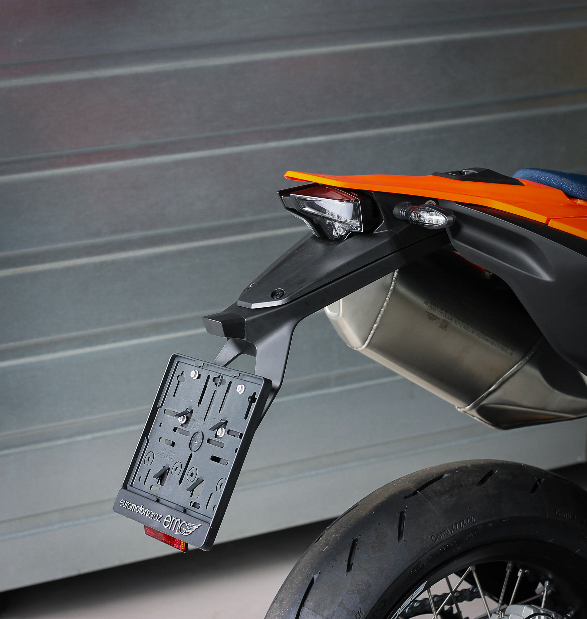 Der hochwertige MG Biketec Kennzeichenhalter passend für KTM 690 SMC R ab 2019 - 2023 überzeugt durch ein kurzes, kompaktes und modernes Design. Durch die präzise CNC-gefräste Aluminiumkonstruktion ist der Kennzeichenträger besonders robust und dennoch extrem leicht, wodurch Sie eine Gewichtsersparnis von 950 g erreichen. Die matt-schwarz eloxierte Oberfläche schützt dauerhaft vor Witterungseinflüssen und verleiht Ihrem Motorrad einen edlen Look. Der Kennzeichenwinkel lässt sich individuell einstellen, um die optimale Ausrichtung und Ästhetik zu erzielen. Die Montage gestaltet sich einfach – lediglich ein Stecker muss getrennt werden.
