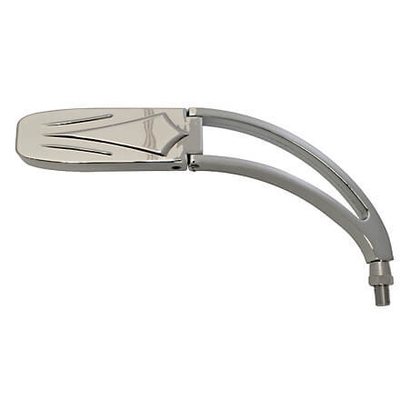 Der SHIN YO Chopper-Spiegel Sturgis 2 überzeugt durch sein einzigartiges Design und hochwertige Verarbeitung. Der Spiegel besteht aus robustem Aluminium, ist verchromt und besitzt eine markante Aussparung im Spiegelarm, die dem Chopper-Stil entspricht. Der Spiegelkopf ist mit einem charakteristischen Relief versehen und sorgt für einen ansprechenden Look an Ihrem Motorrad. Dieser Spiegel ist für die rechte Seite vorgesehen und verfügt über ein M10 x 1,25 mm Rechtsgewinde.