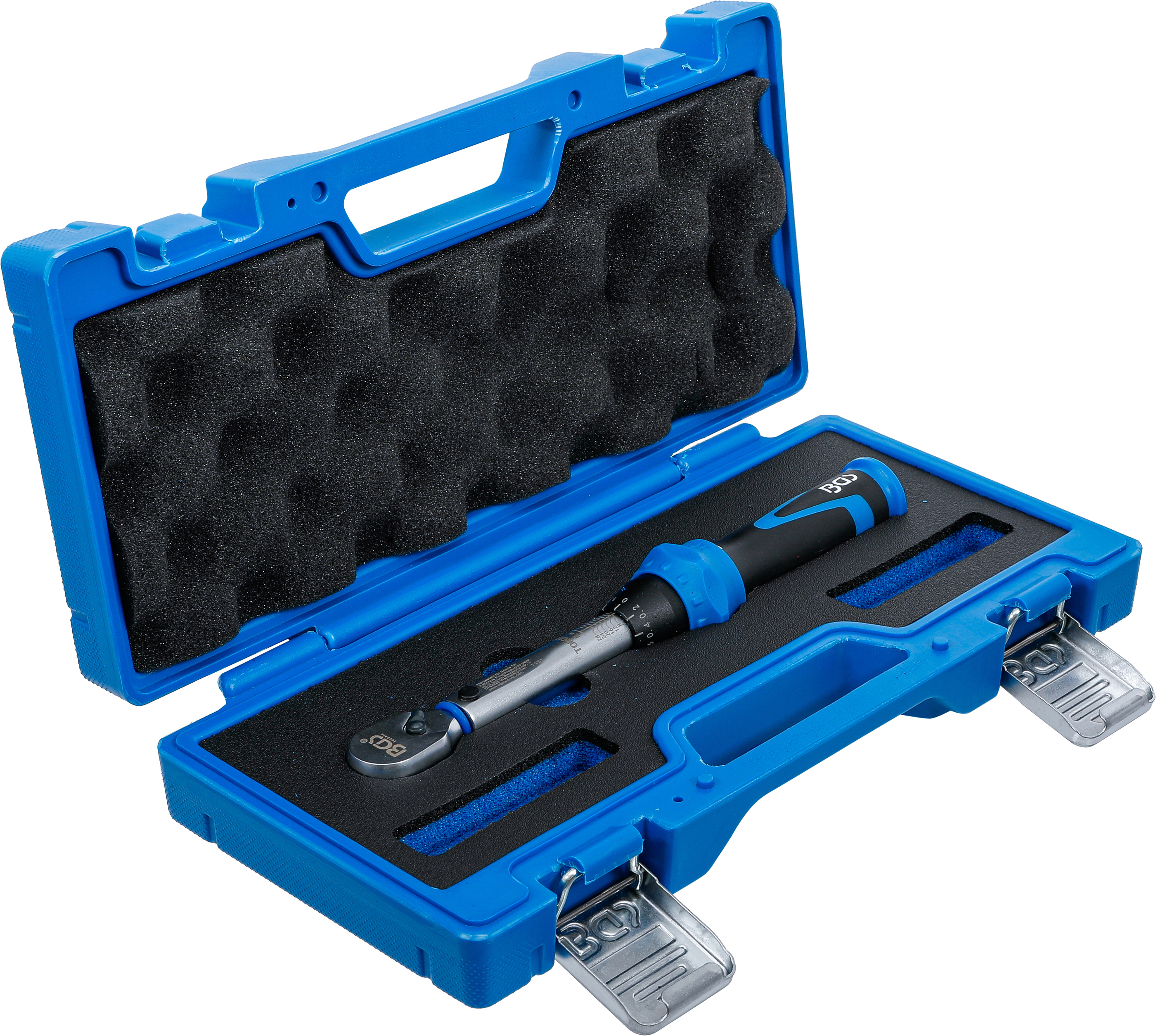 Die integrierte Umschaltknarre verfügt über eine geschlossene, schmale Kopfform und eine feinverzahnte Ratschenmechanik mit 72 Zähnen. Eine gelaserte Strichskala mit Feineinstellung sorgt für exakte Justierung des gewünschten Drehmoments. Der ergonomisch geformte Kunststoffgriff liegt angenehm in der Hand und gewährleistet sicheren Halt sowie einfaches Ver- und Entriegeln. Nach Gebrauch lässt sich das Werkzeug sicher in der passgenauen Hartschaumeinlage im robusten Kunststoffkoffer verstauen – inklusive Kalibrierzertifikat.