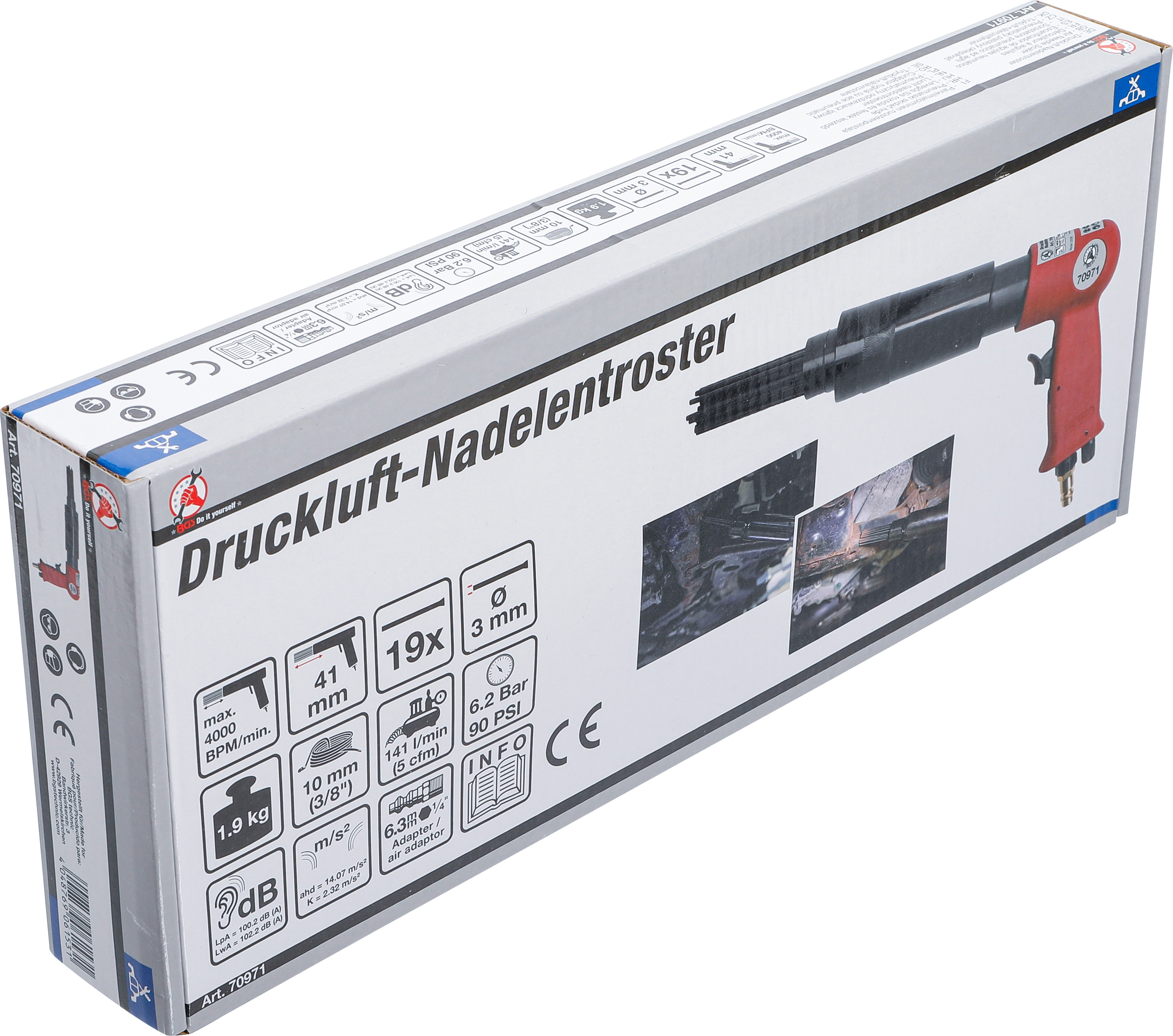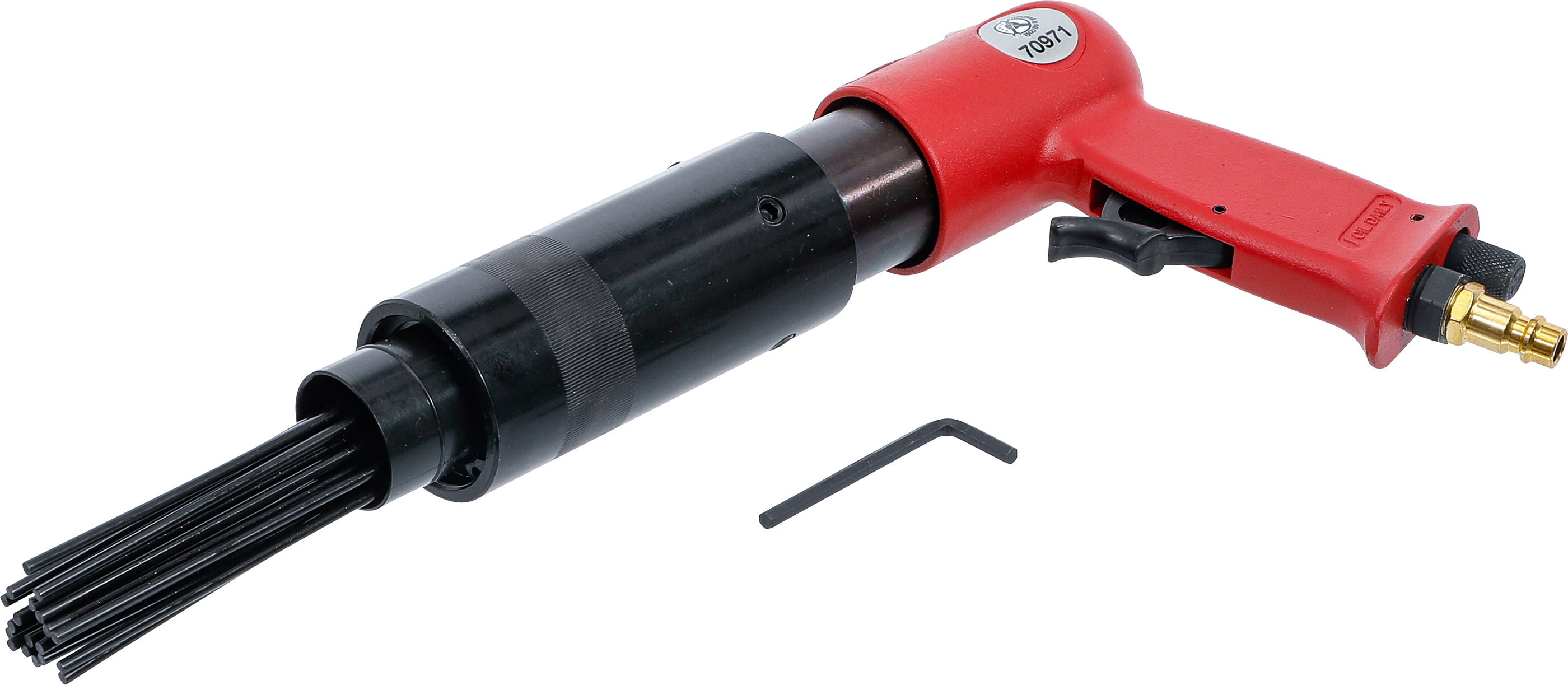 Der Druckluft-Nadelentroster eignet sich ideal zum Entfernen, Entrosten, Reinigen und Abklopfen von Beschichtungen an soliden Metallteilen wie Farbe, Schweißschlacke oder Rost. Durch seine handliche Pistolenform ist ein ermüdungsfreies Arbeiten auch über längere Zeit möglich. Das stabile Ganzmetallgehäuse sorgt für hohe Langlebigkeit und Zuverlässigkeit im täglichen Einsatz. Dank des regulierbaren Luftregelventils lässt sich die Schlagzahl individuell anpassen. Mit 19 Nadeln zu je Ø 3 mm bietet dieses Druckluftwerkzeug eine hohe Abtragsleistung für präzise Ergebnisse.
