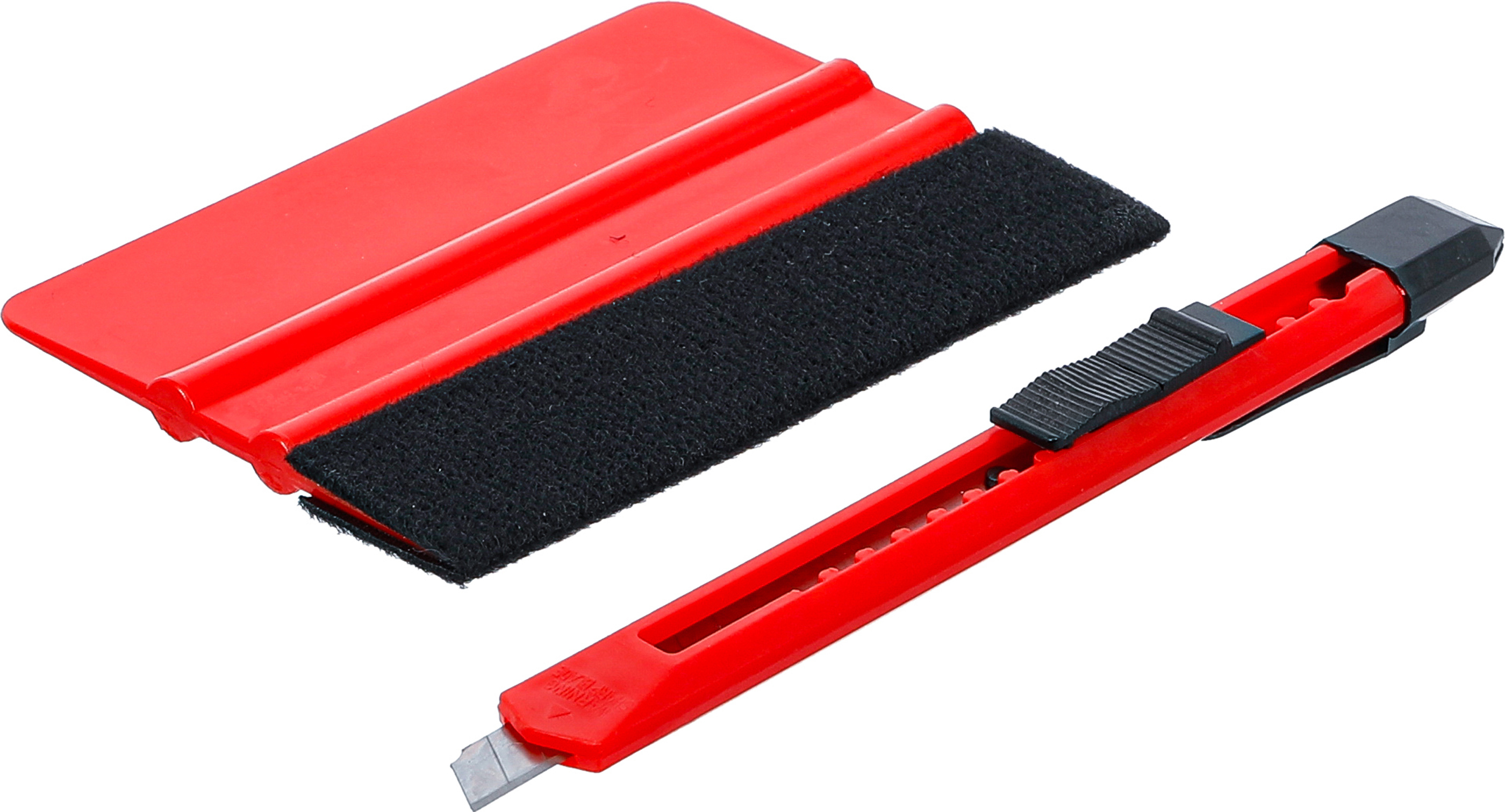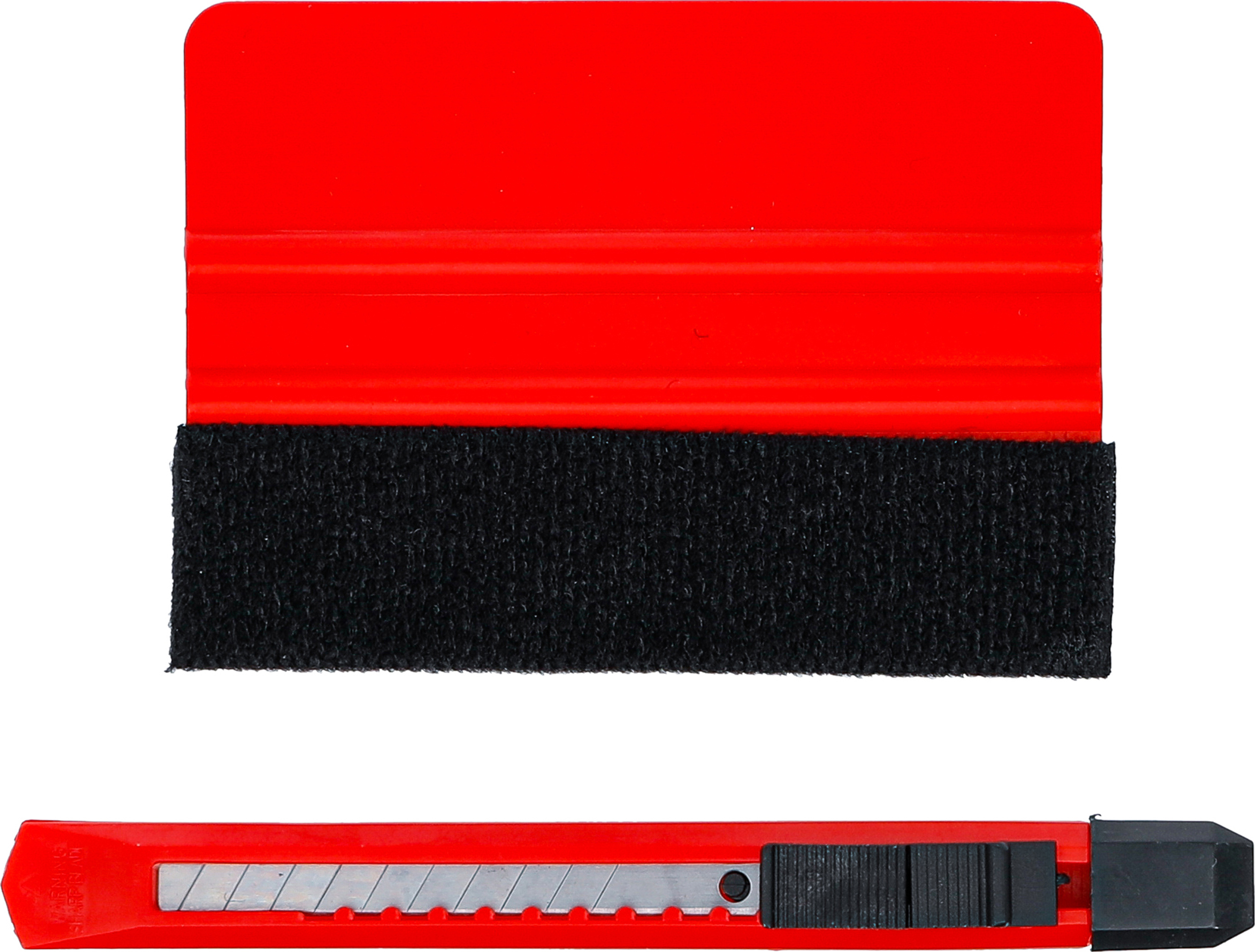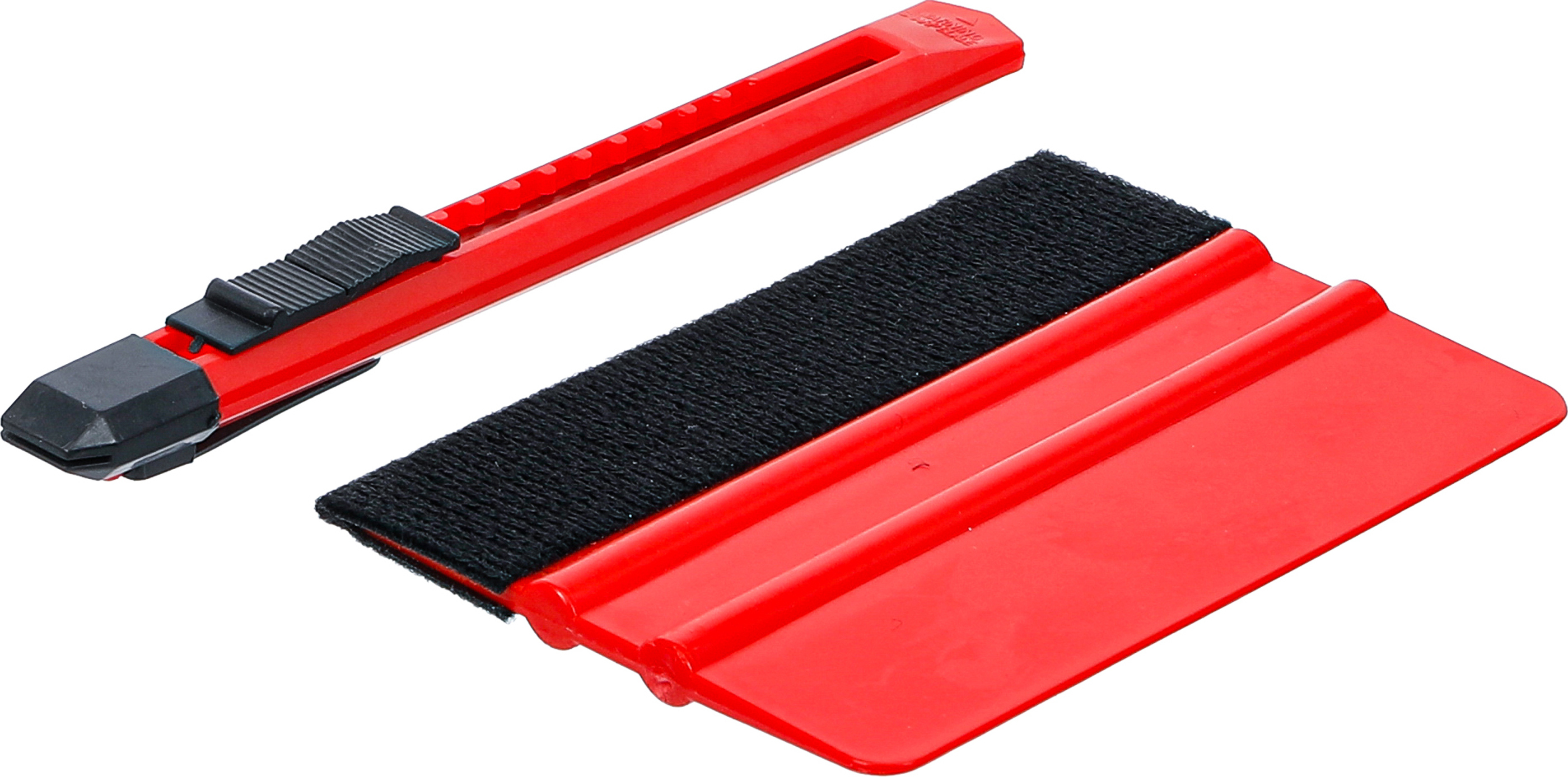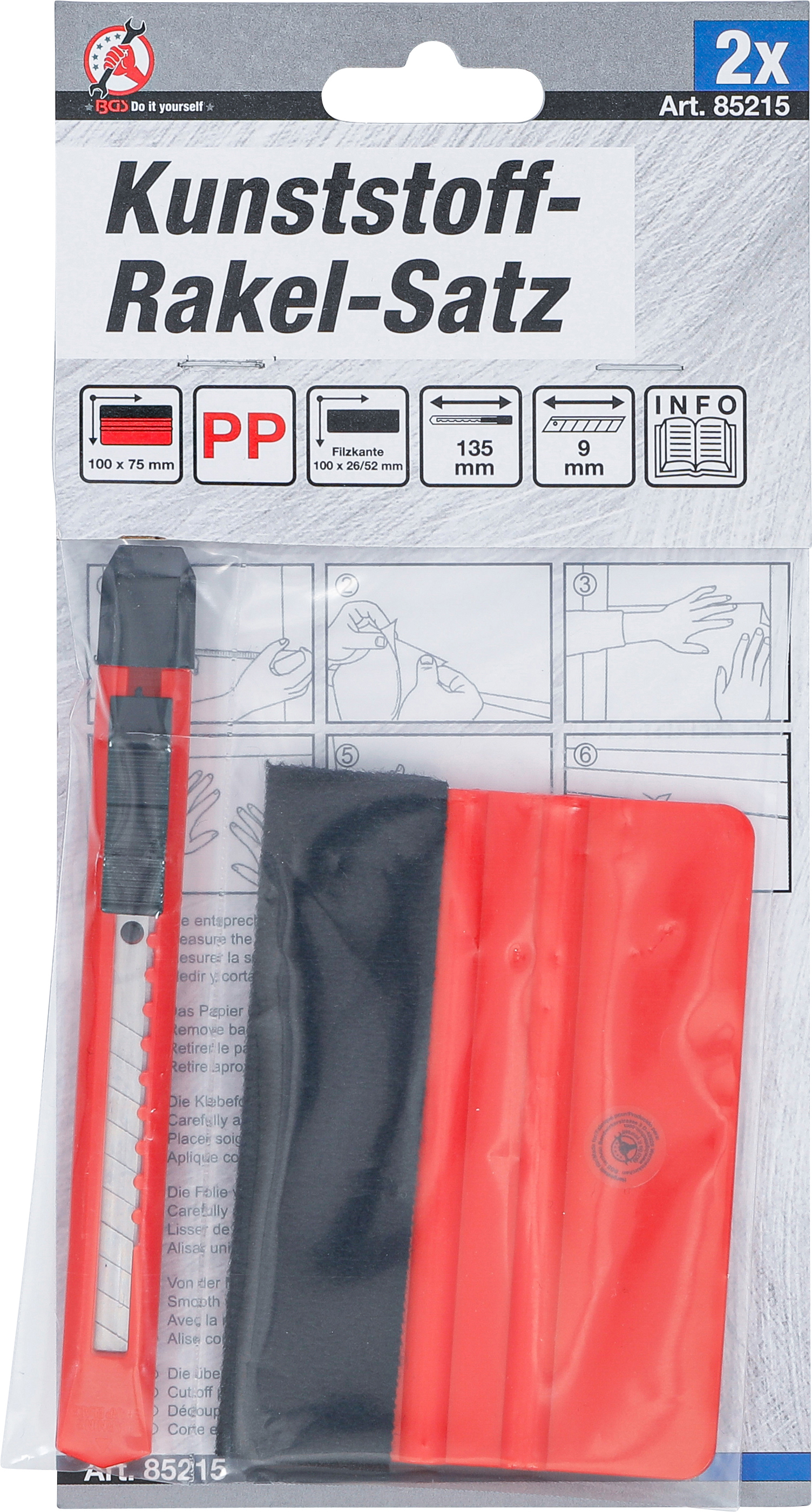 Das 2-teilige Kunststoff-Rakel-Set ist das perfekte Werkzeug für fachgerechte Folienarbeiten. Der Rakel wurde speziell entwickelt, um Ihnen präzises und blasenfreies Arbeiten bei der Folierung zu ermöglichen. Ob Fahrzeugfolierung, Glasverkleidung, Fensterfolie, Tönungsfolie oder Lackschutzfolie – mit diesem Set erzielen Sie professionelle Ergebnisse. Gefertigt ist der Rakel aus widerstandsfähigem Polypropylen (PP) mit einer Länge von 100 mm und einer Breite von 75 mm. Die harte Kunststoffkante eignet sich hervorragend zum Aufbringen robuster Klebefolien, während die weiche Filzkante (100 x 26/52 mm) empfindliche Untergründe schützt und ein kratzfreies Ausstreichen von Luftblasen ermöglicht. Das geringe Gewicht von nur 57,2 g sorgt für eine komfortable Handhabung. Zusätzlich kann die Verpackung bequem als Wandaufhängung genutzt werden – ideal zur ordentlichen Aufbewahrung Ihrer Folienwerkzeuge.