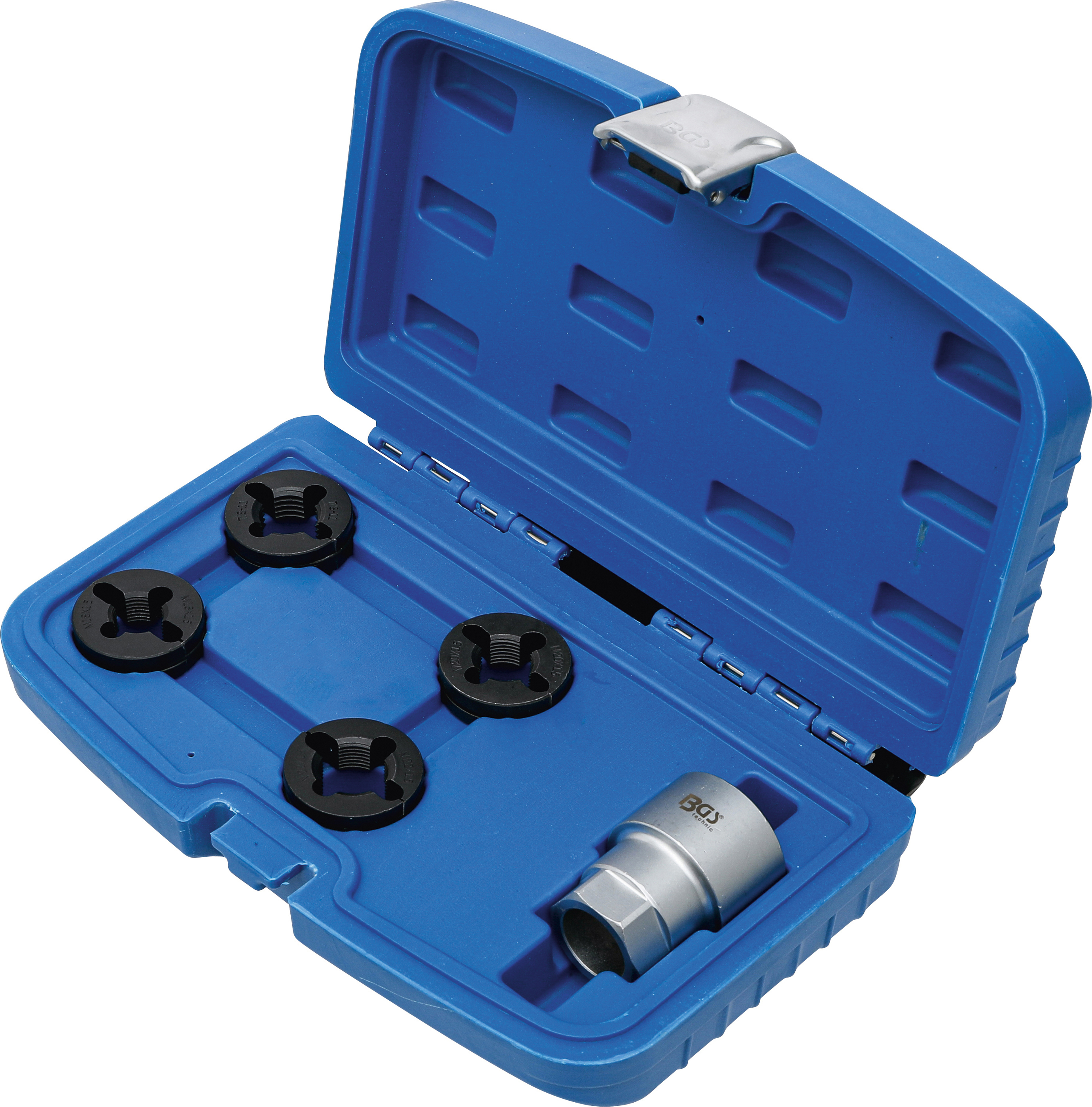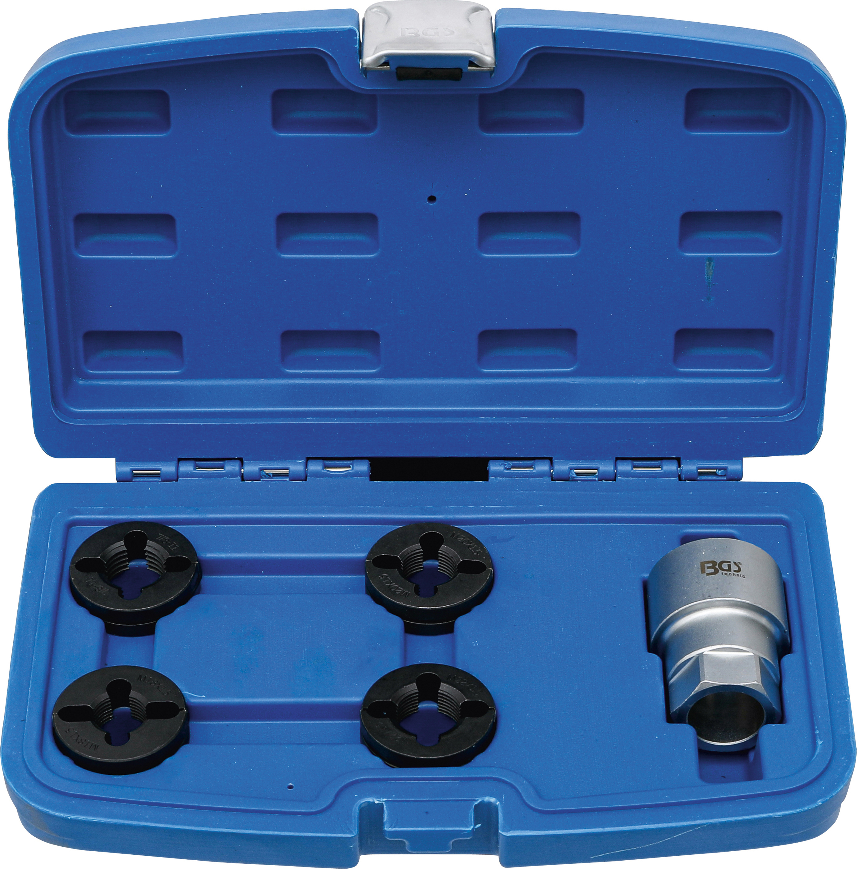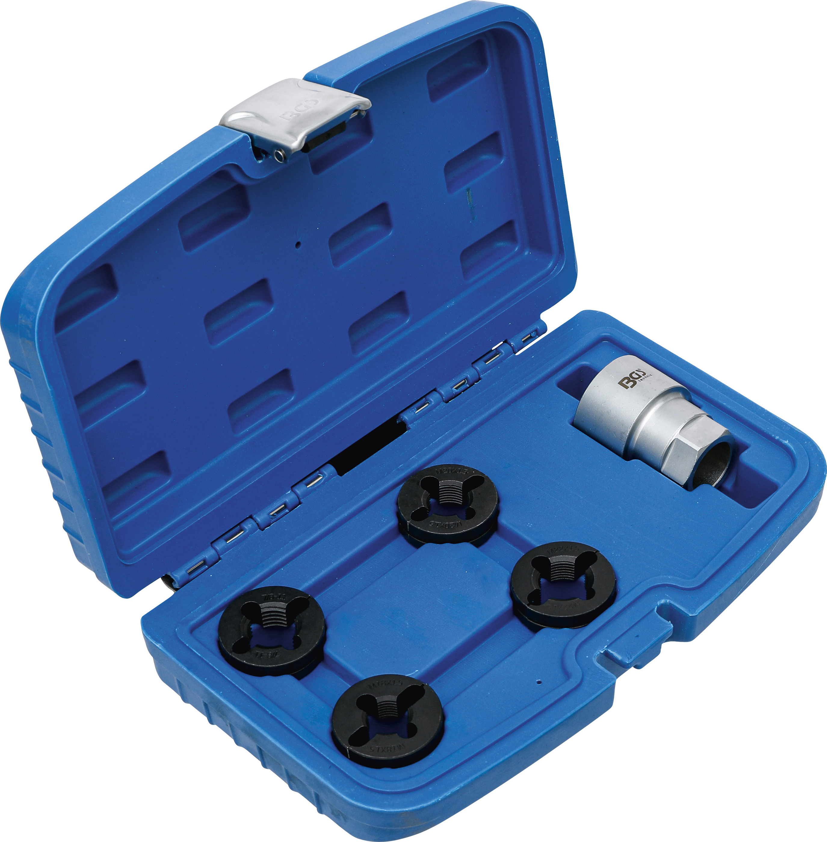 Dieser hochwertige Gewinde-Reparatursatz ist ideal zum Nachschneiden beschädigter oder stark verrosteter Radbolzengewinde geeignet. Hergestellt aus robustem Chrom-Vanadium-Stahl bietet das Werkzeug eine langlebige und zuverlässige Lösung zur professionellen Instandsetzung von LKW-Radbolzen. Durch die vier geteilten Schneideisen lassen sich Gewinde präzise und sauber wiederherstellen. Der mitgelieferte Adapter mit 32 mm Außensechskant ermöglicht eine einfache Handhabung bei der Anwendung in Werkstatt und Reparaturumfeld.