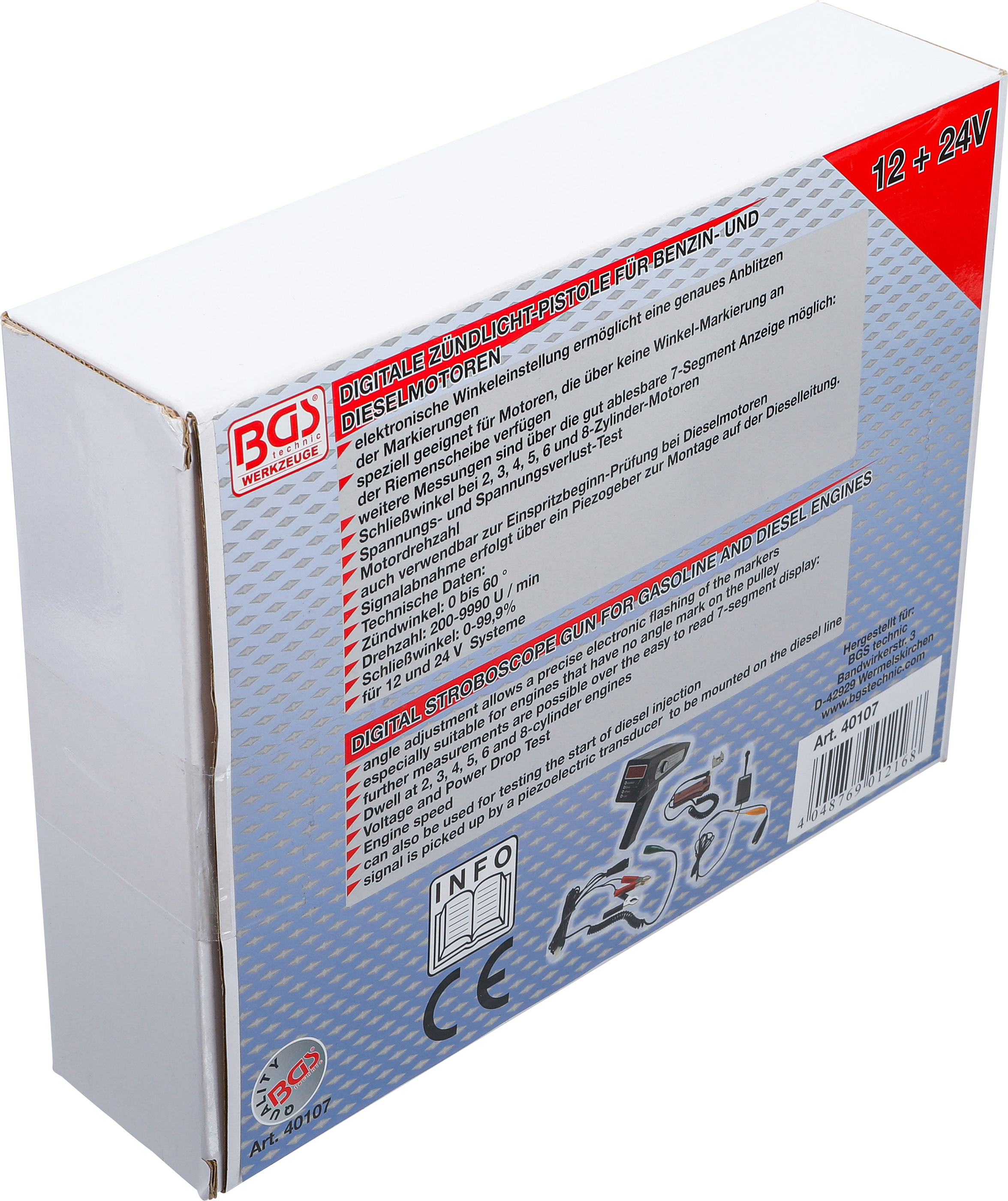 Die digitale Zündlicht-Pistole von BGS überzeugt durch präzise Messungen und eine intuitive Handhabung. Dank der elektronischen Winkeleinstellung können Sie Markierungen exakt anblitzen und den Zündzeitpunkt präzise justieren. Das Gerät ist besonders geeignet für Motoren, die keine Winkel-Markierung an der Riemenscheibe besitzen. Über die gut ablesbare 7-Segment-Anzeige lassen sich zusätzliche Messungen einfach durchführen, darunter Schließwinkel, Drehzahl sowie Spannungs- und Spannungsverlusttests. Auch für die Einspritzbeginn-Prüfung bei Dieselmotoren ist dieses Werkzeug bestens geeignet. Die Signalabnahme erfolgt über einen Piezogeber, der direkt an der Dieselleitung montiert wird. Das robuste Gerät arbeitet zuverlässig im Bereich von 0° bis 60° Zündwinkel und ist für Drehzahlen von 200 bis 9990 U/min ausgelegt. Die Spannungsversorgung erfolgt über das Bordnetz mit 12 V.