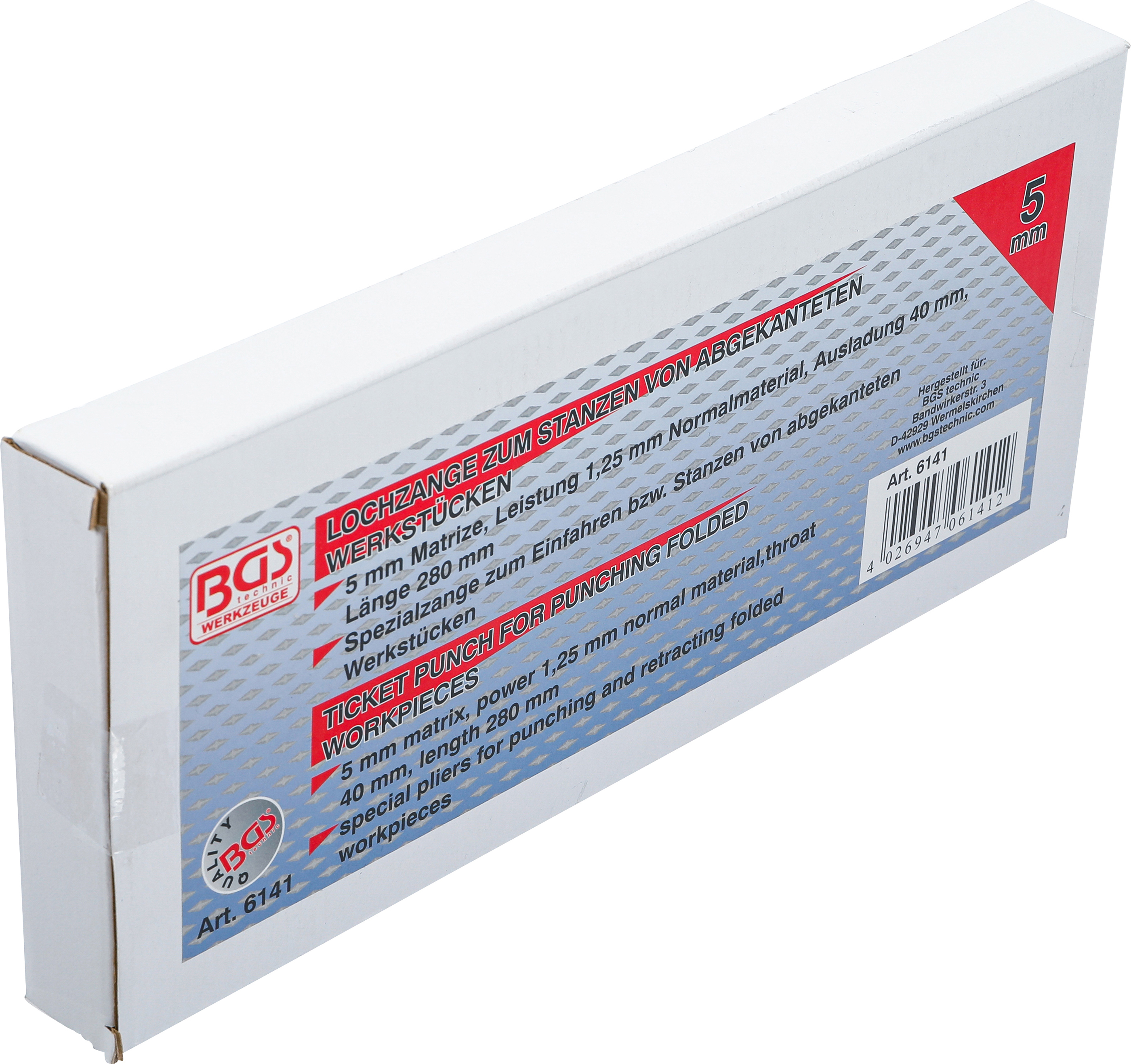 Die BGS Lochzange zum Stanzen von abgekanteten Werkstücken ist ein robustes und präzises Werkzeug, das speziell für den professionellen Einsatz in Werkstätten und bei Karosseriearbeiten entwickelt wurde. Mit ihrer selbstöffnenden Funktion ermöglicht sie ein schnelles, komfortables Arbeiten und sorgt für saubere Lochungen in Blechen mit einer Materialstärke von bis zu 1,25 mm. Dank ihrer 5 mm Matrize und einer Ausladung von 40 mm können Sie sowohl gerade als auch abgekantete Werkstücke mühelos bearbeiten. Die Spezialzange mit einer Gesamtlänge von 280 mm gewährleistet eine stabile Handhabung und langanhaltende Präzision.