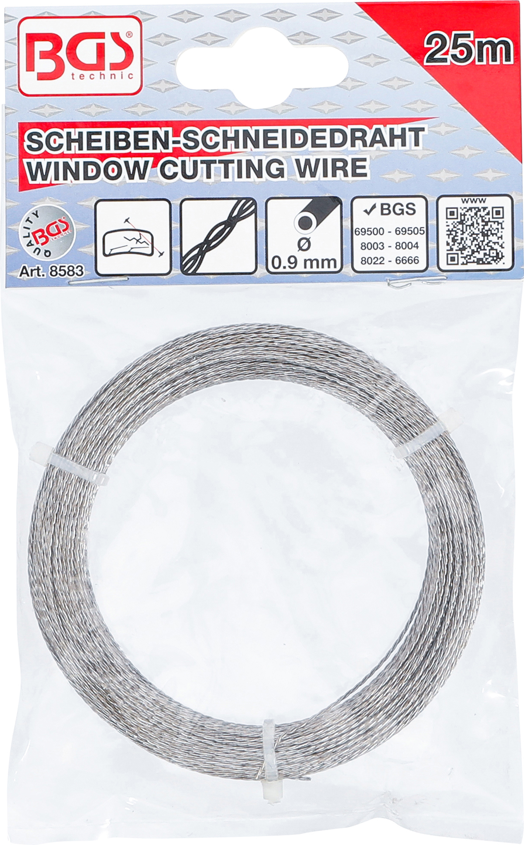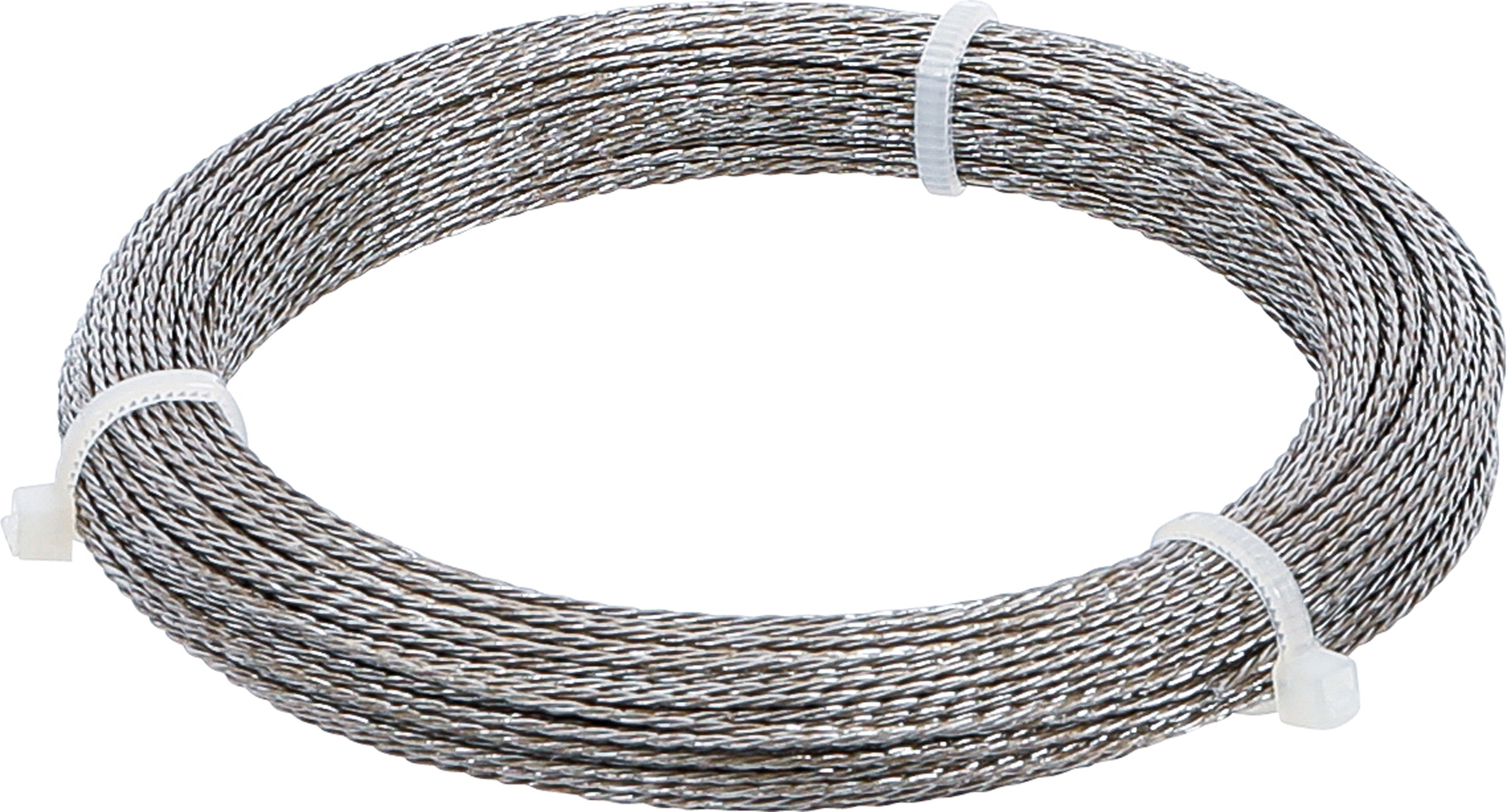 Der gezopfte Scheiben-Schneidedraht mit einer Länge von 25 m ist das ideale Werkzeug zum professionellen Ausschneiden von eingeklebten Fahrzeugscheiben. Er besteht aus drei geflochtenen Edelstahl-Einzeldrähten, die eine hohe Flexibilität und Reißfestigkeit gewährleisten. Durch seine robuste Konstruktion schneidet der Draht präzise und sicher durch Klebereste und Dichtmassen, ohne die Karosserie oder das Glas zu beschädigen. Der Schneidedraht eignet sich als passender Ersatz für Artikelnummern 6666, 69500, 69505, 8003, 8004 und 8022.