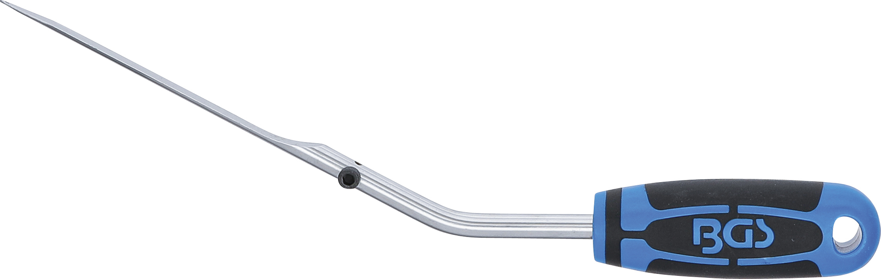 Der BGS Schneiddraht-Gegenhalter ist das ideale Werkzeug zum professionellen Ausglasen von Fahrzeugscheiben. Er dient zum sicheren Gegenhalten des Schneiddrahtes im Innenraum und ermöglicht dabei eine präzise und kontrollierte Arbeit, ohne die Verkleidung zu beschädigen. Dank seines langen, abgewinkelten Schafts gelangen Sie auch an schwer zugängliche Stellen, während das ergonomisch geformte Kunststoffgriffstück optimalen Halt und hohen Komfort bietet. Die Drahtklemmung erfolgt einfach und zuverlässig über eine integrierte Klemmschraube. Mit einer Klingenlänge von 130 mm ist dieses Werkzeug vielseitig einsetzbar und für alle geklebten Scheiben geeignet.